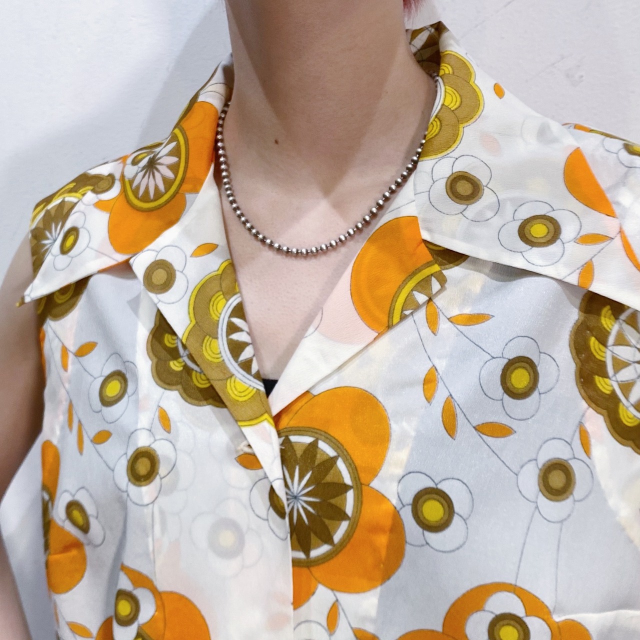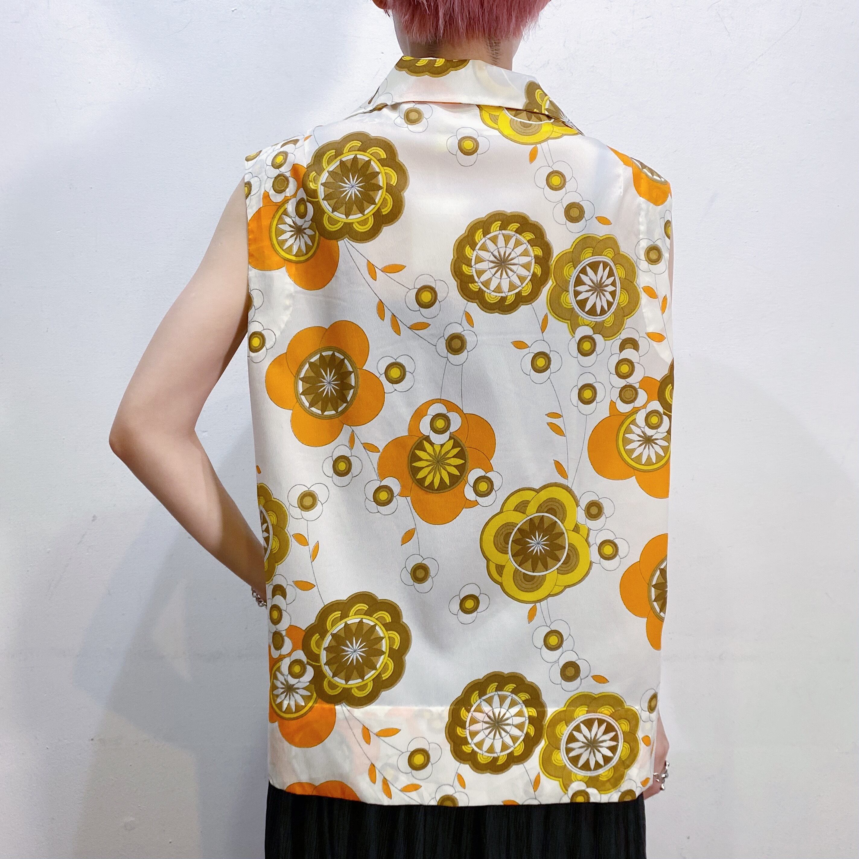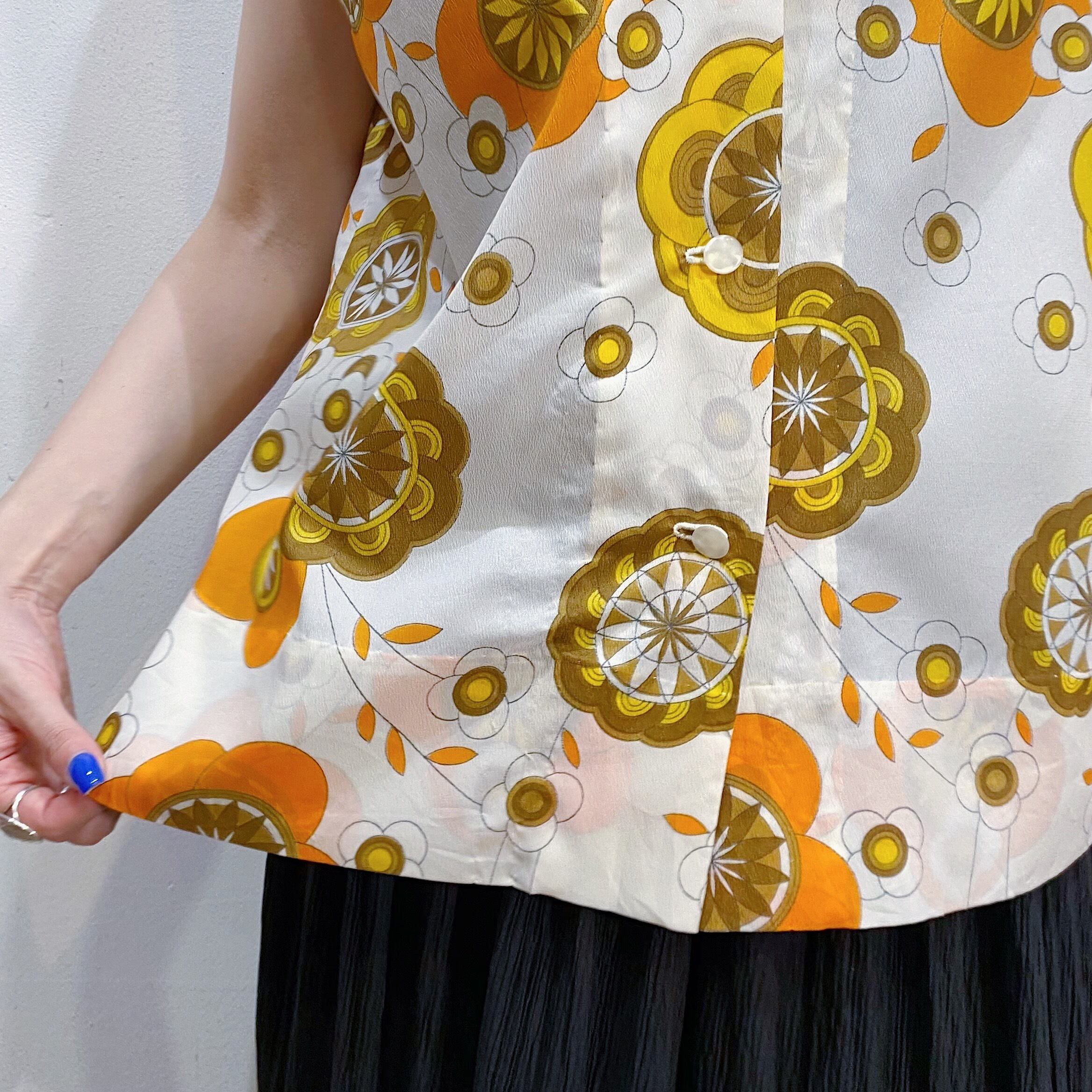 ホワイトベースにオレンジやイエローの花柄が可愛い、70年代のノースリーブシャツです。