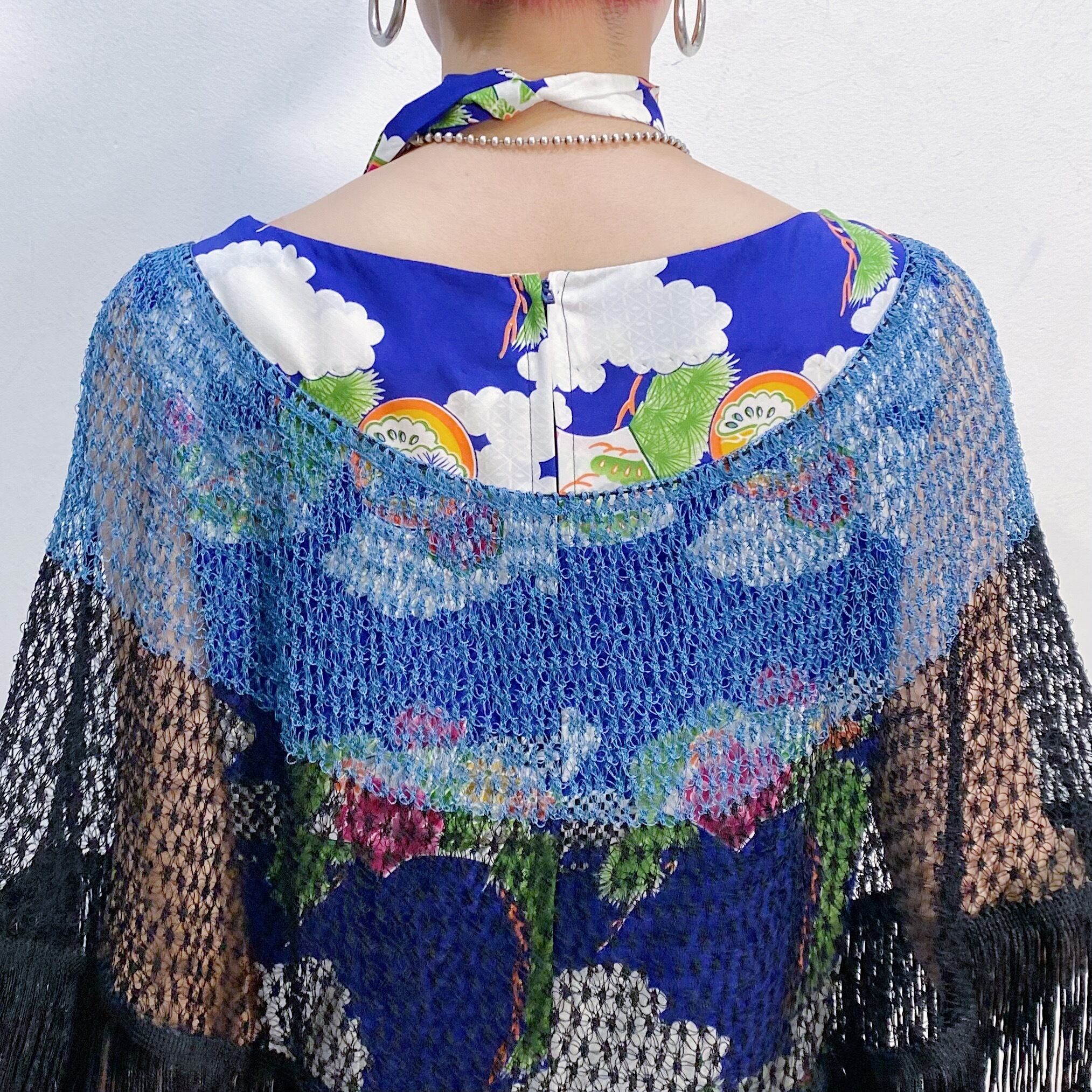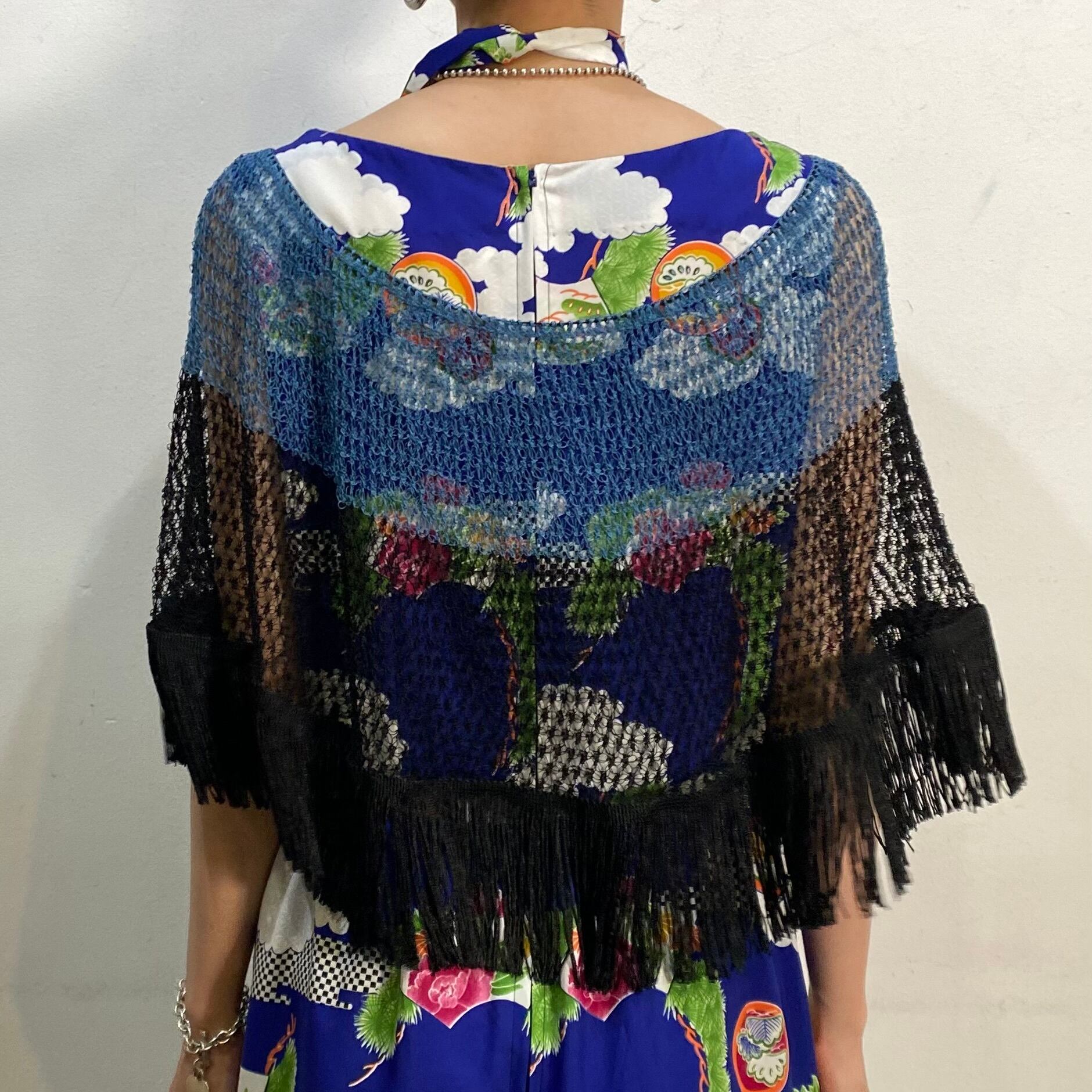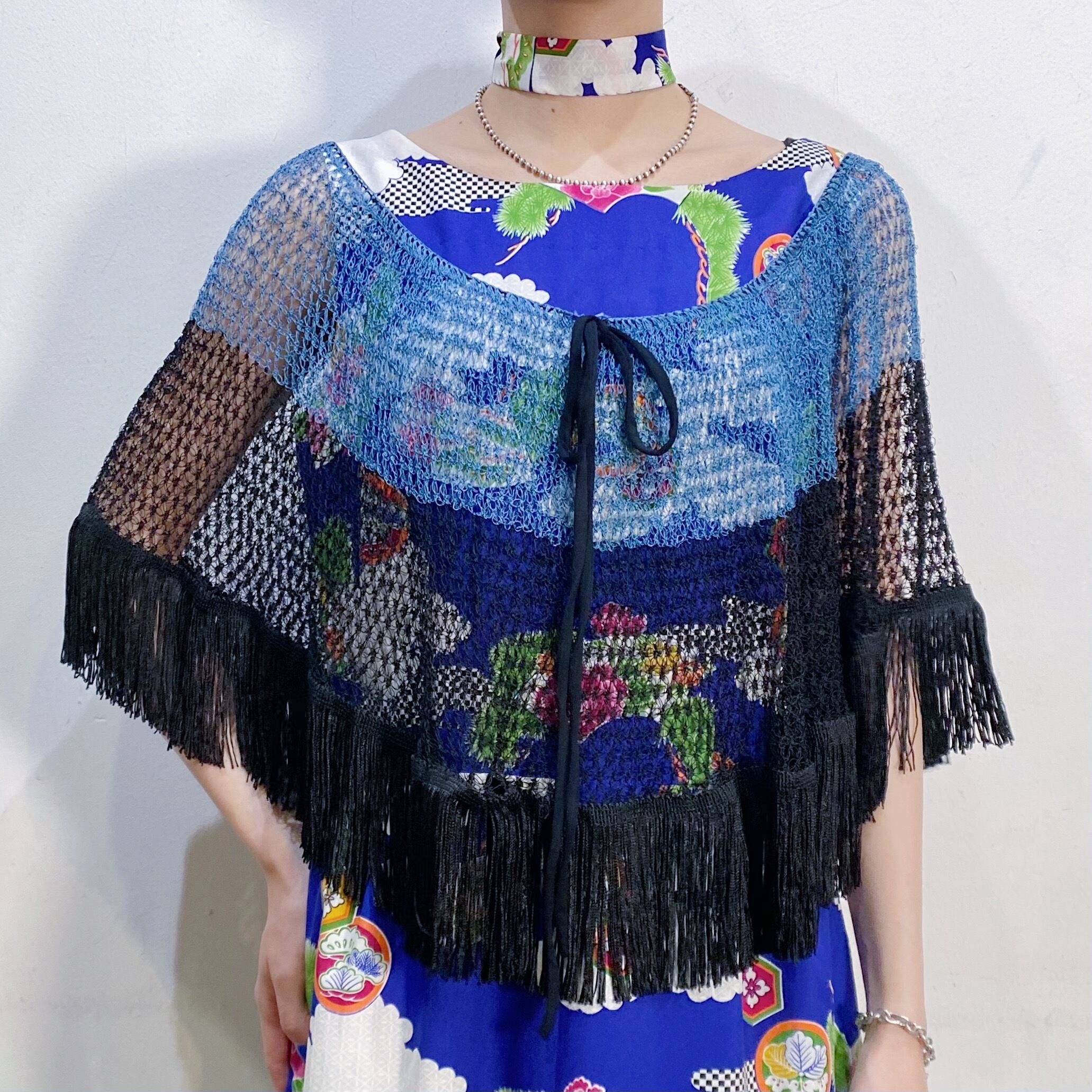 ブラックとブルーのバイカラーにフリンジが可愛い、クロシェポンチョです。