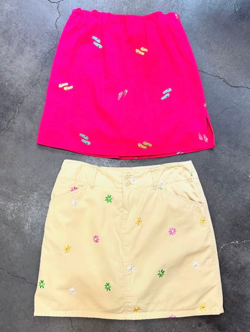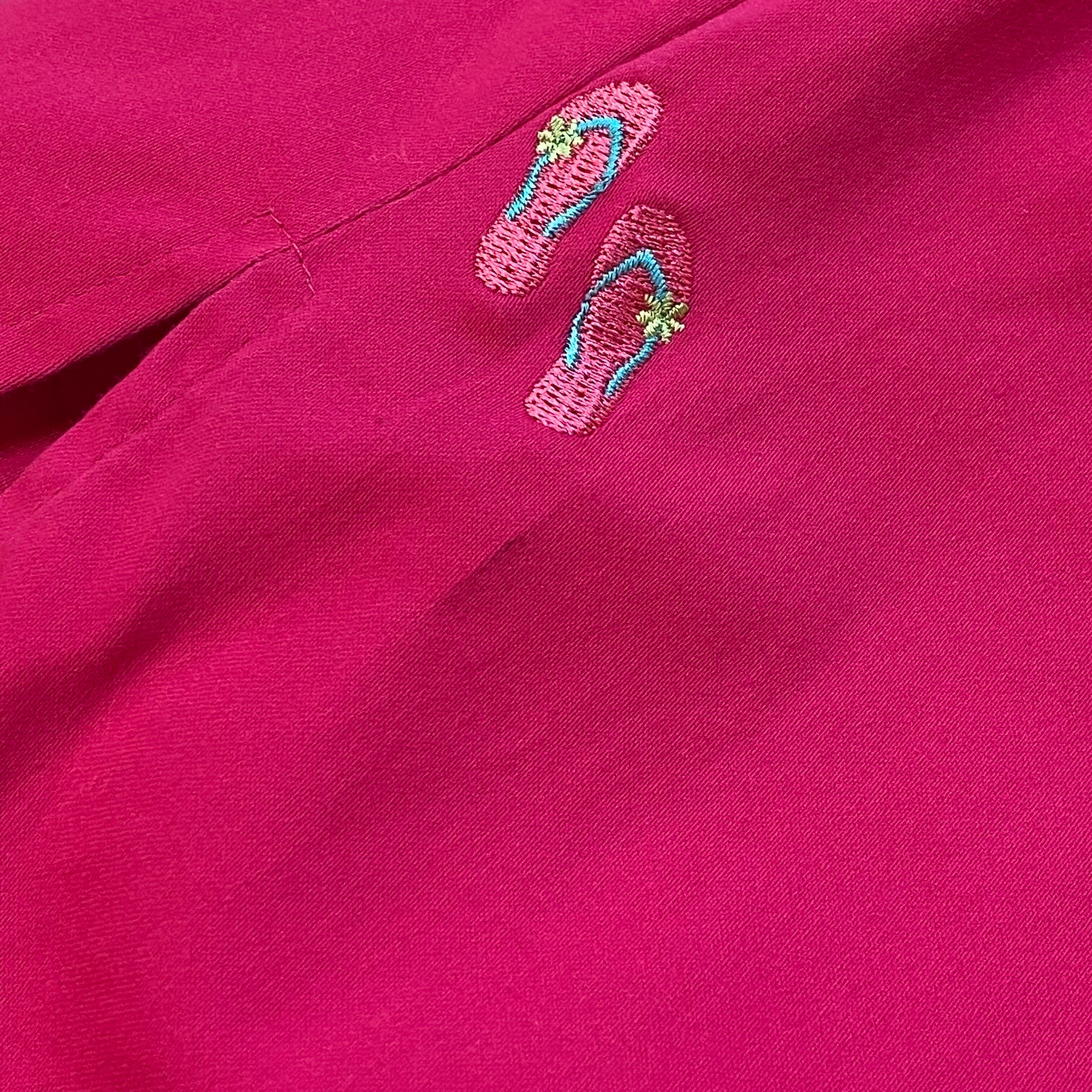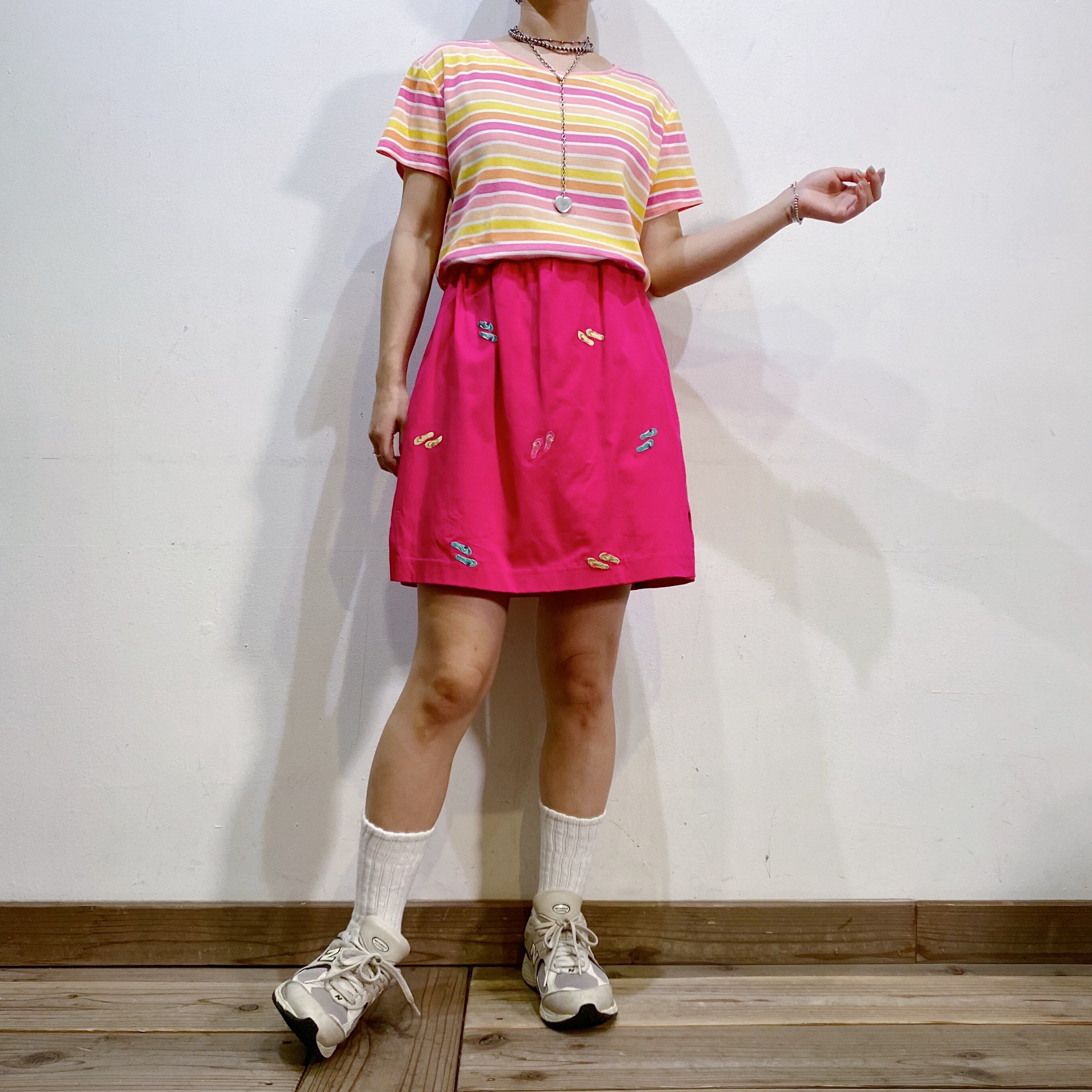 カラフルなビーチサンダルの刺繍がユニークで可愛い、キュロットです。