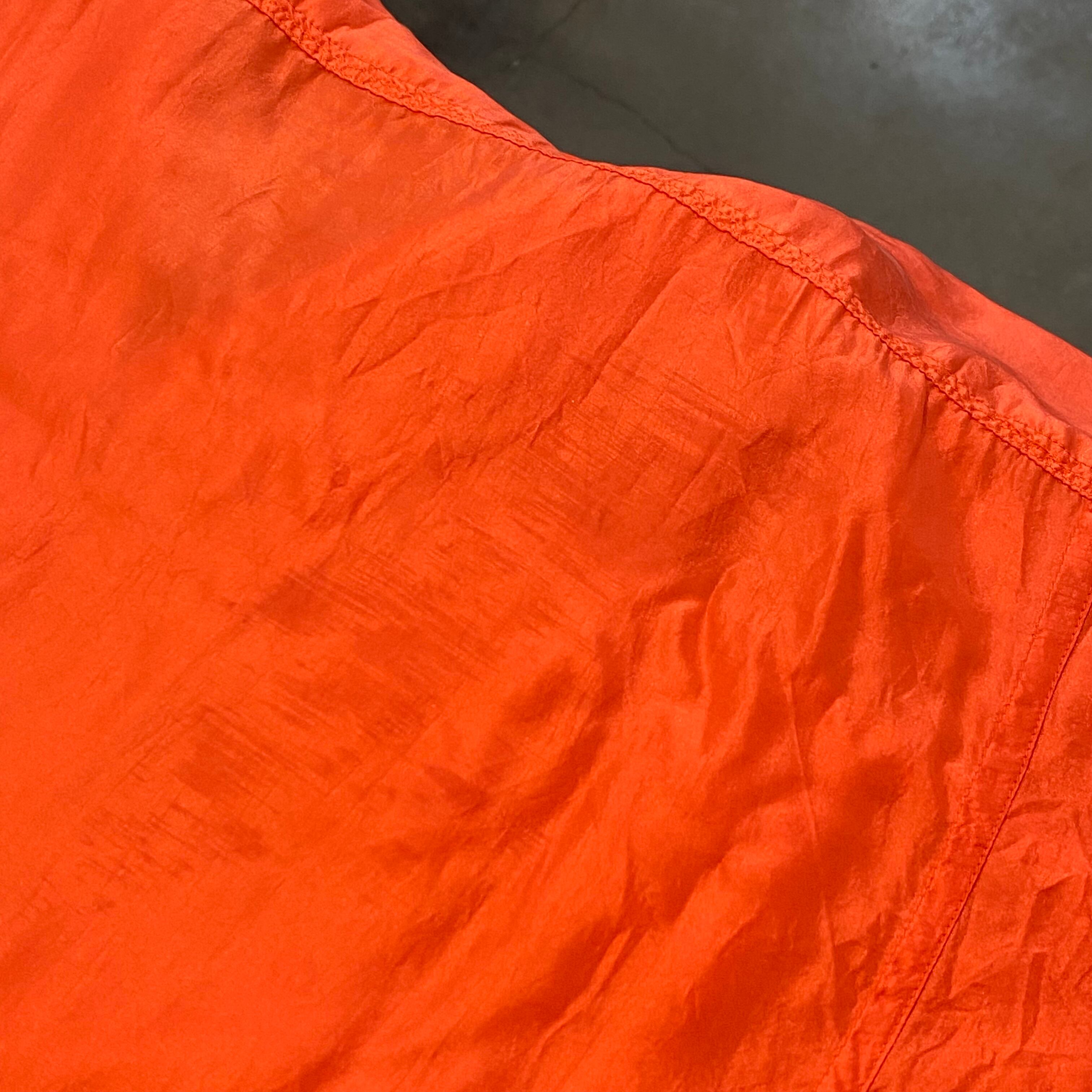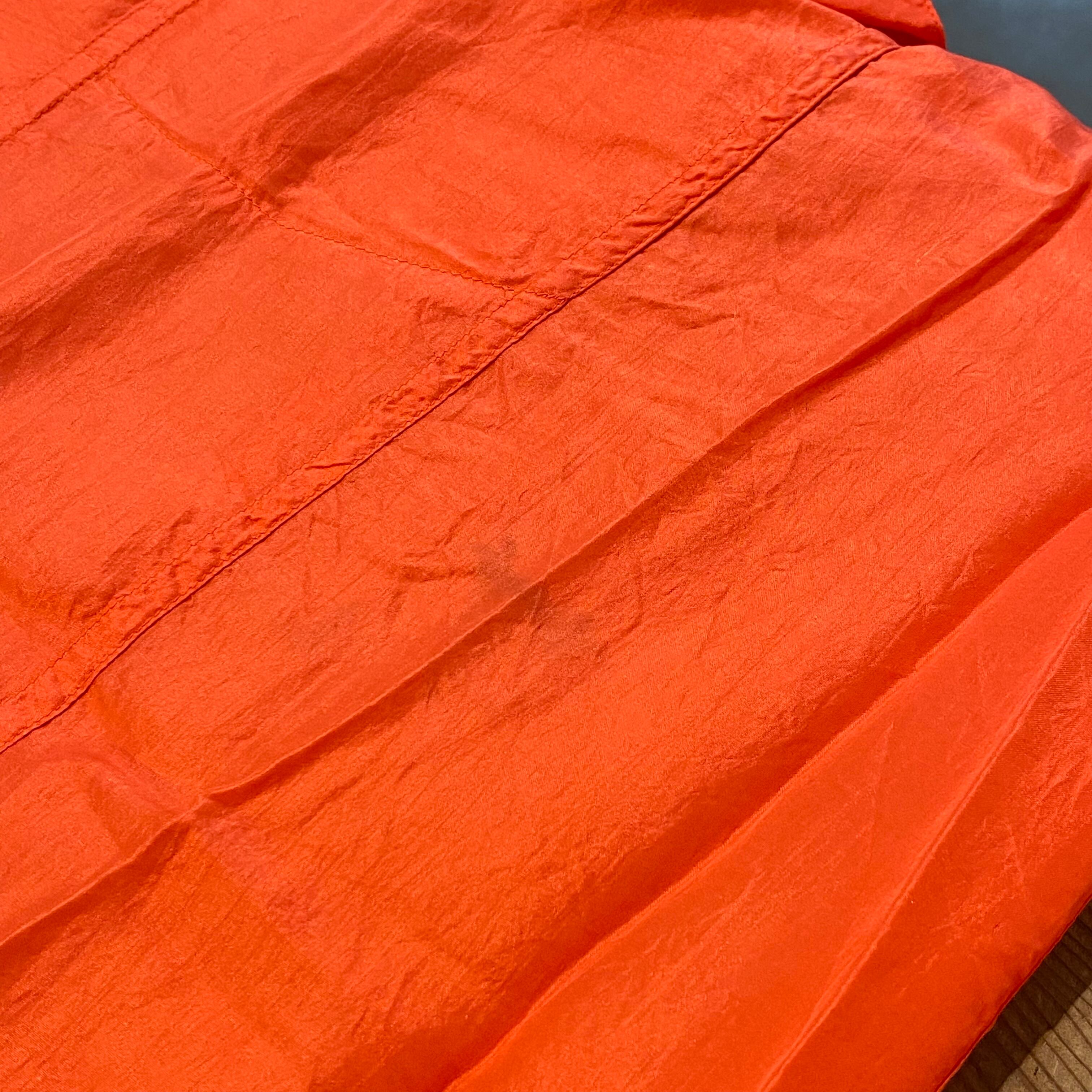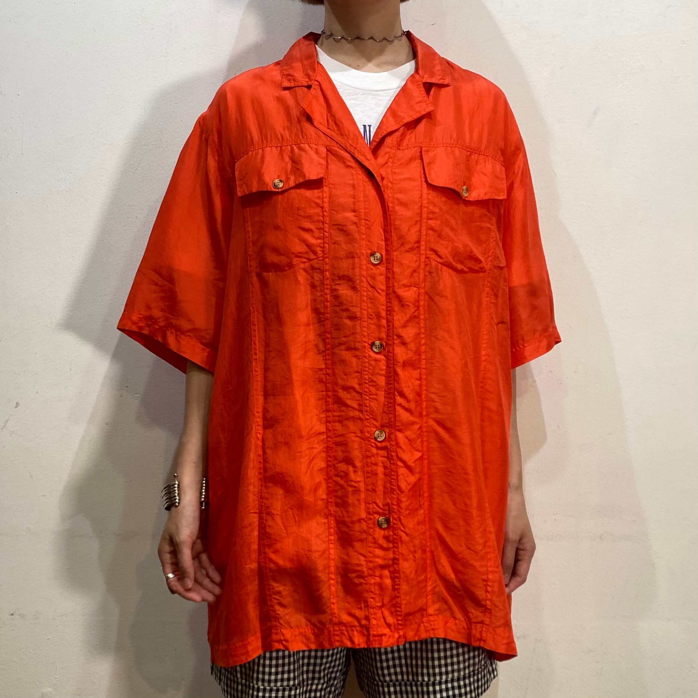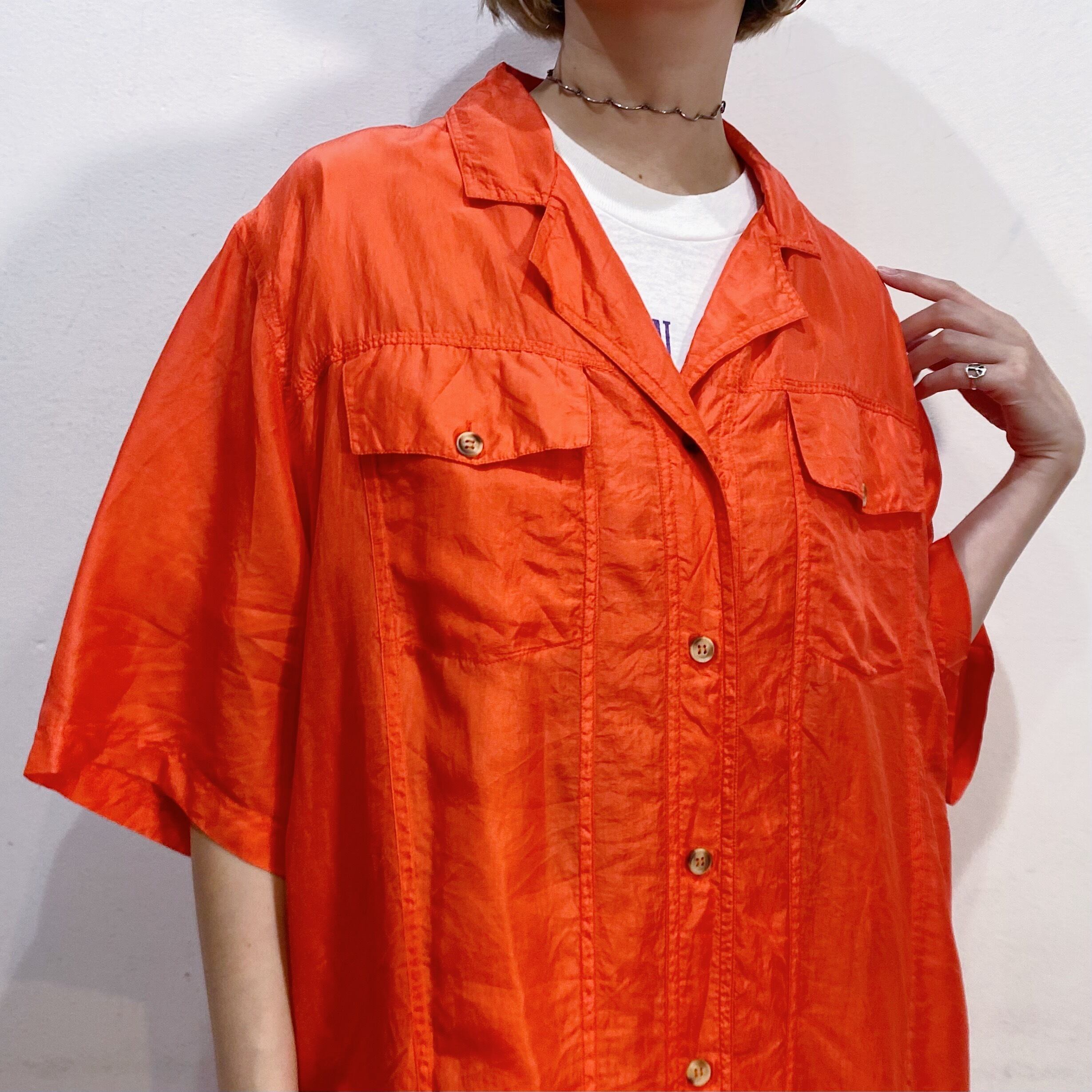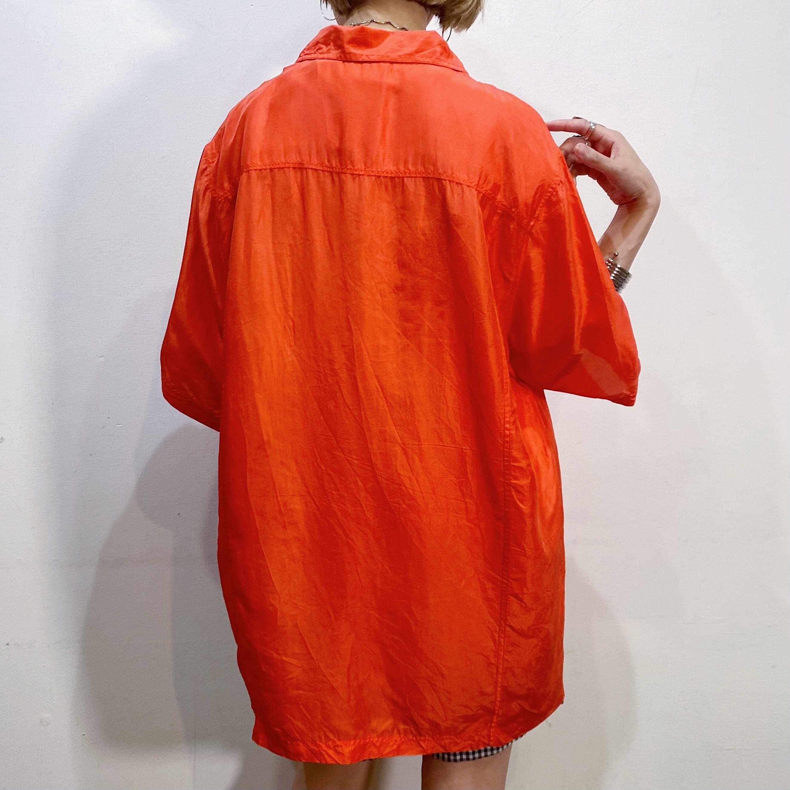 鮮やかなオレンジがパッと目を惹く、半袖のシルクシャツです。