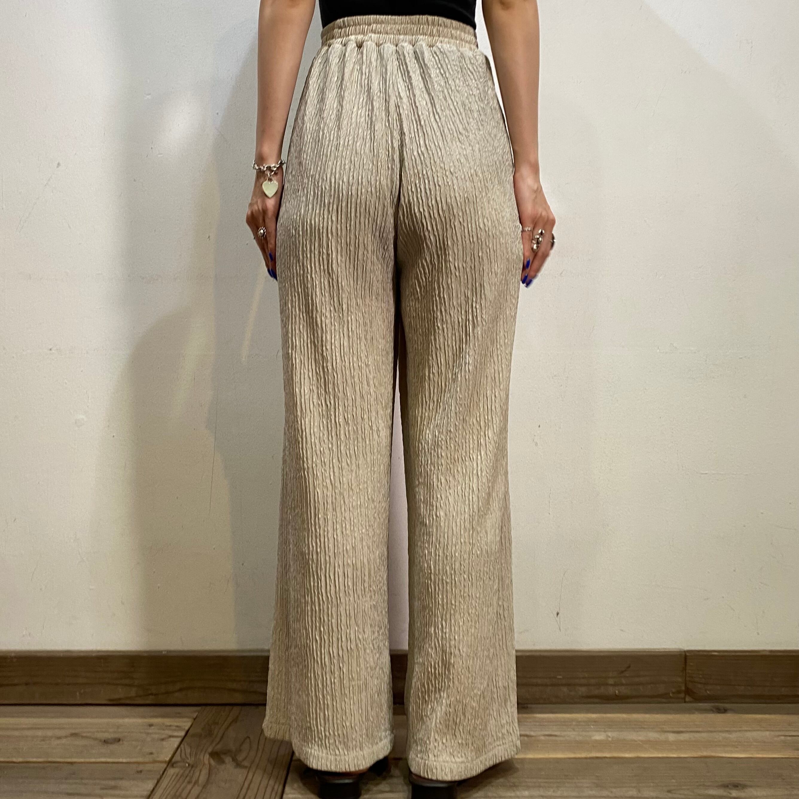 ぺージュカラーで使い勝手がよく、綺麗なワイドシルエットが魅力のイージーパンツです。