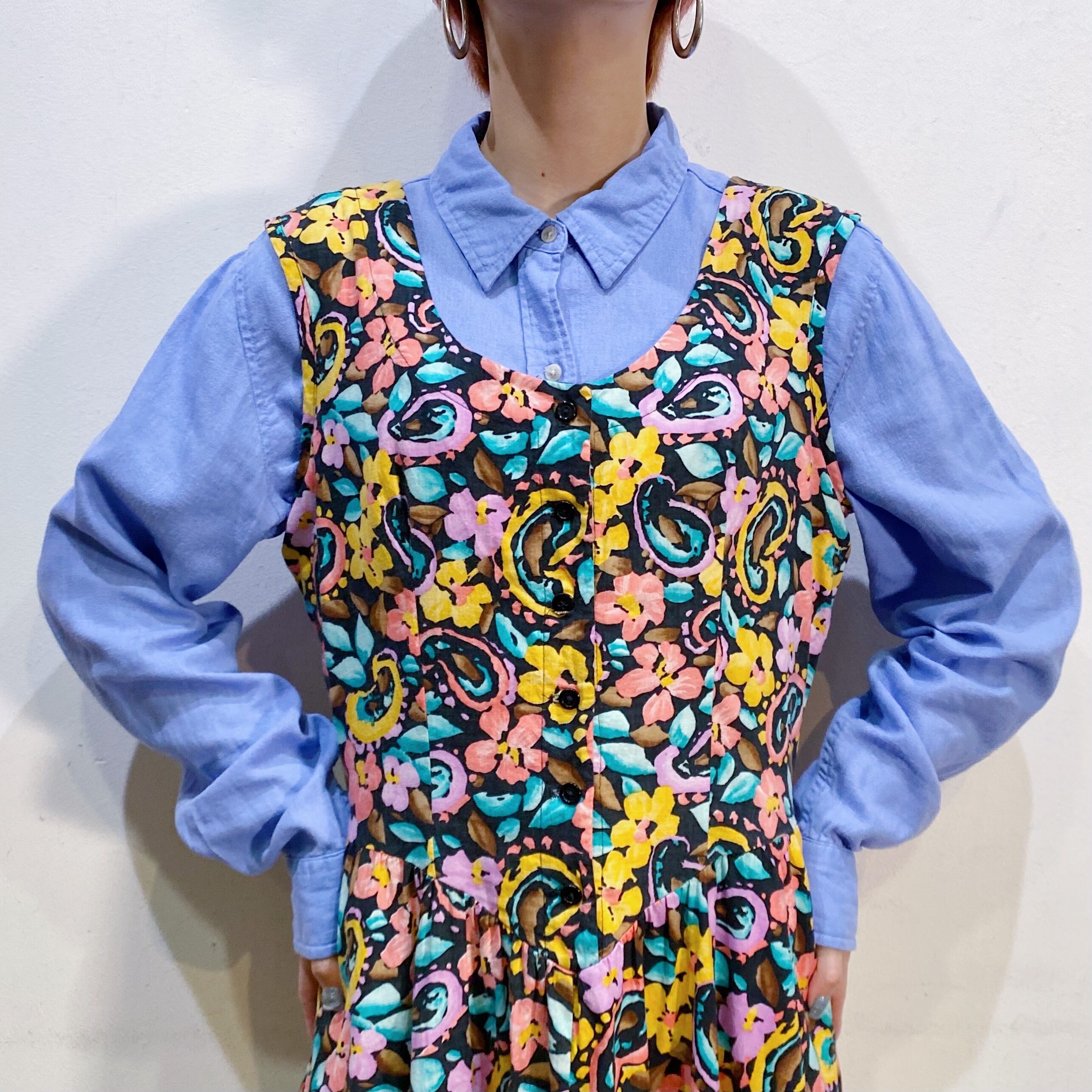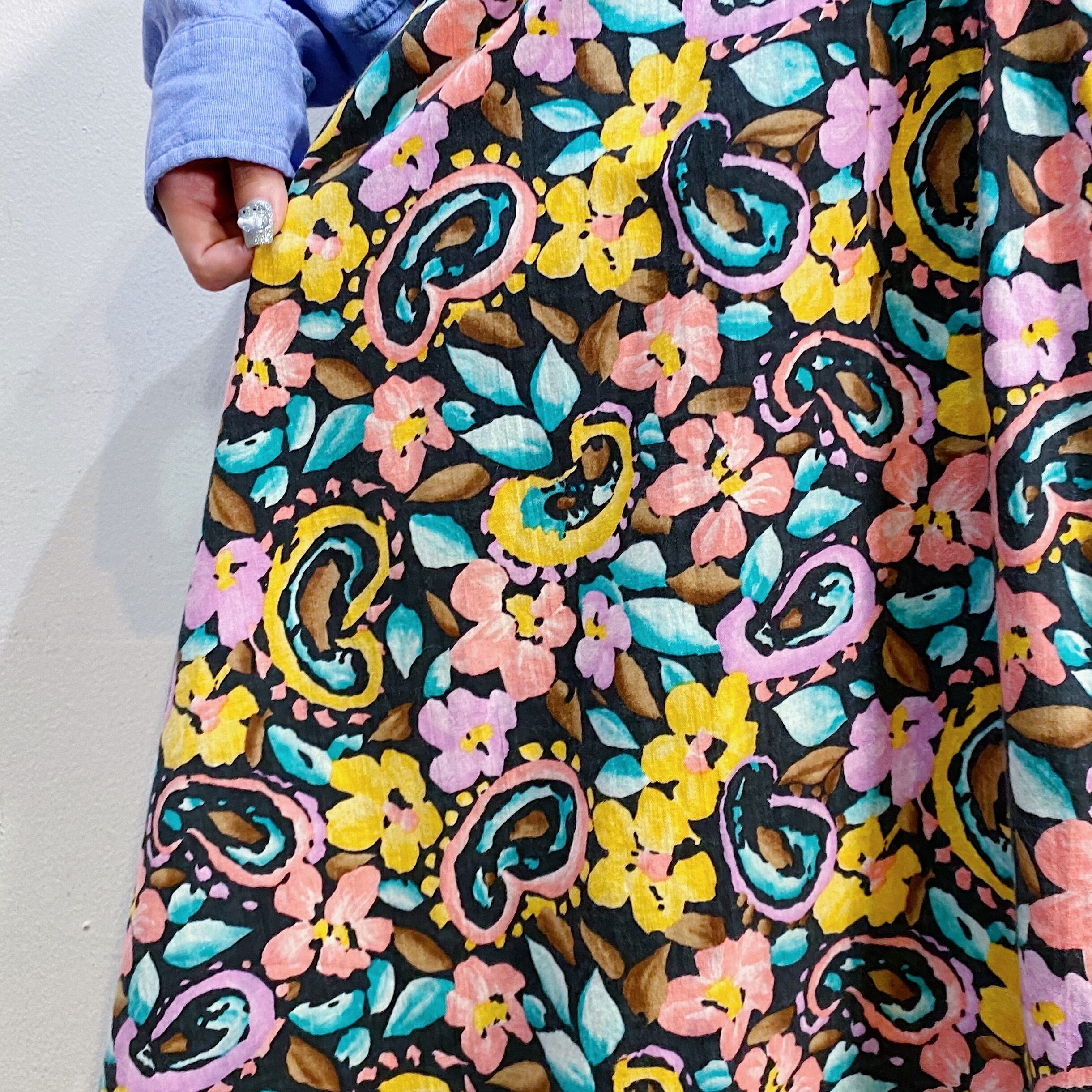 ブラックカラーに少しネオンな花柄が可愛い、80年代のノースリーブワンピースです。