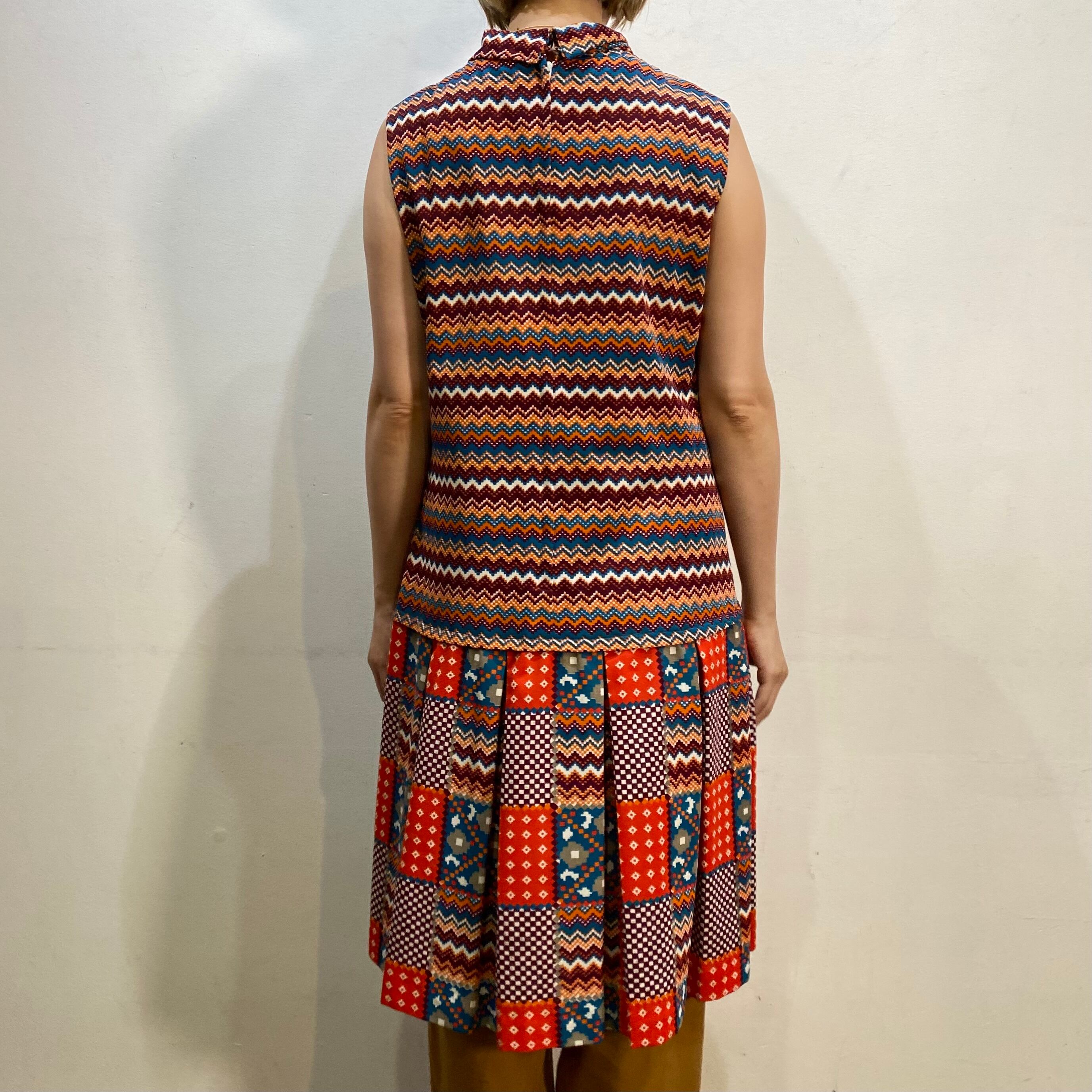 上はジグザグとした柄に下はパッチワークプリント柄の切り替えが可愛い、70年代のノースリーブワンピースです。