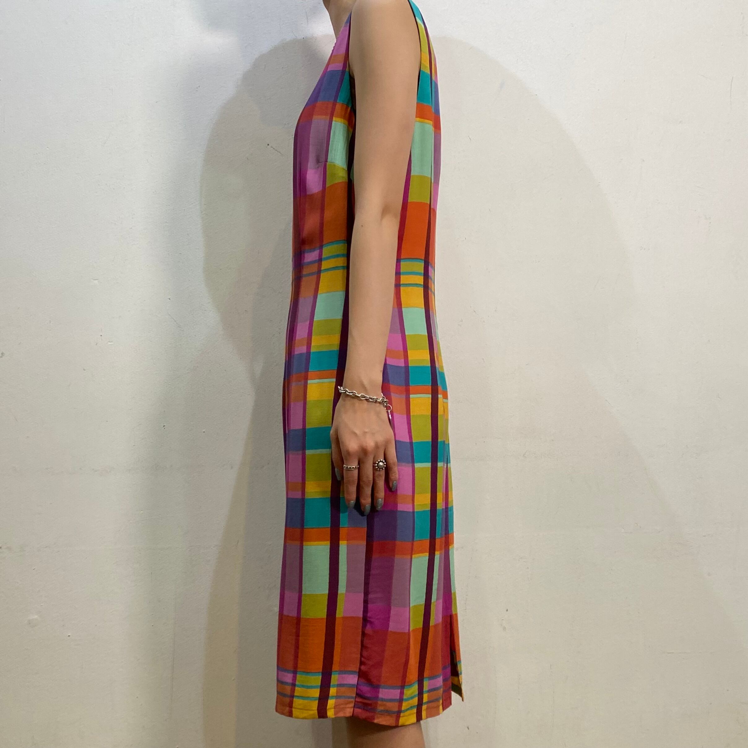 色合わせが可愛い、チェックのノースリーブワンピースです。