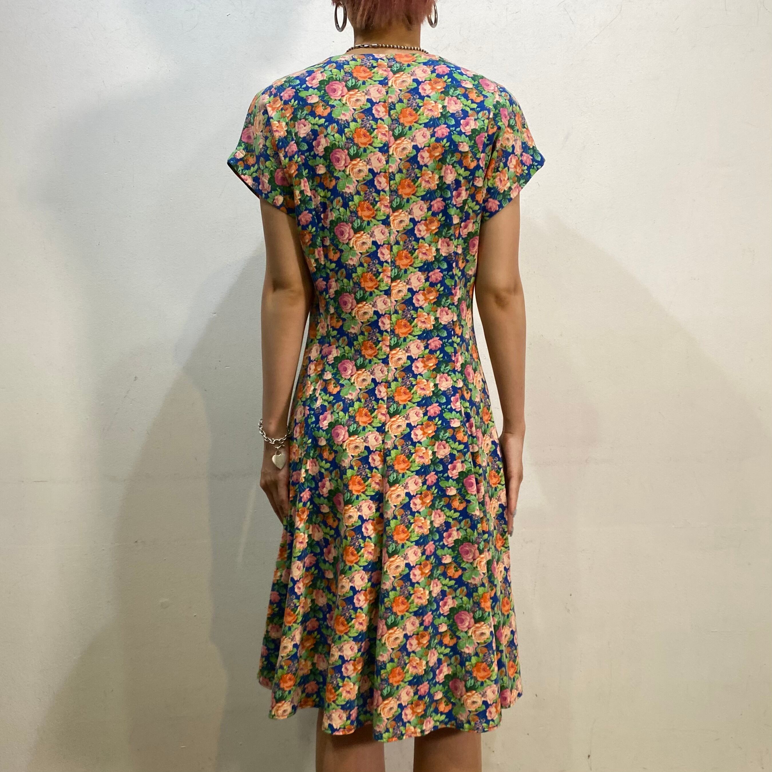 ブルーベースにピンクやオレンジの花柄が映える、80年代のミニワンピースです。