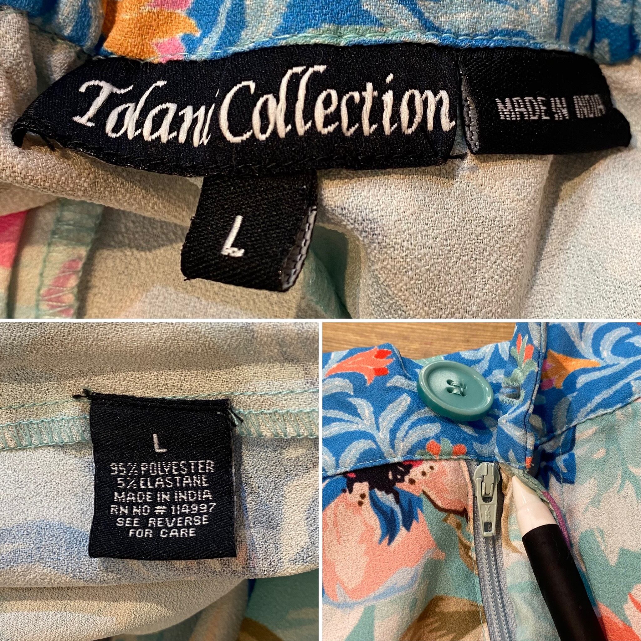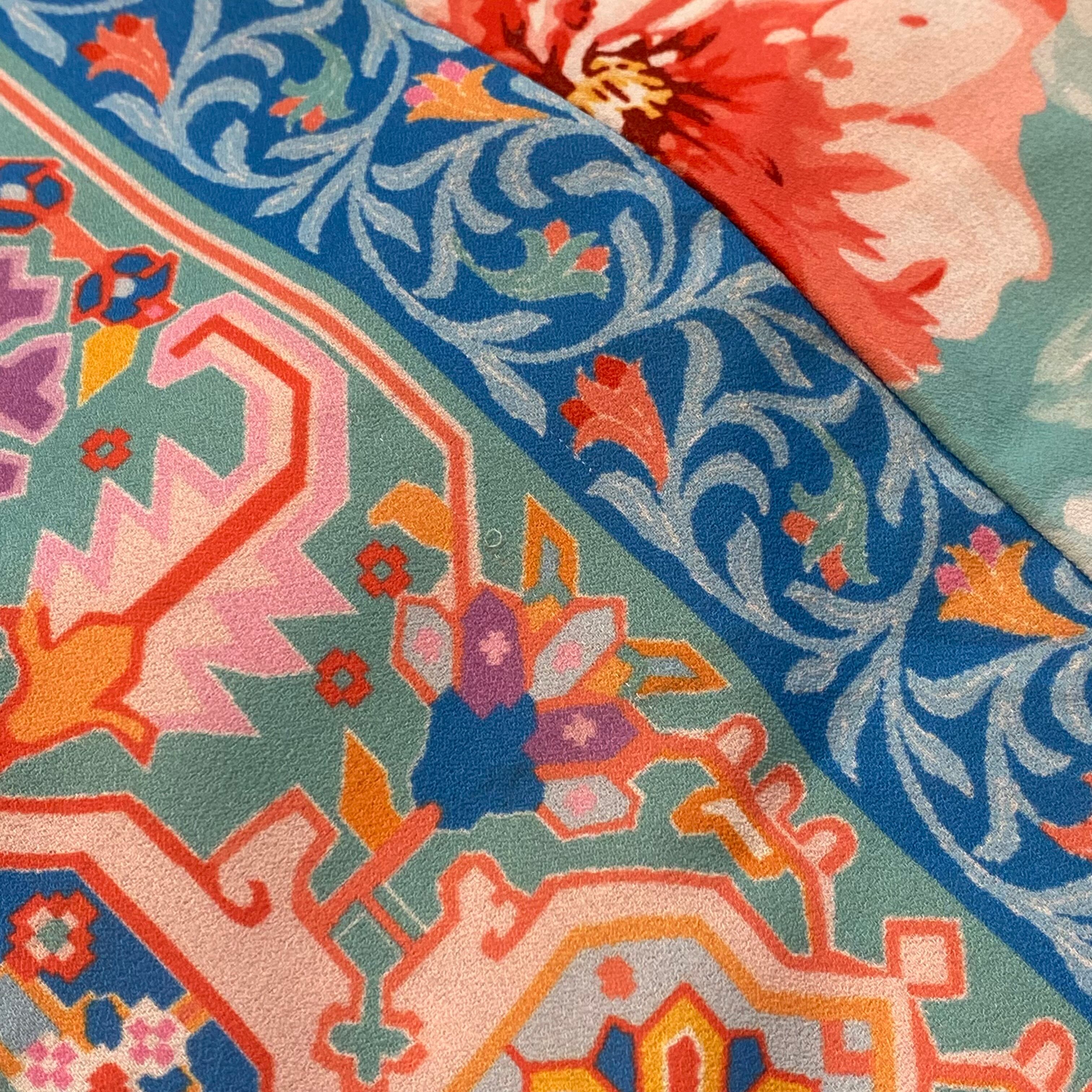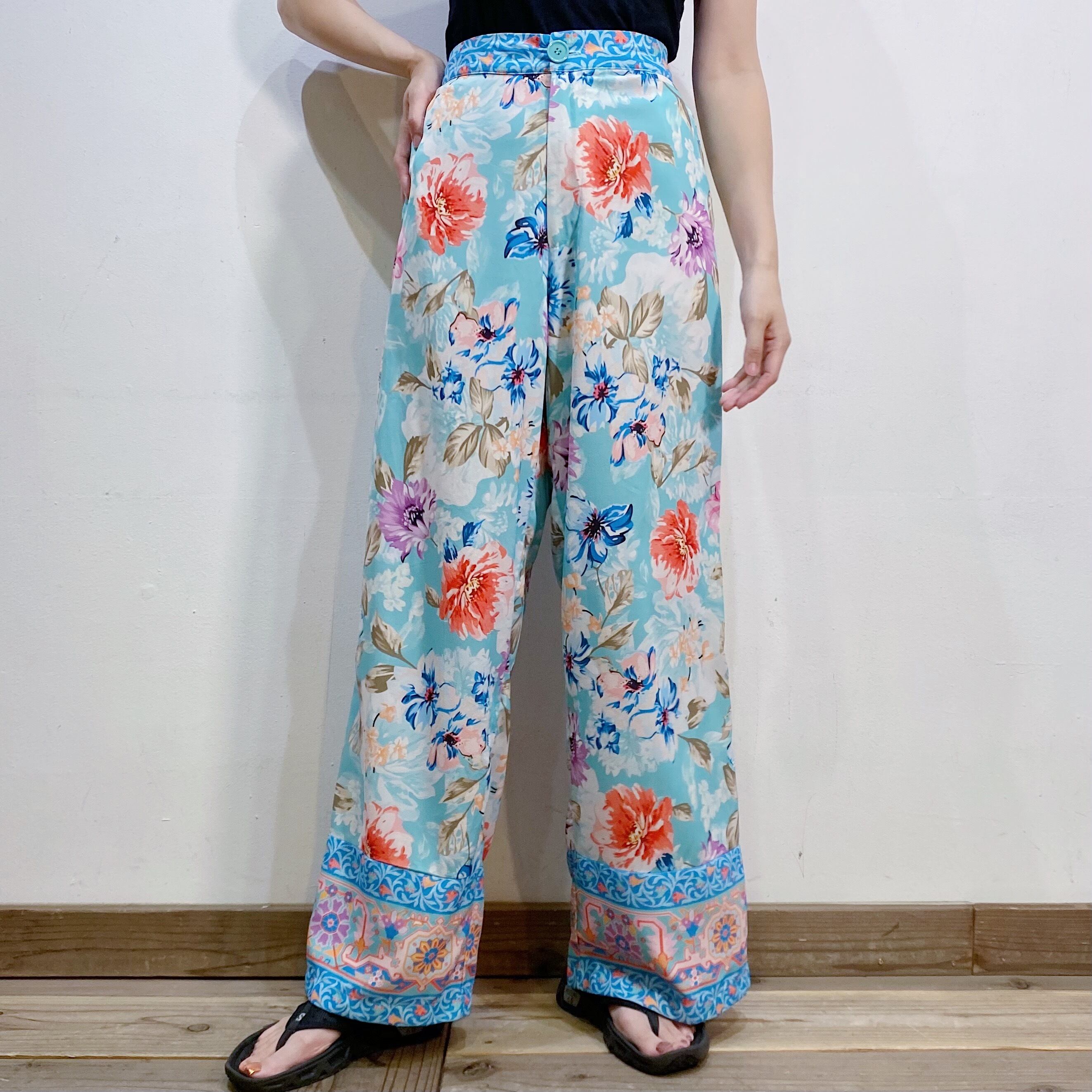 サックスブルーベースにカラフルな花柄が可愛い、ワイドパンツです。