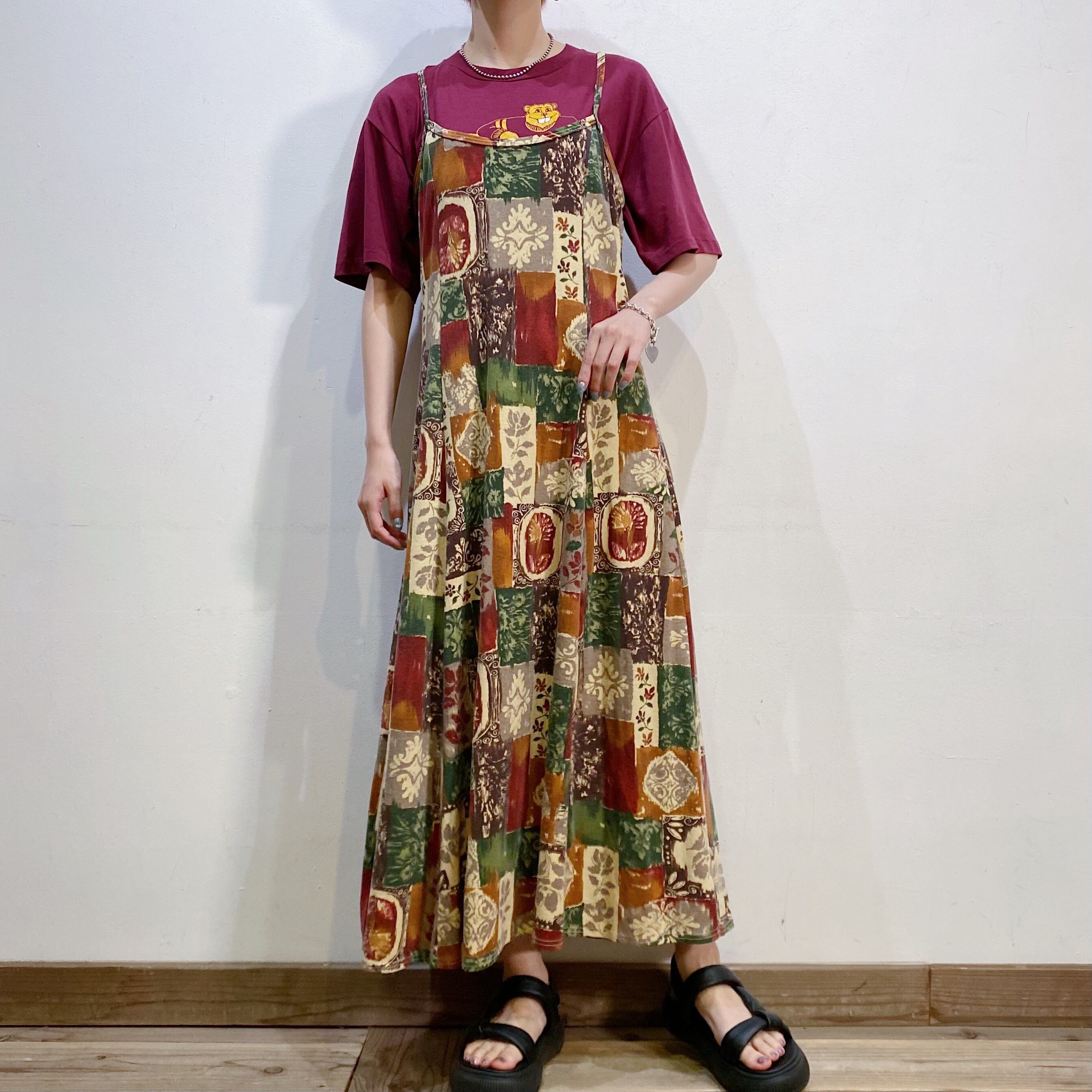 90sらしいパッチワークプリント柄が可愛いキャミワンピースです。