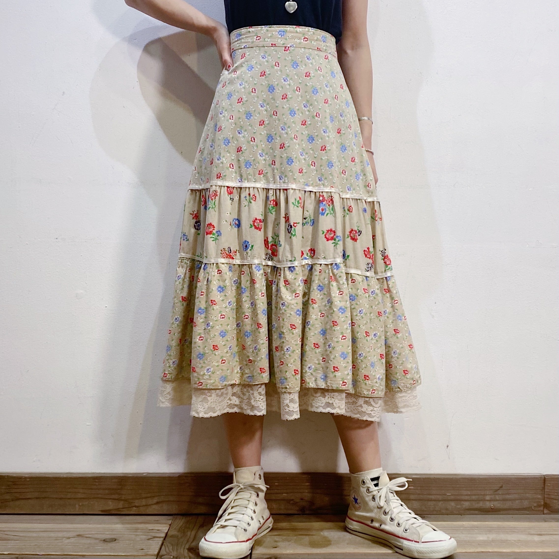 ベージュベースの花柄の切り替えが可愛い、70年代のスカートです。