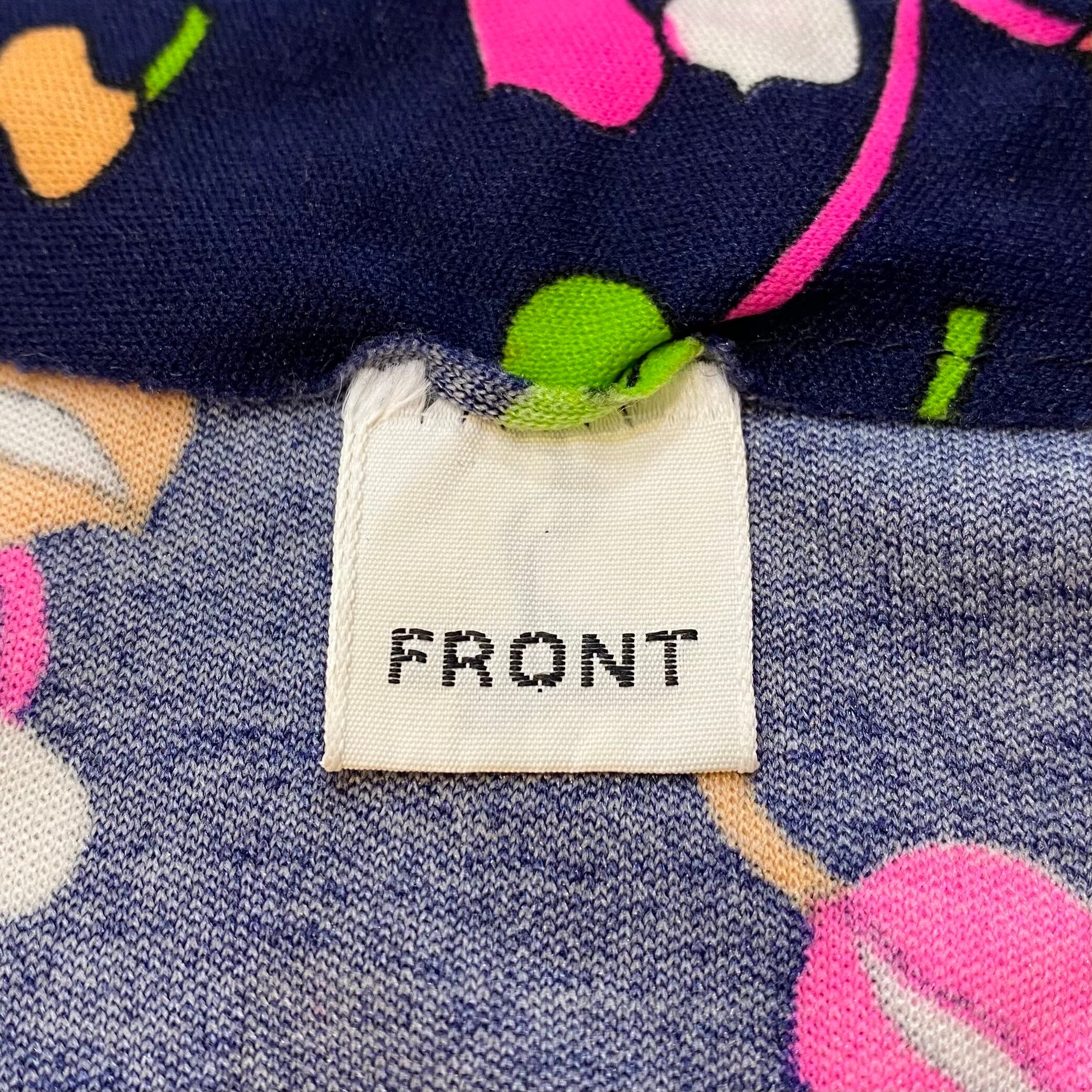 ピンクや黄緑のお花のようなテキスタイルが可愛い、70年代の半袖トップスです。