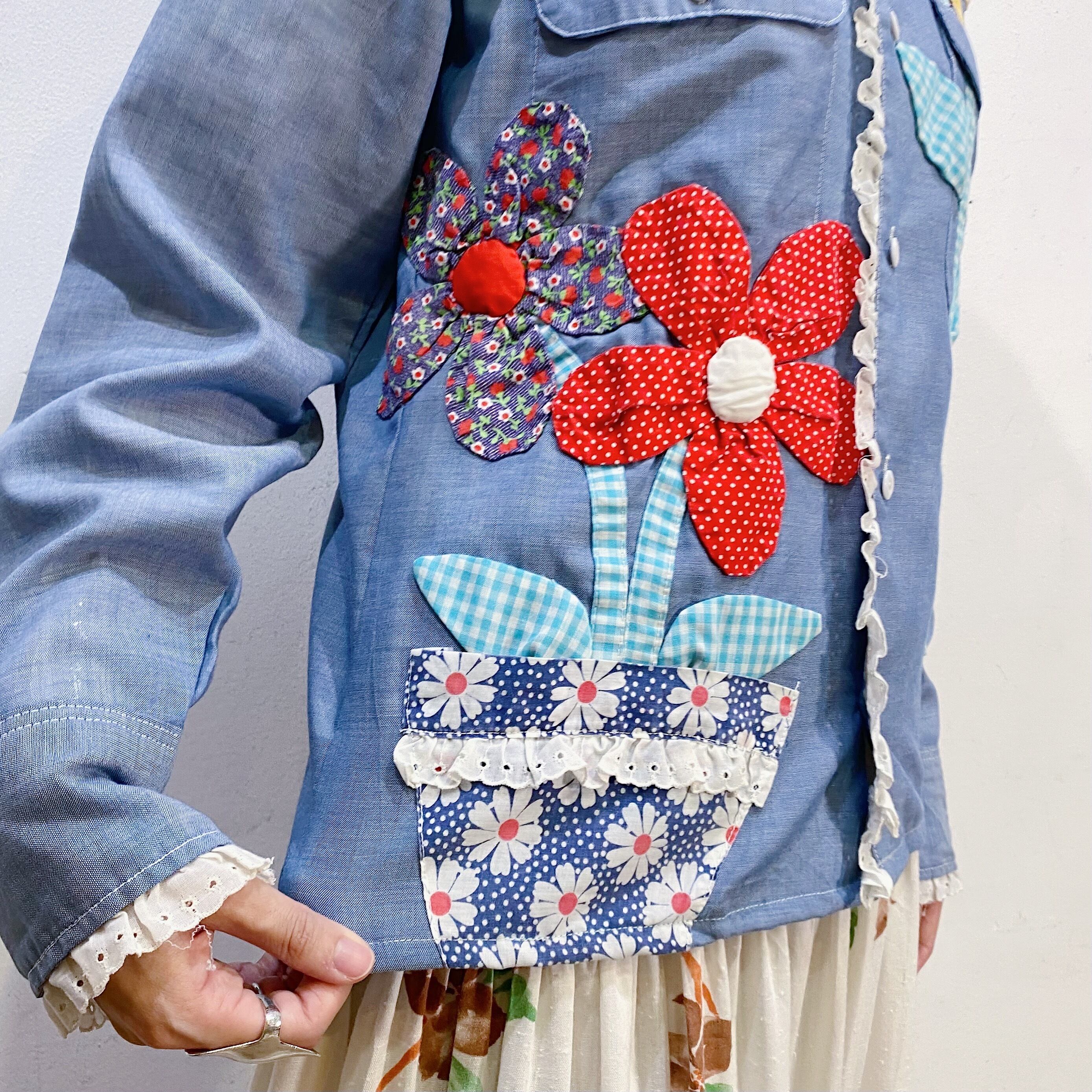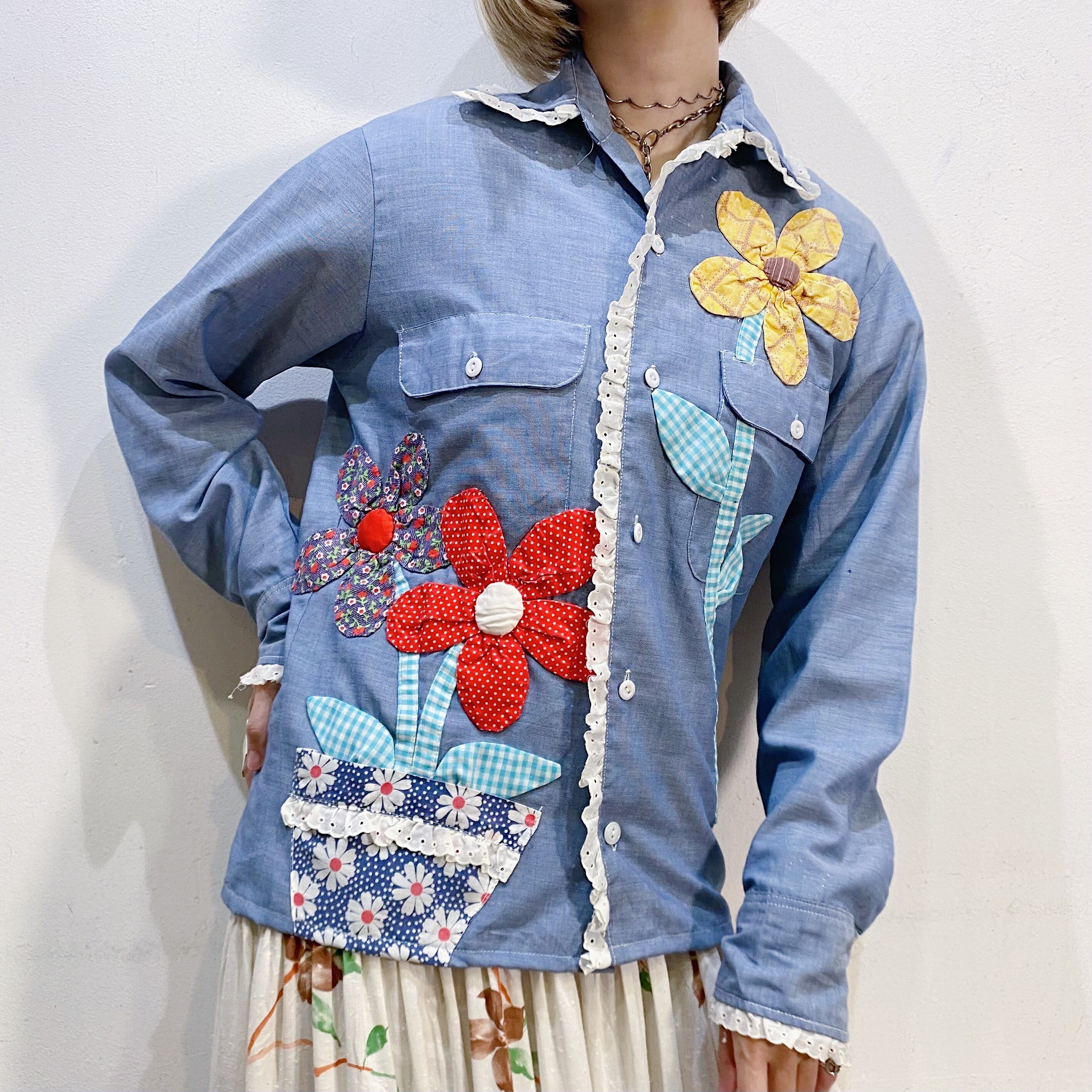 前後に大きくあしらわれたお花のアップリケがとっておきに可愛い、70年代のシャンブレーシャツです。