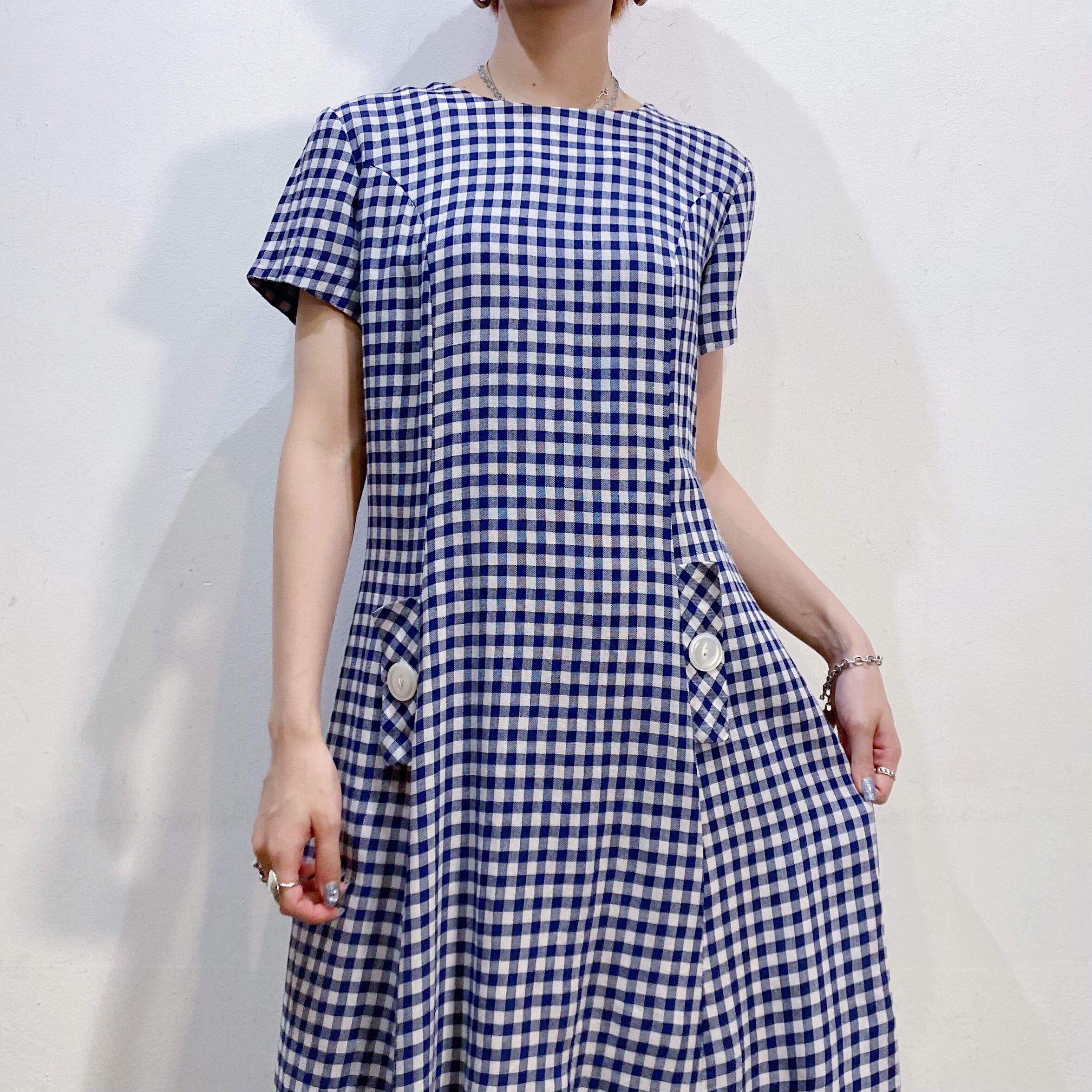 ネイビー×ホワイトのギンガムチェックが可愛い、60~70年代のミニワンピースです。