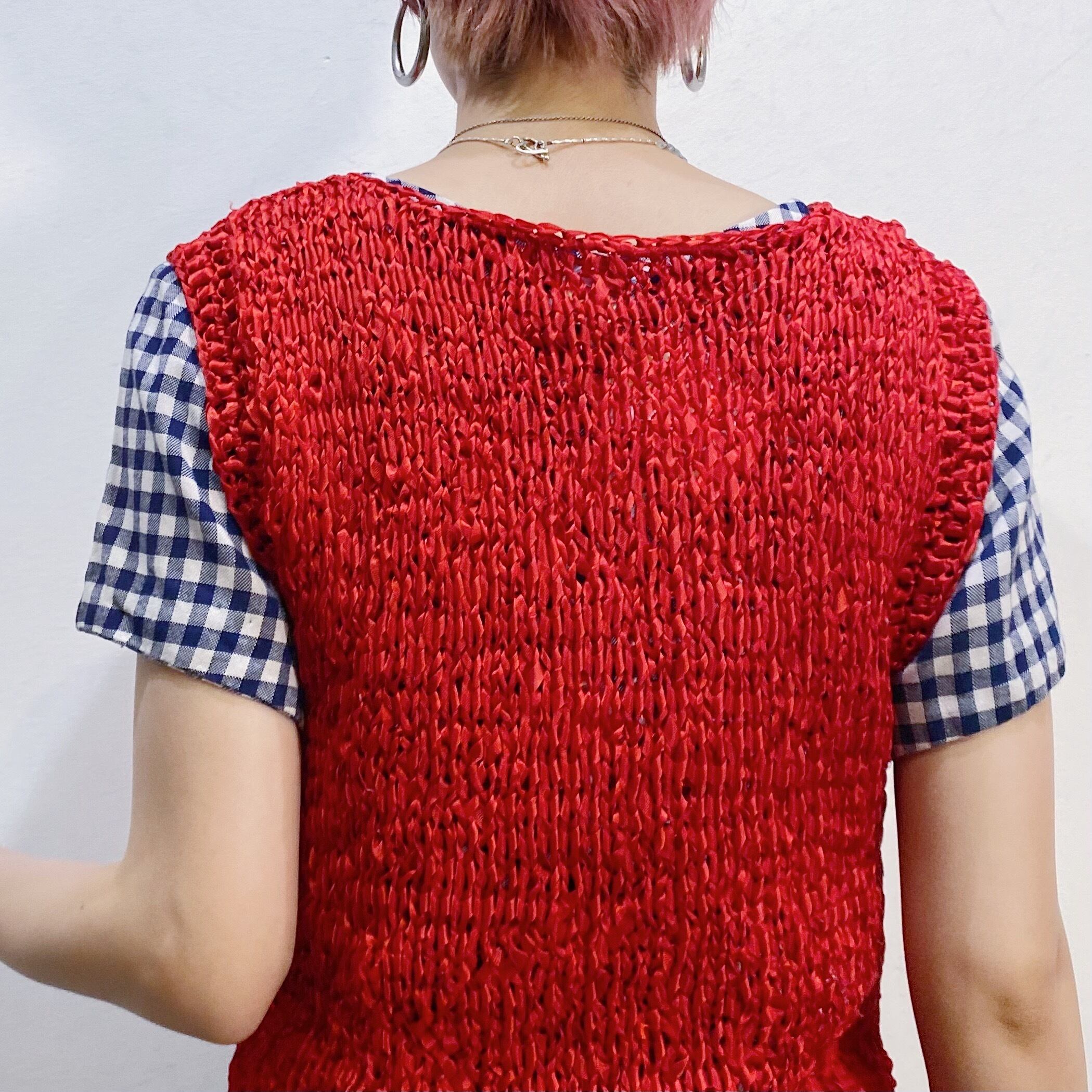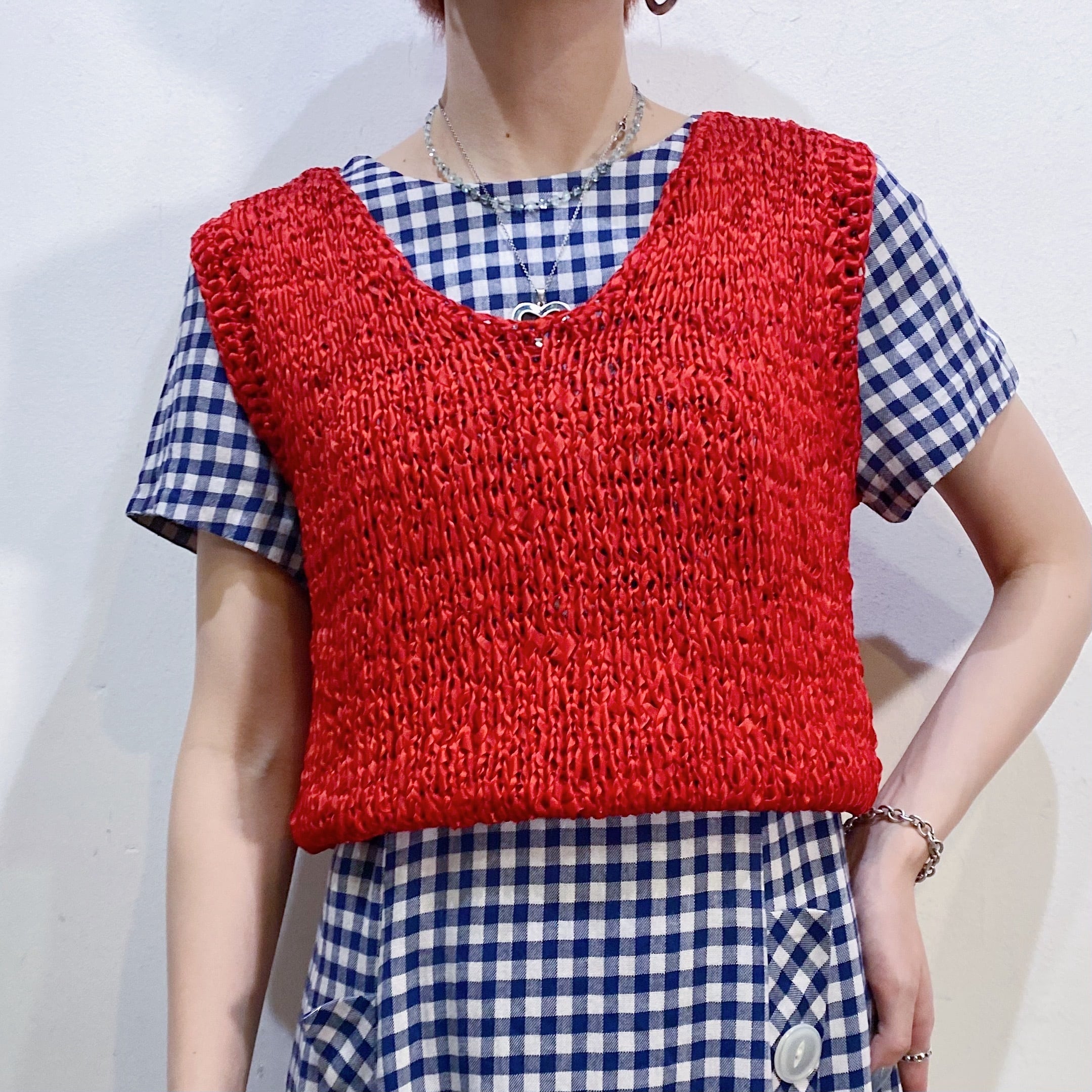 リボンで編み上げたようなシャワっとした素材感が楽しい、ノースリーブトップスです。