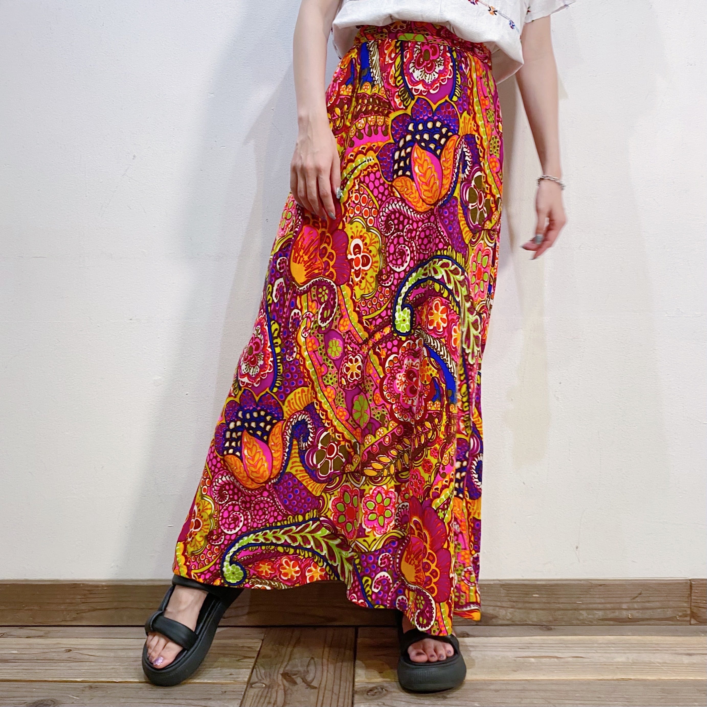 ビビッドでカラフルなサイケデリックな柄がとても可愛い、60~70年代のロングスカートです。