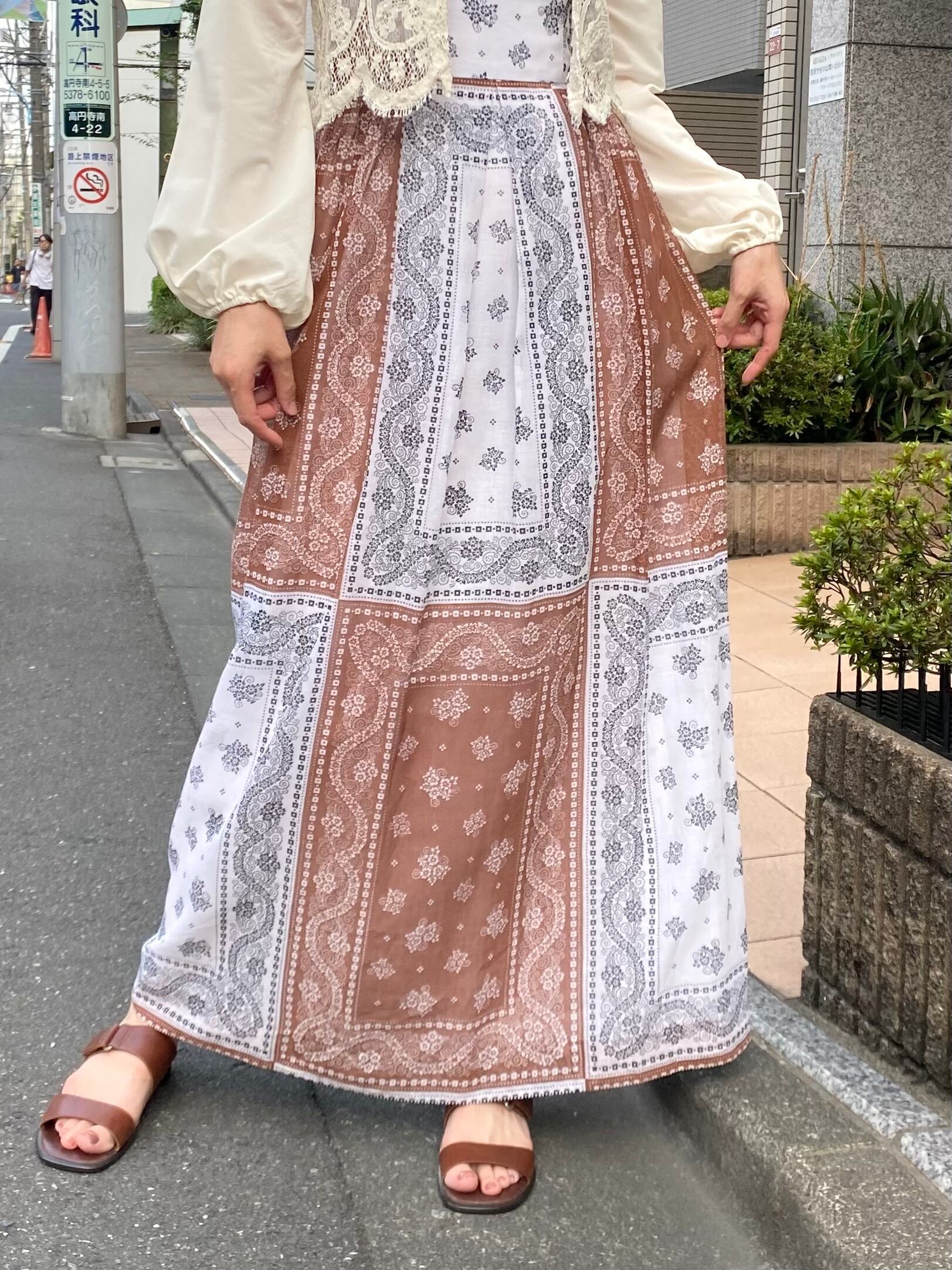 大きなパターンのバンダナ柄が可愛い、70年代のロングワンピースです。