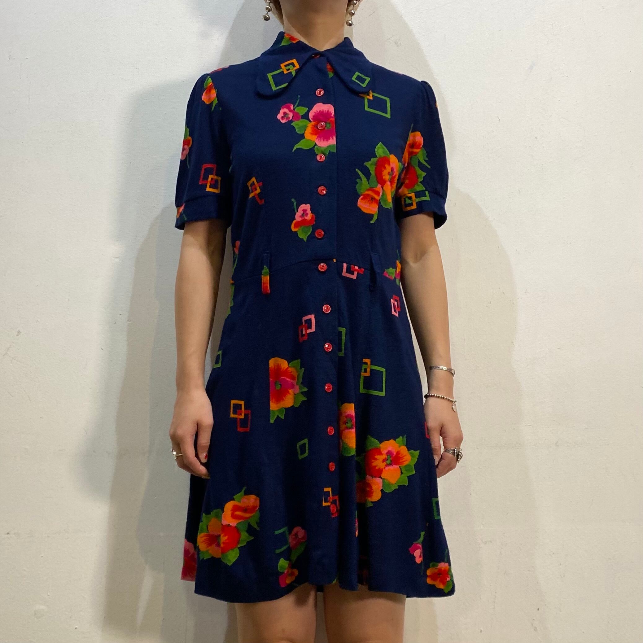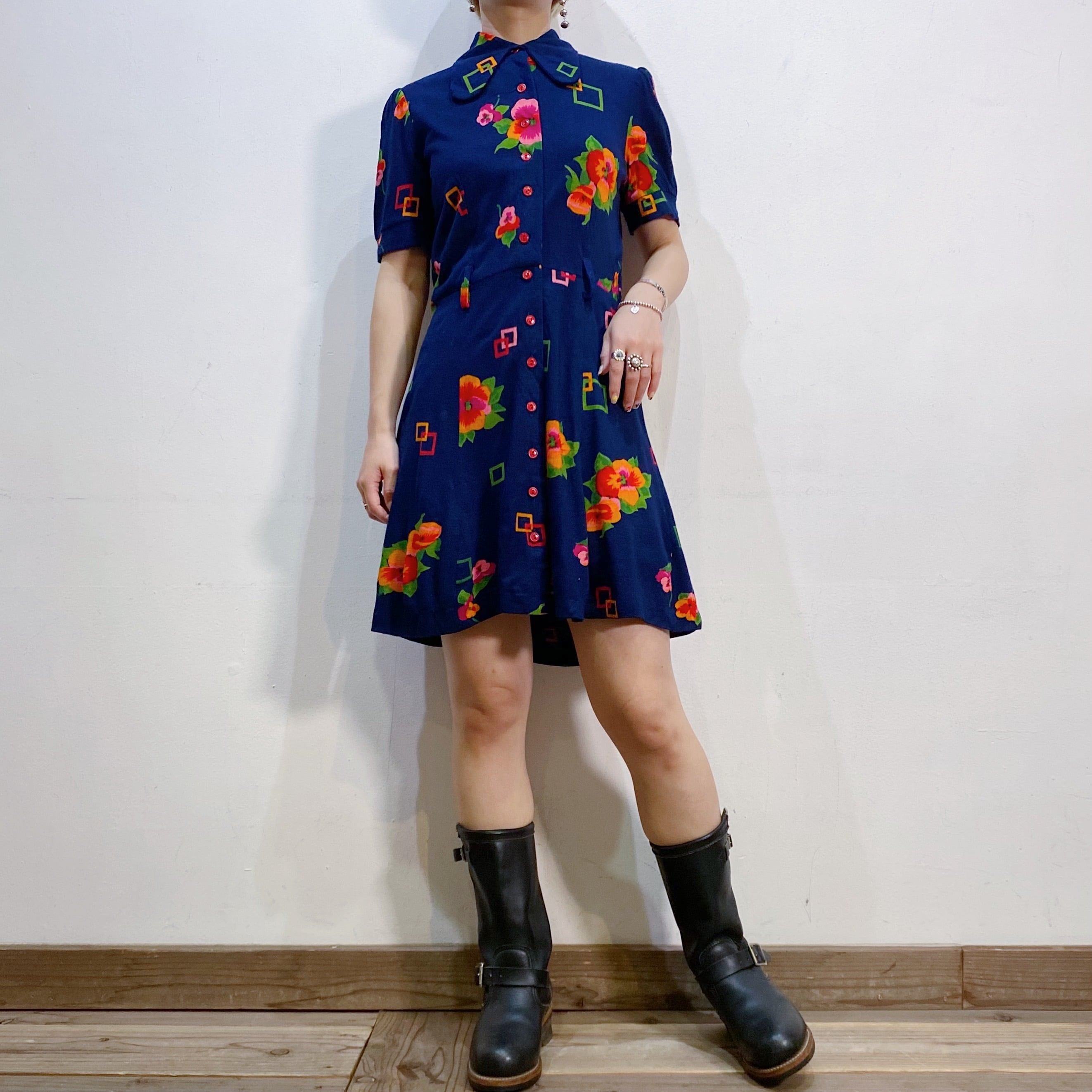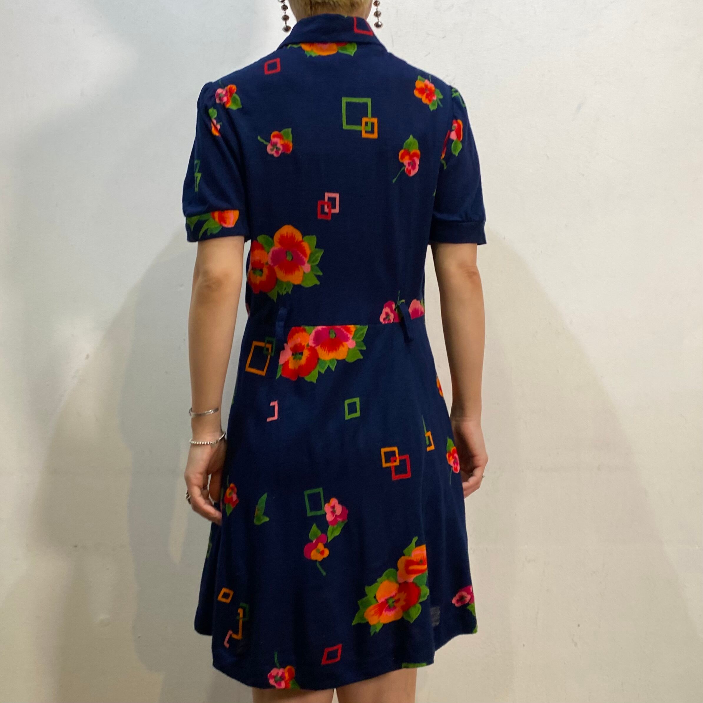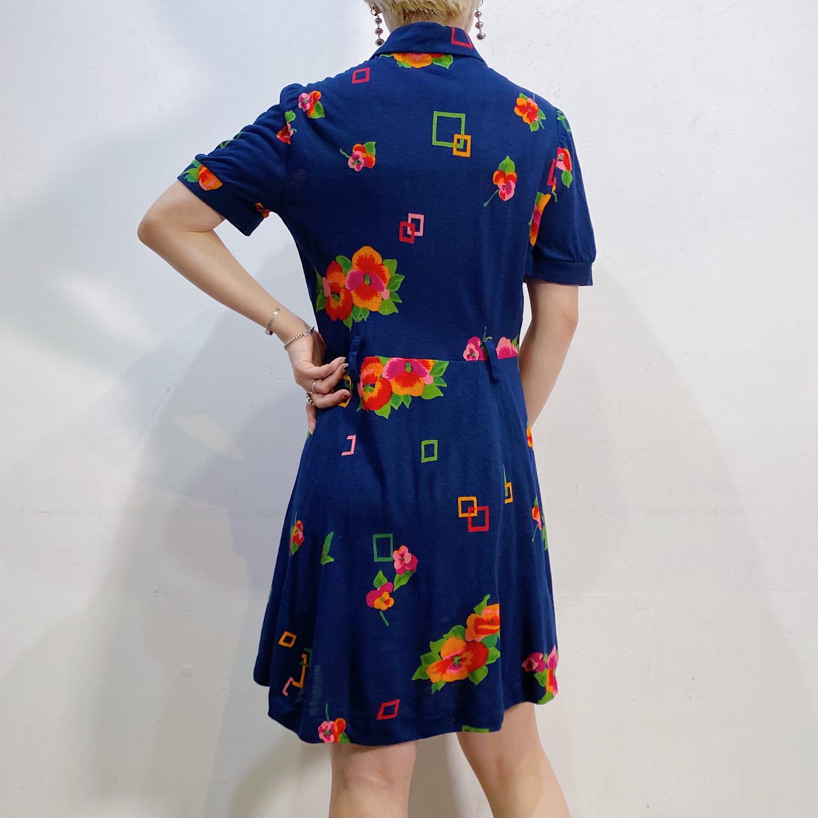 お花と四角のプリントが可愛い、70年代のミニワンピースです。