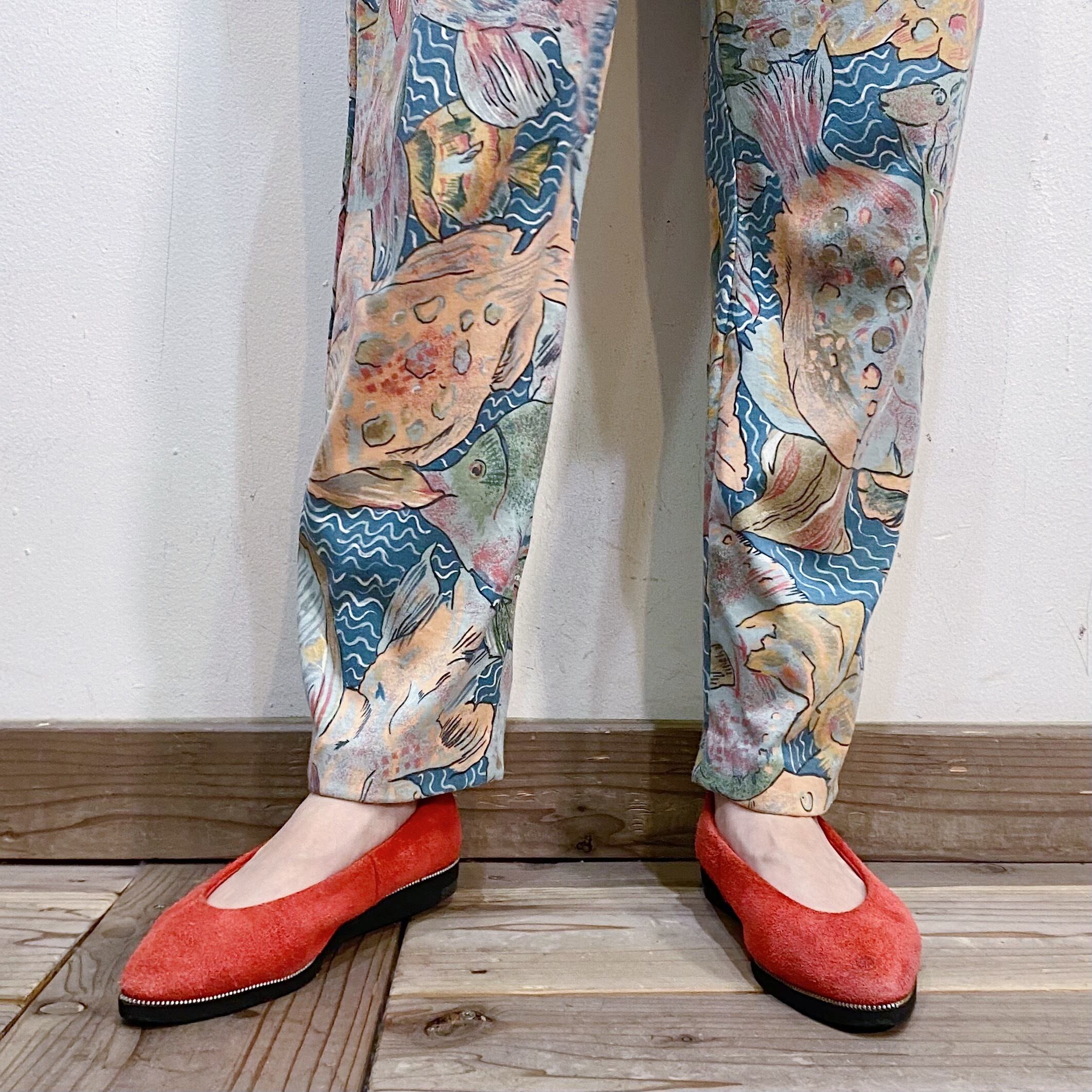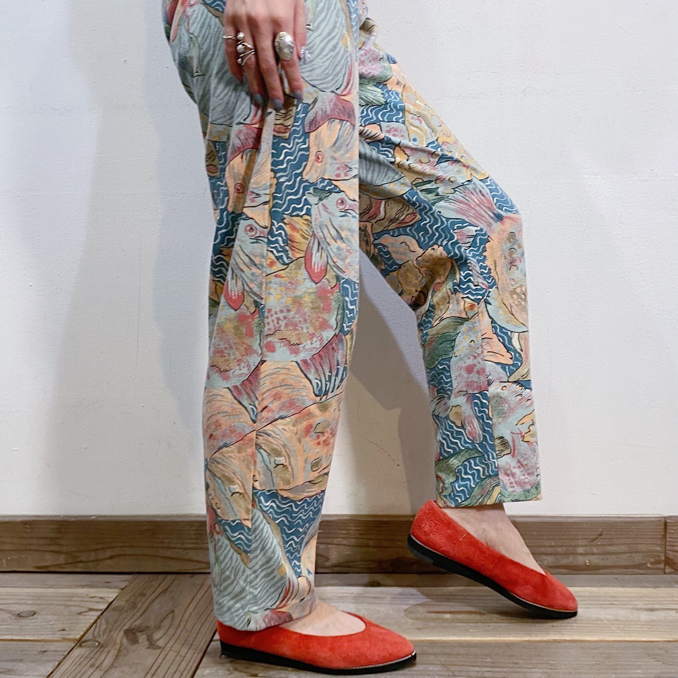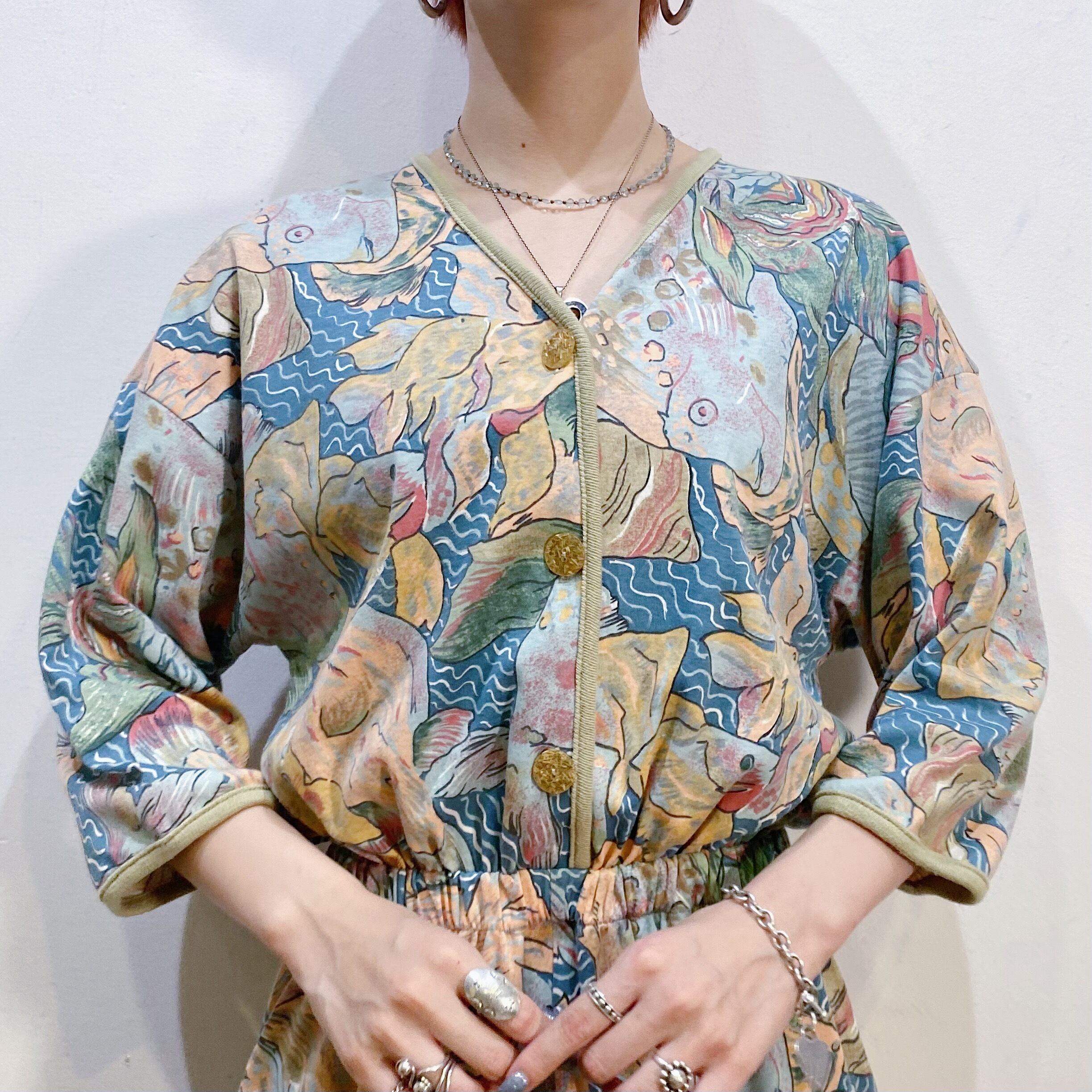 海で泳いでいるかのようなイラストタッチの魚たちが、ギュッと詰まった柄がとても可愛い、80年代のジャンプスーツです。