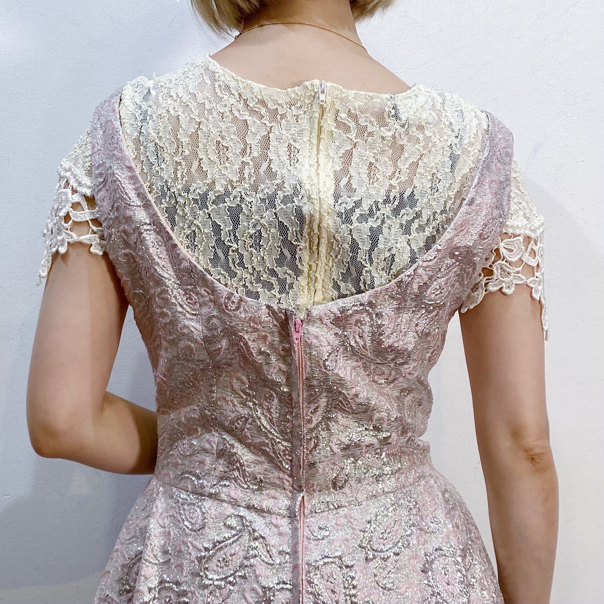 ラッピングペーパーのようなグリッターの素材感が可愛い、70年代のロングワンピースです。