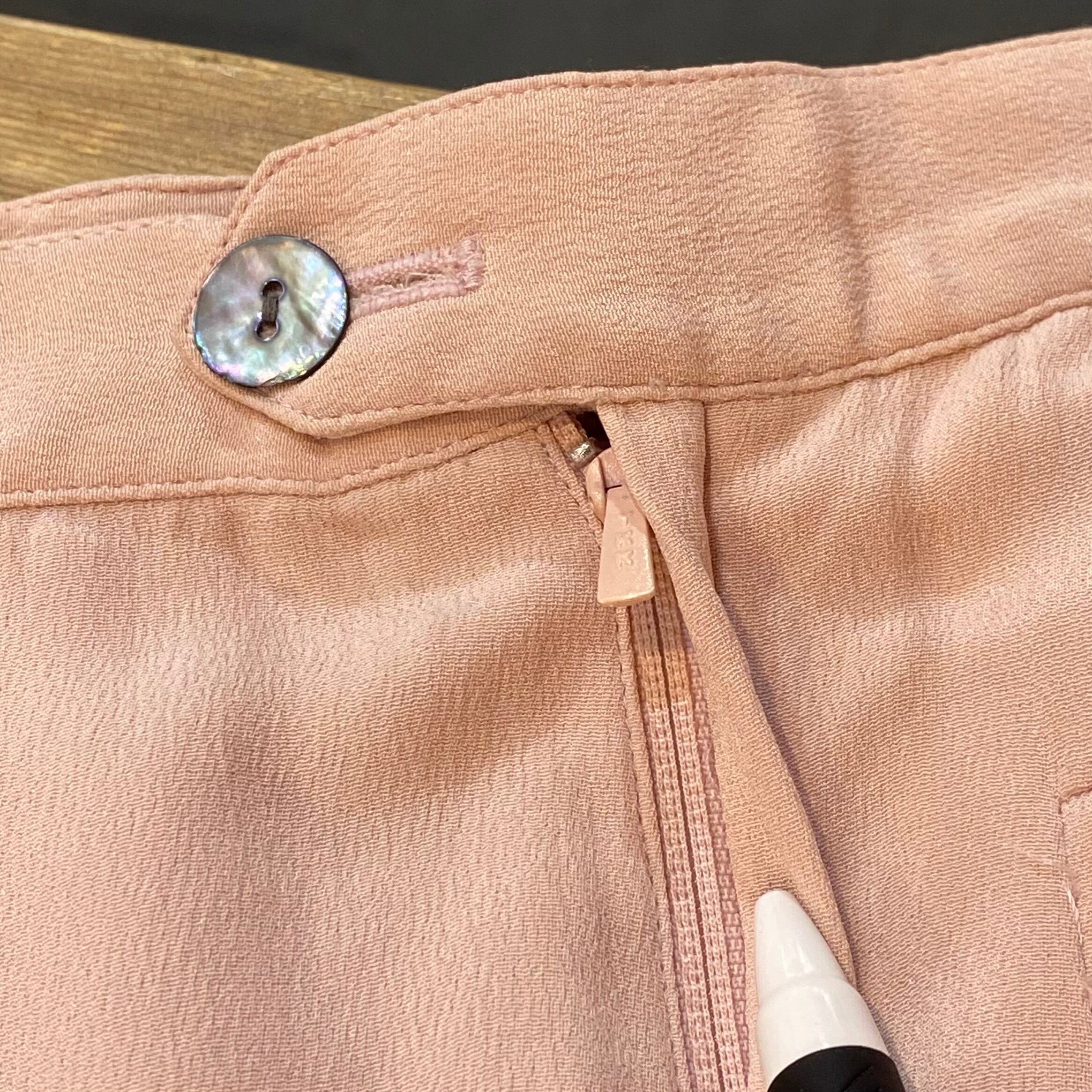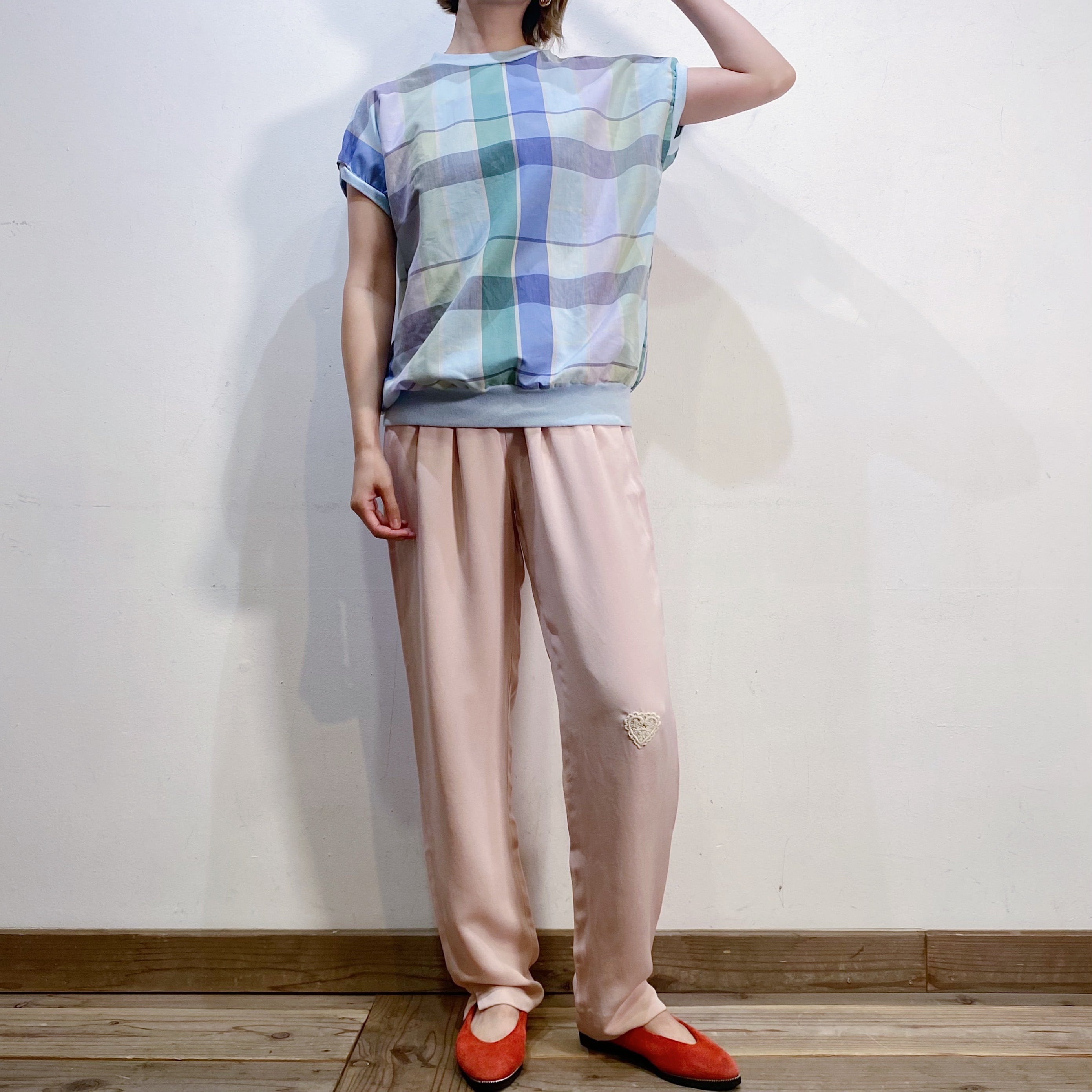 淡いピンクの色合いと膝にパッチされたレースのハートが可愛い、パンツです。