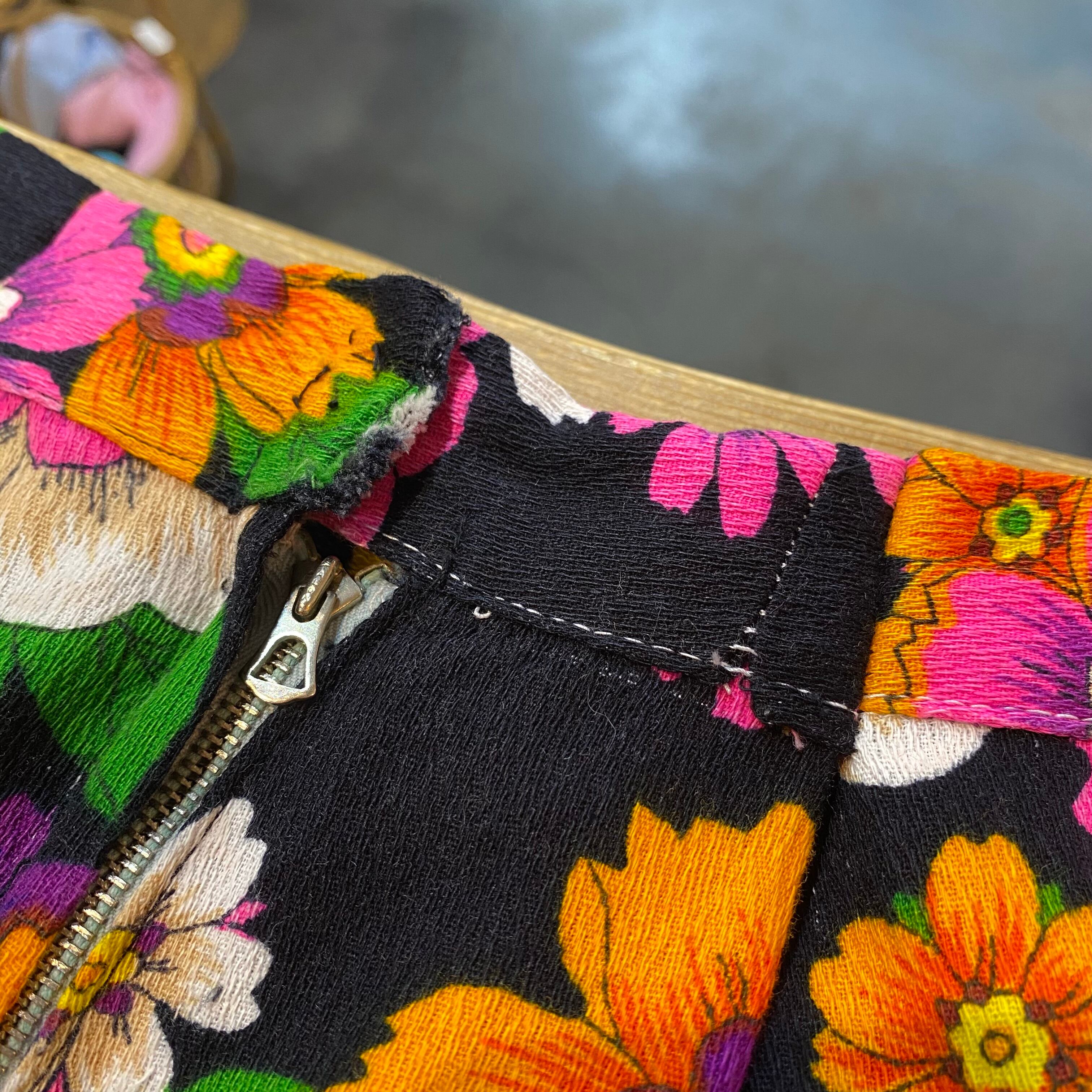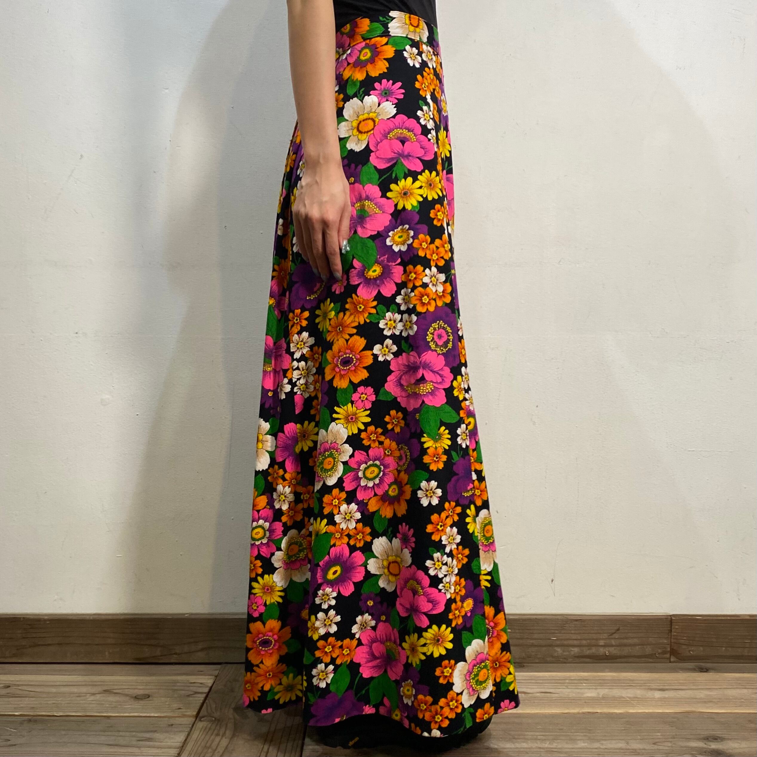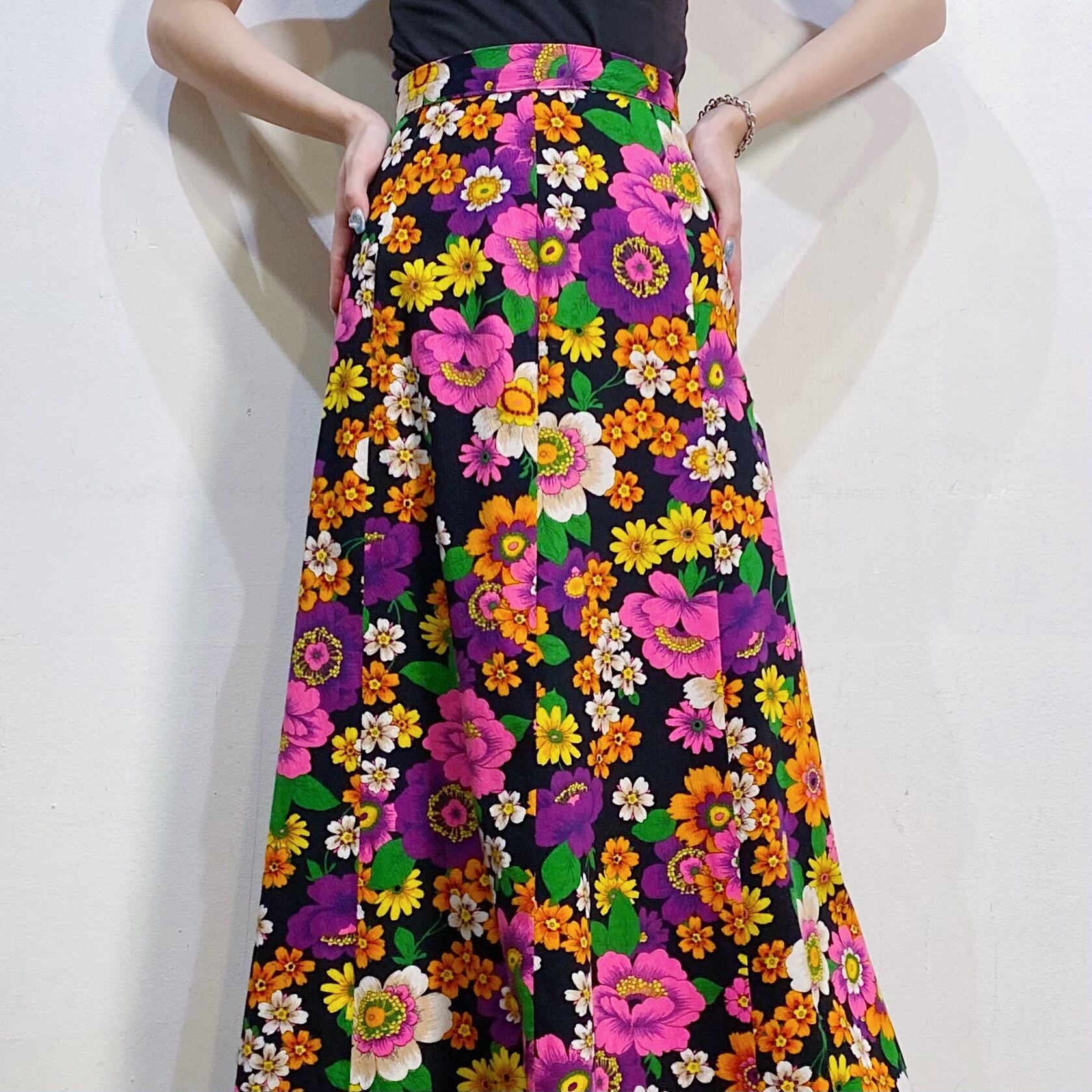 ブラックベースにカラフルな花柄が映える、60~70年代のスカートです。