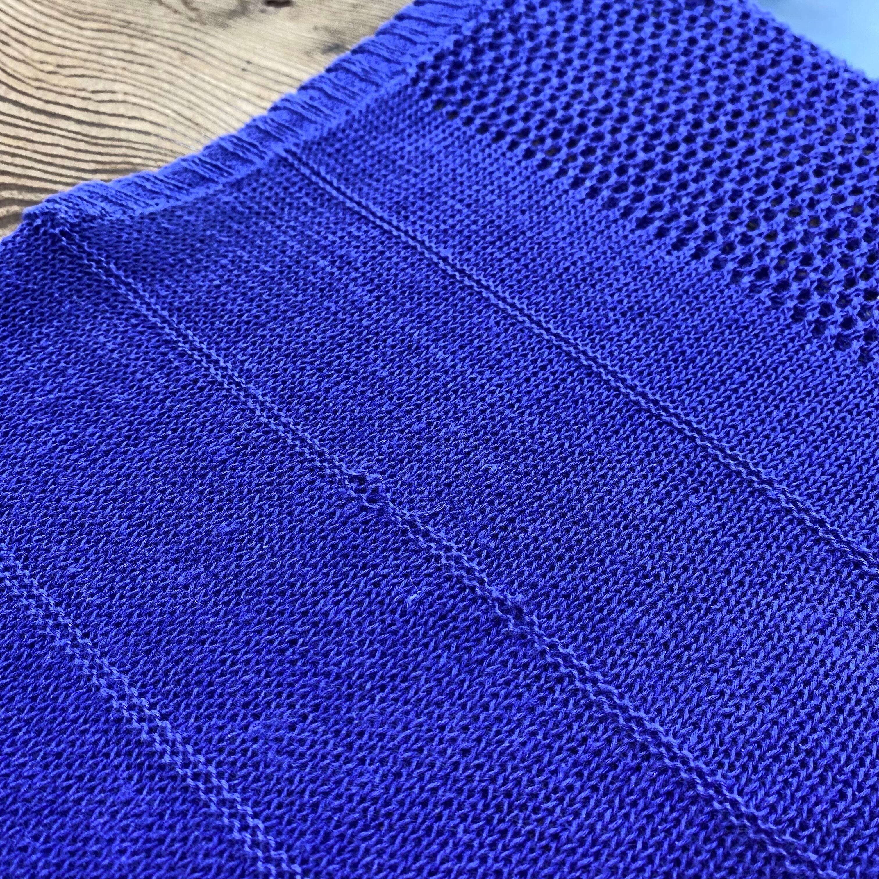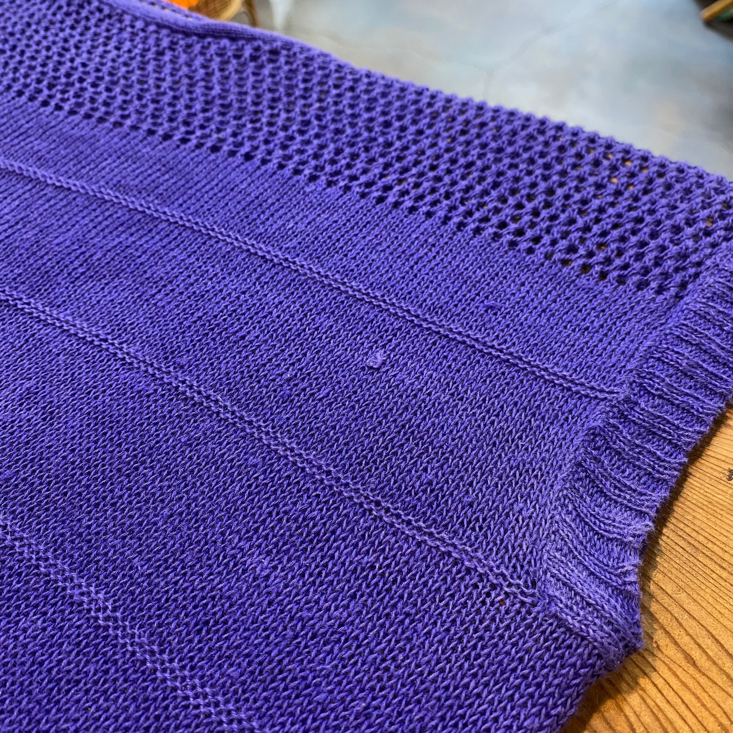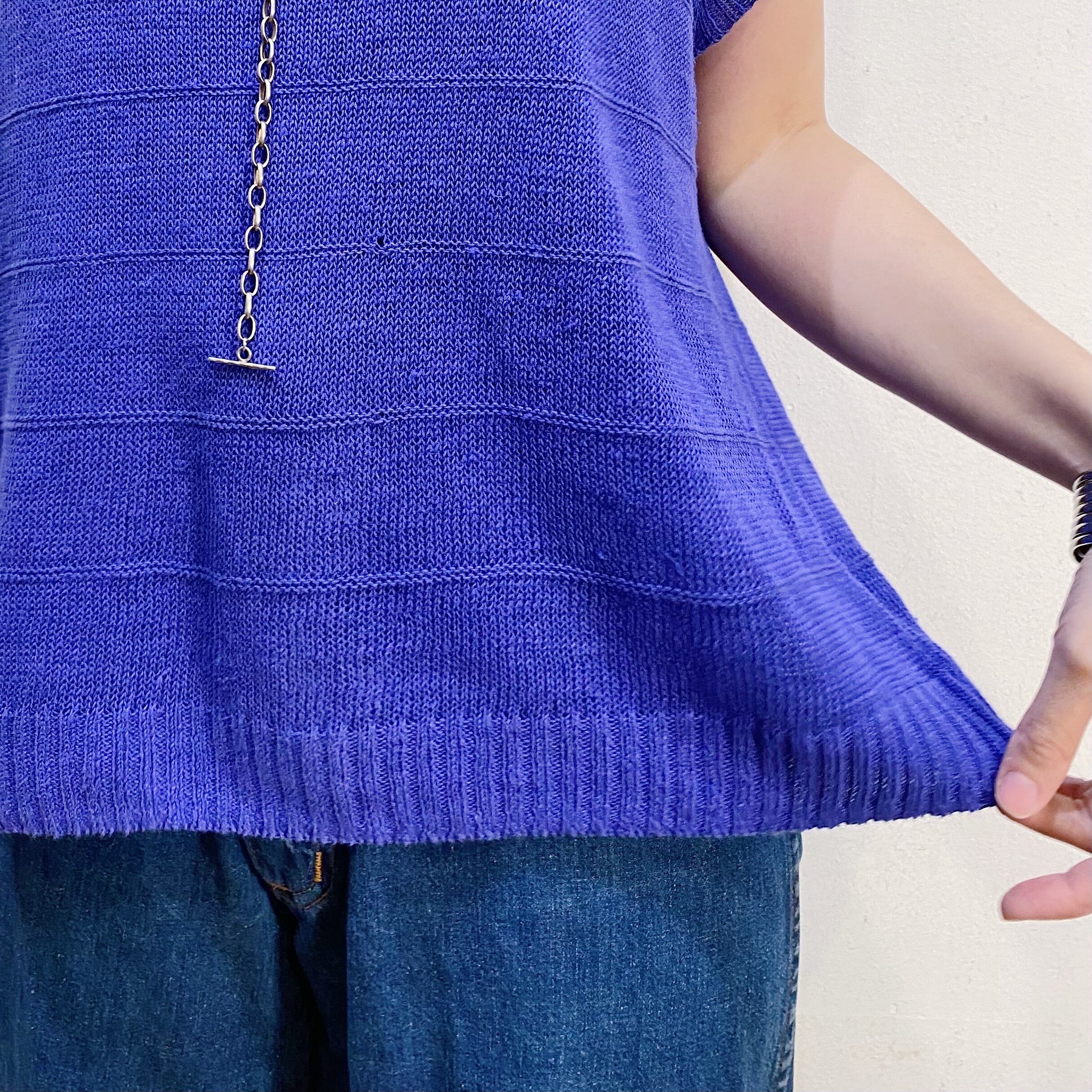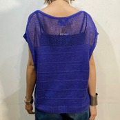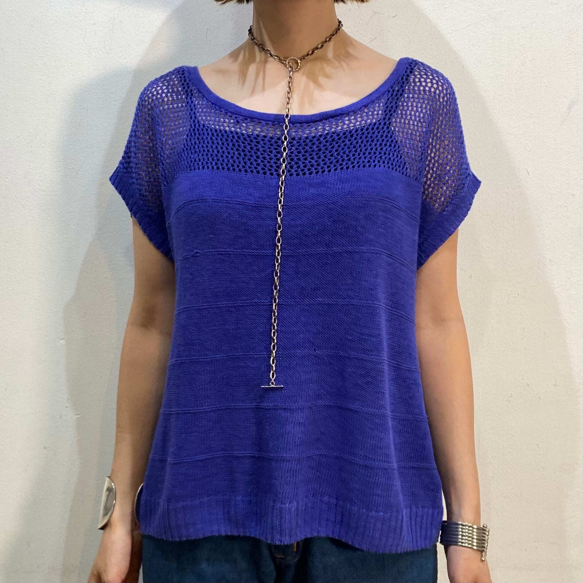 ブルーとパープルの中間のような絶妙な色合いが可愛い、クロシェトップスです。