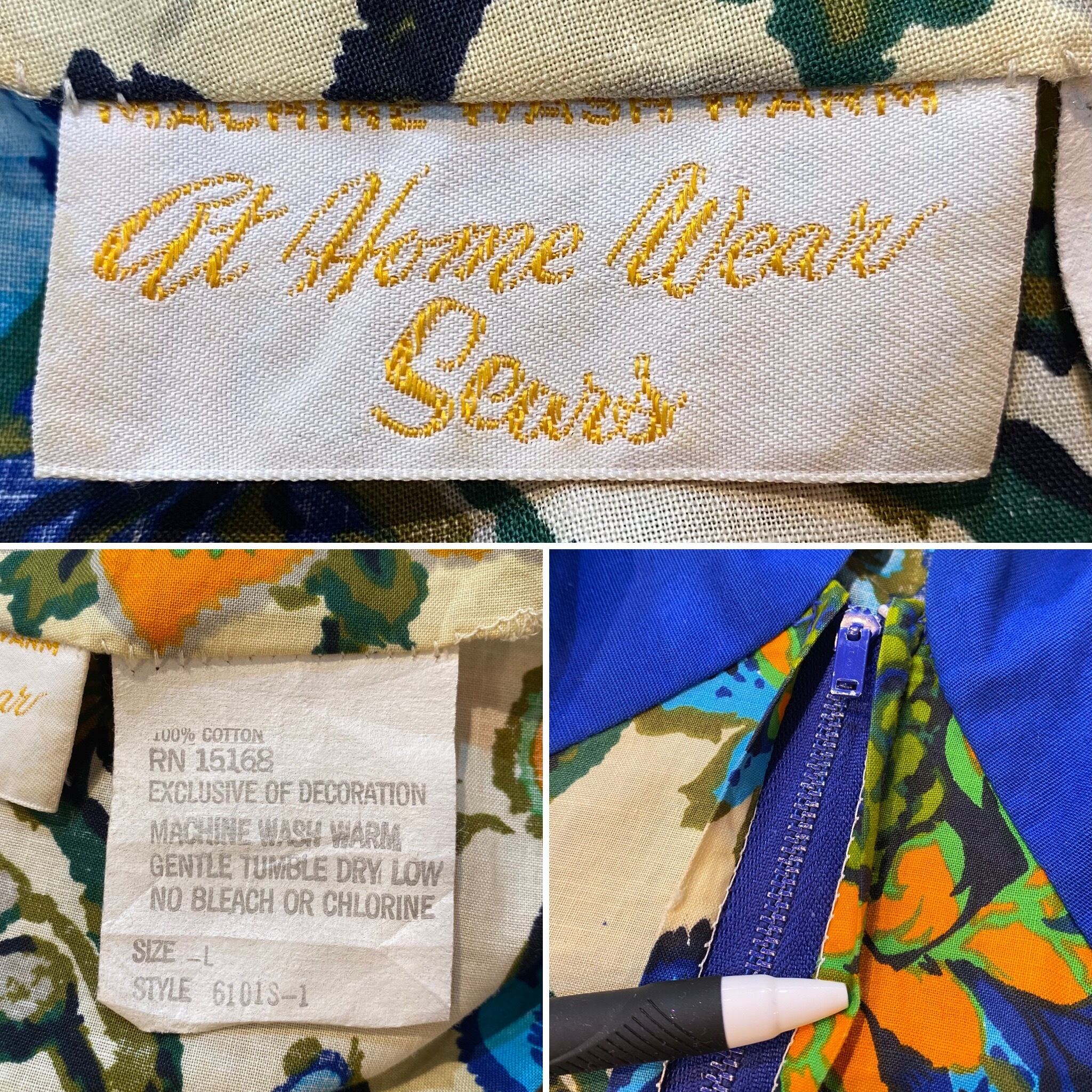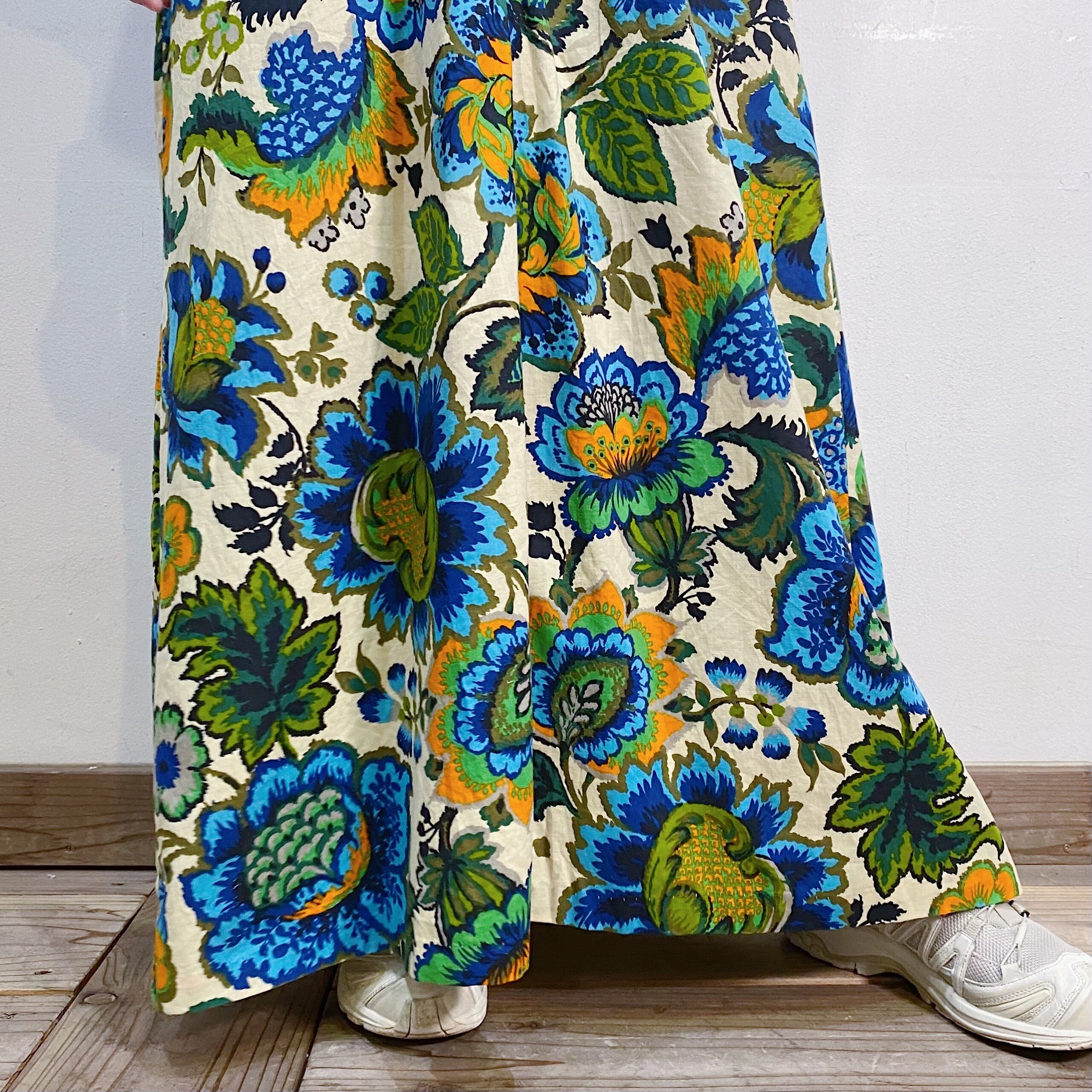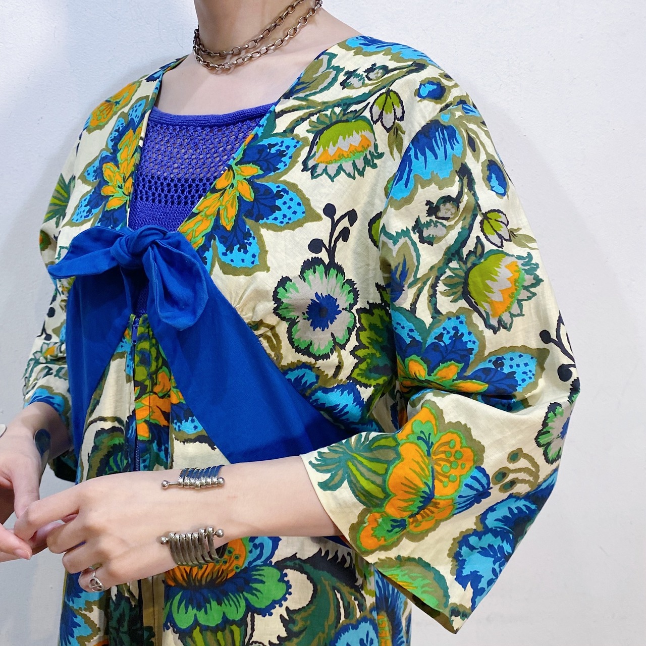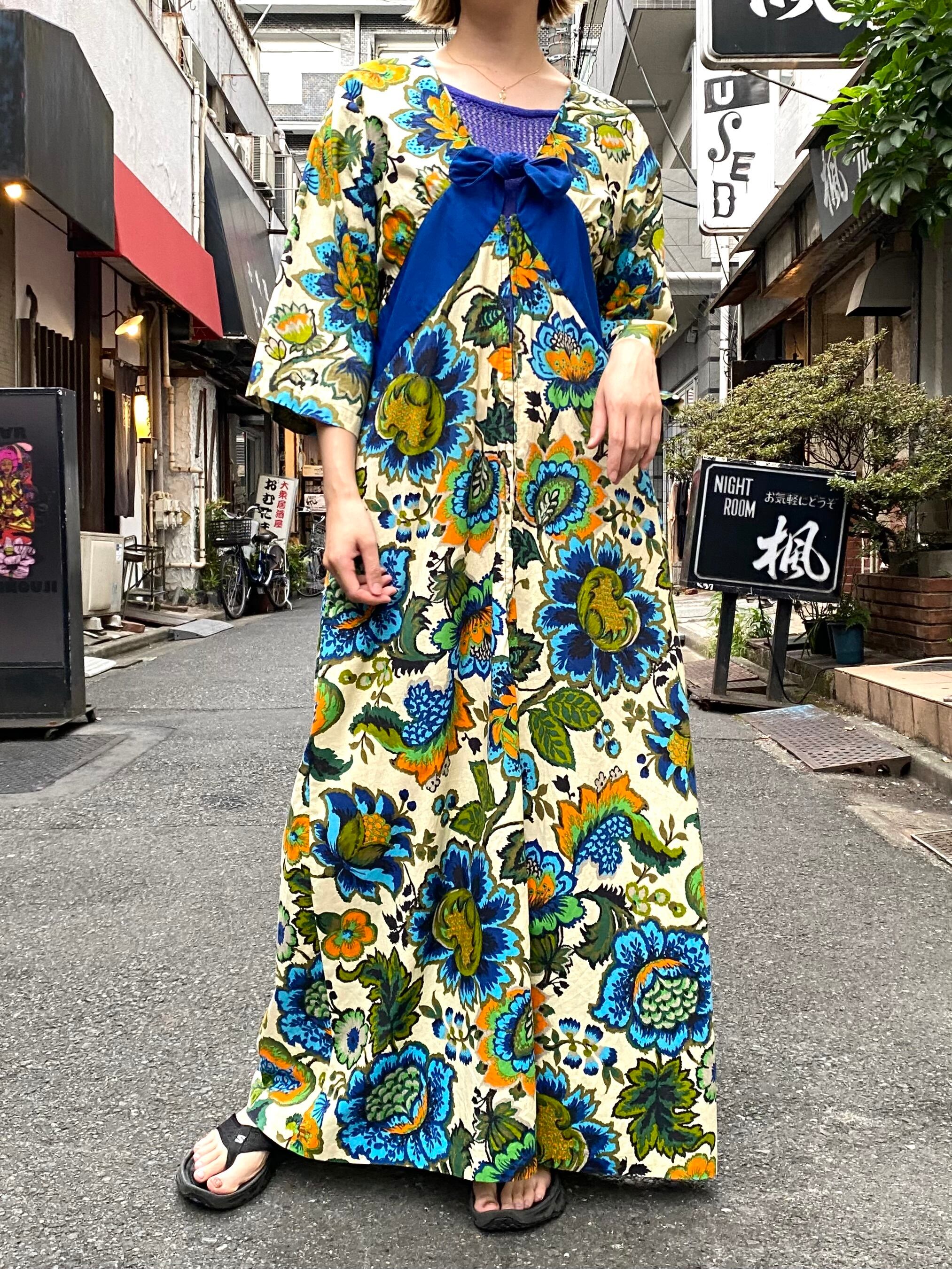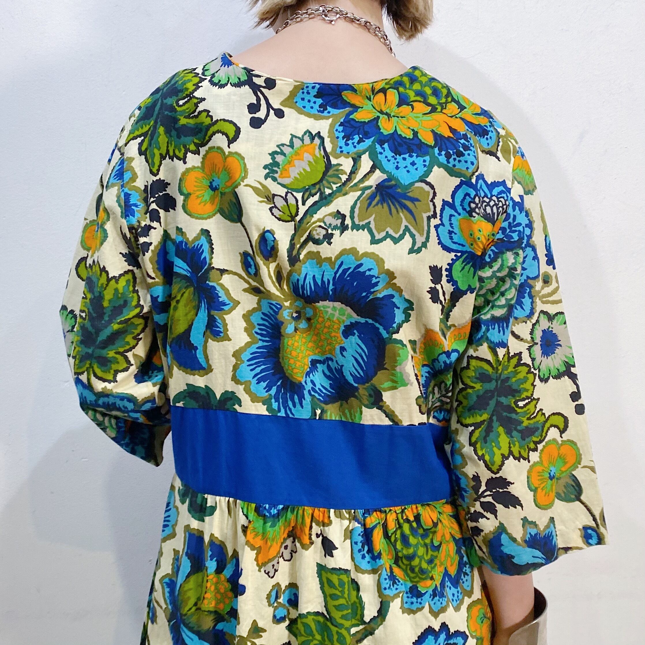 ベージュベースにブルーの大胆な花柄が可愛い、60年代のワンピースです。