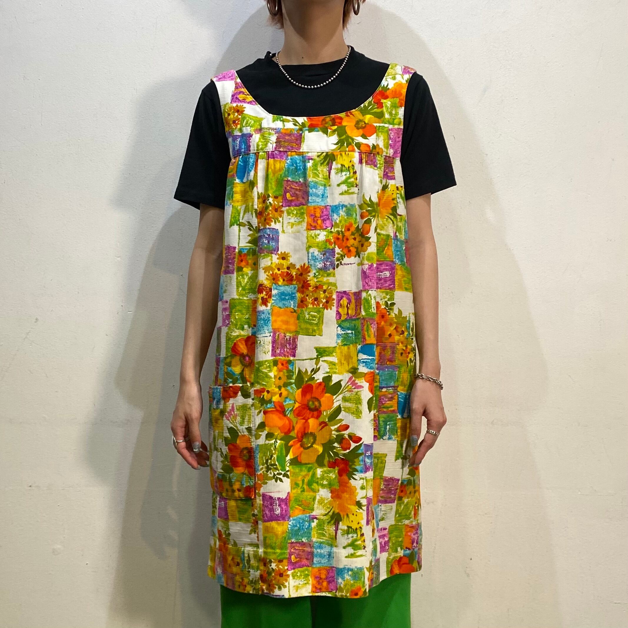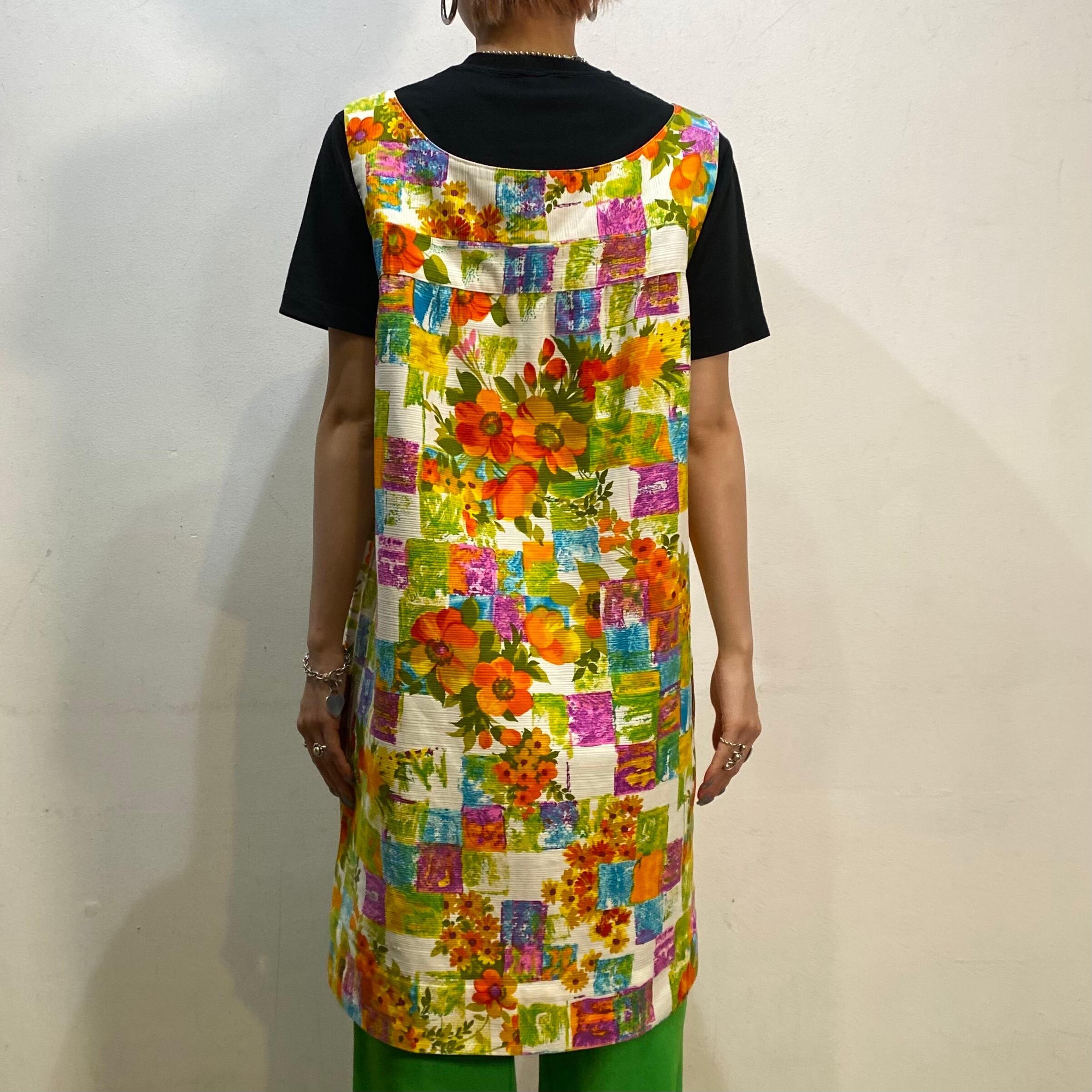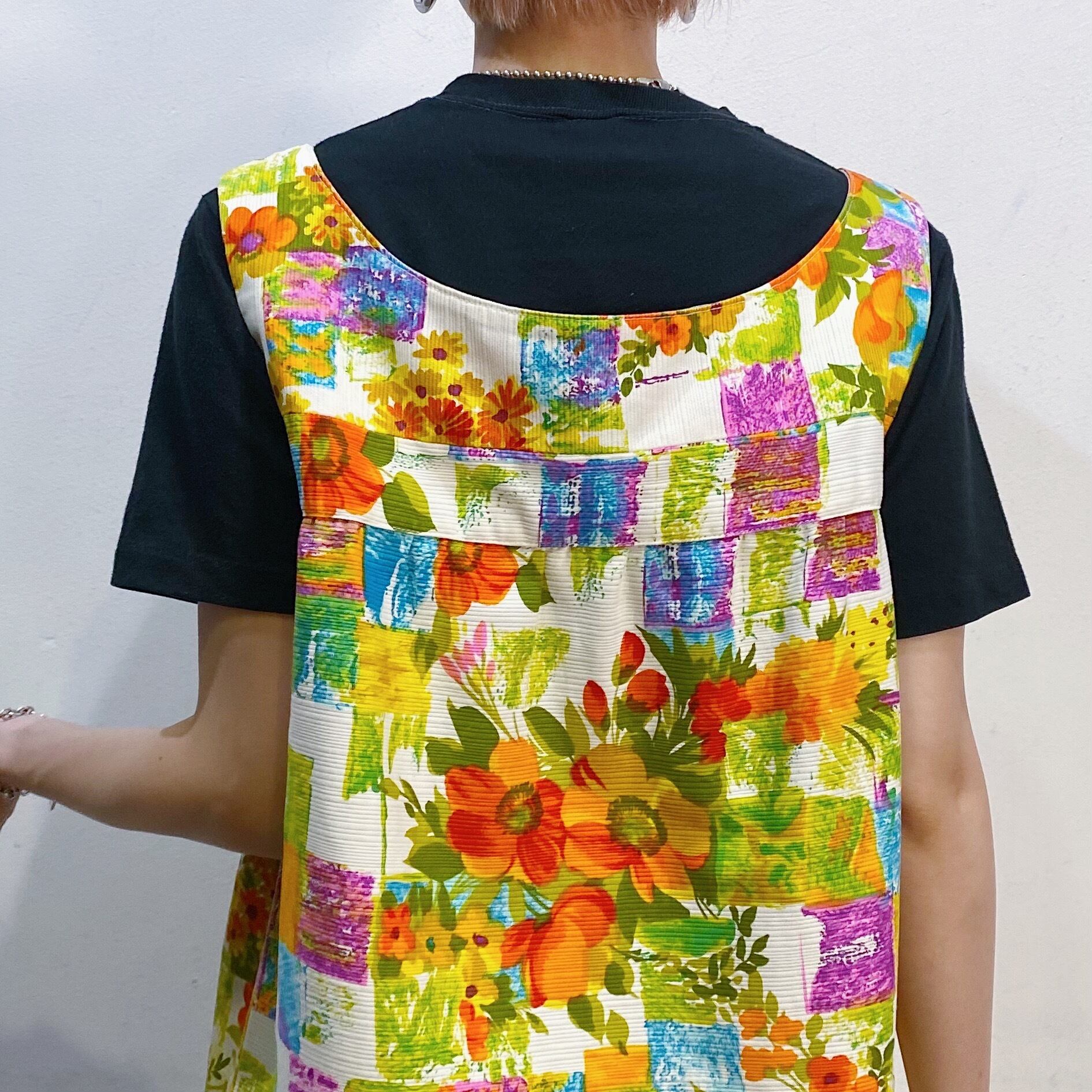 カラフルで華やかなパッチワークとお花柄が可愛い、70年代のミニワンピースです。