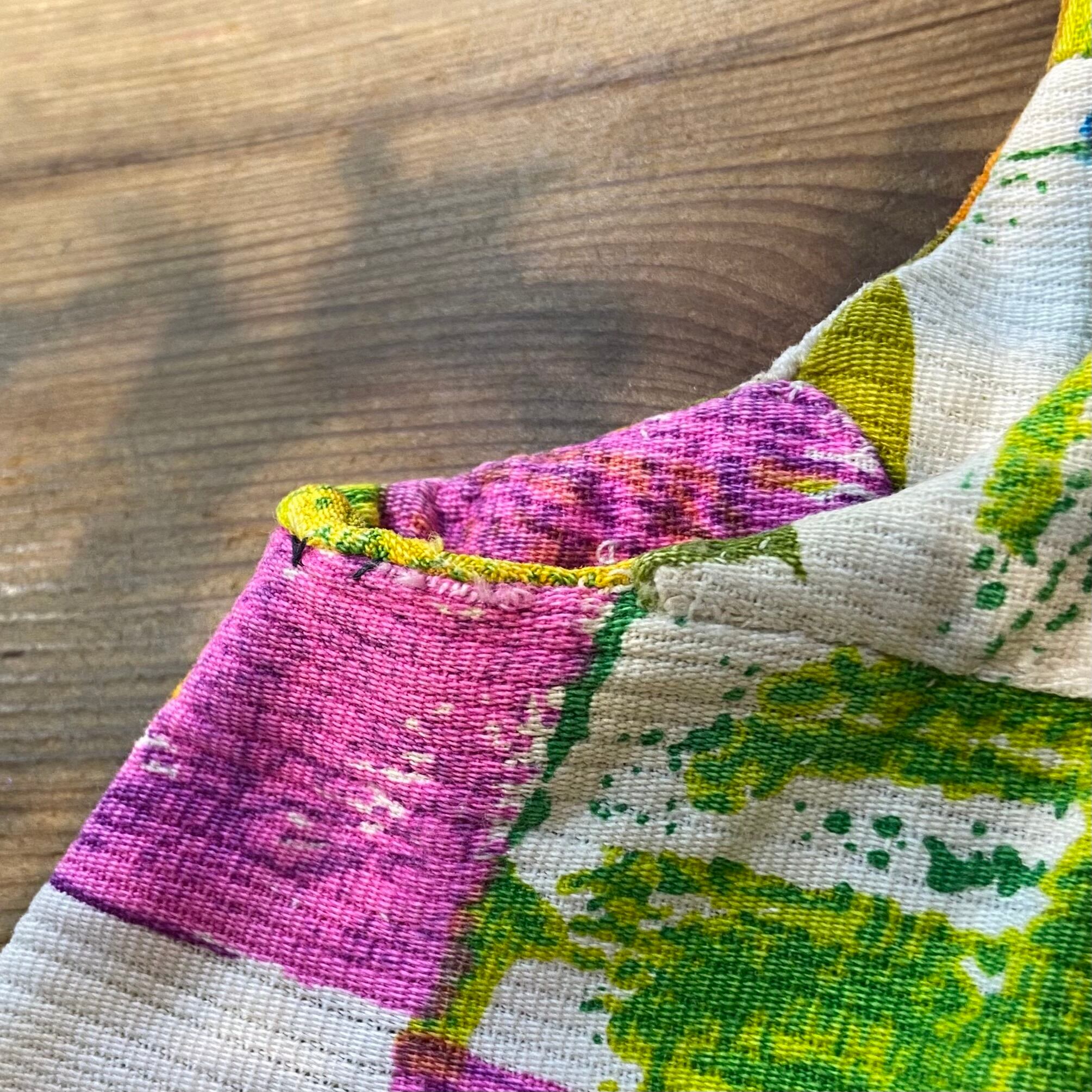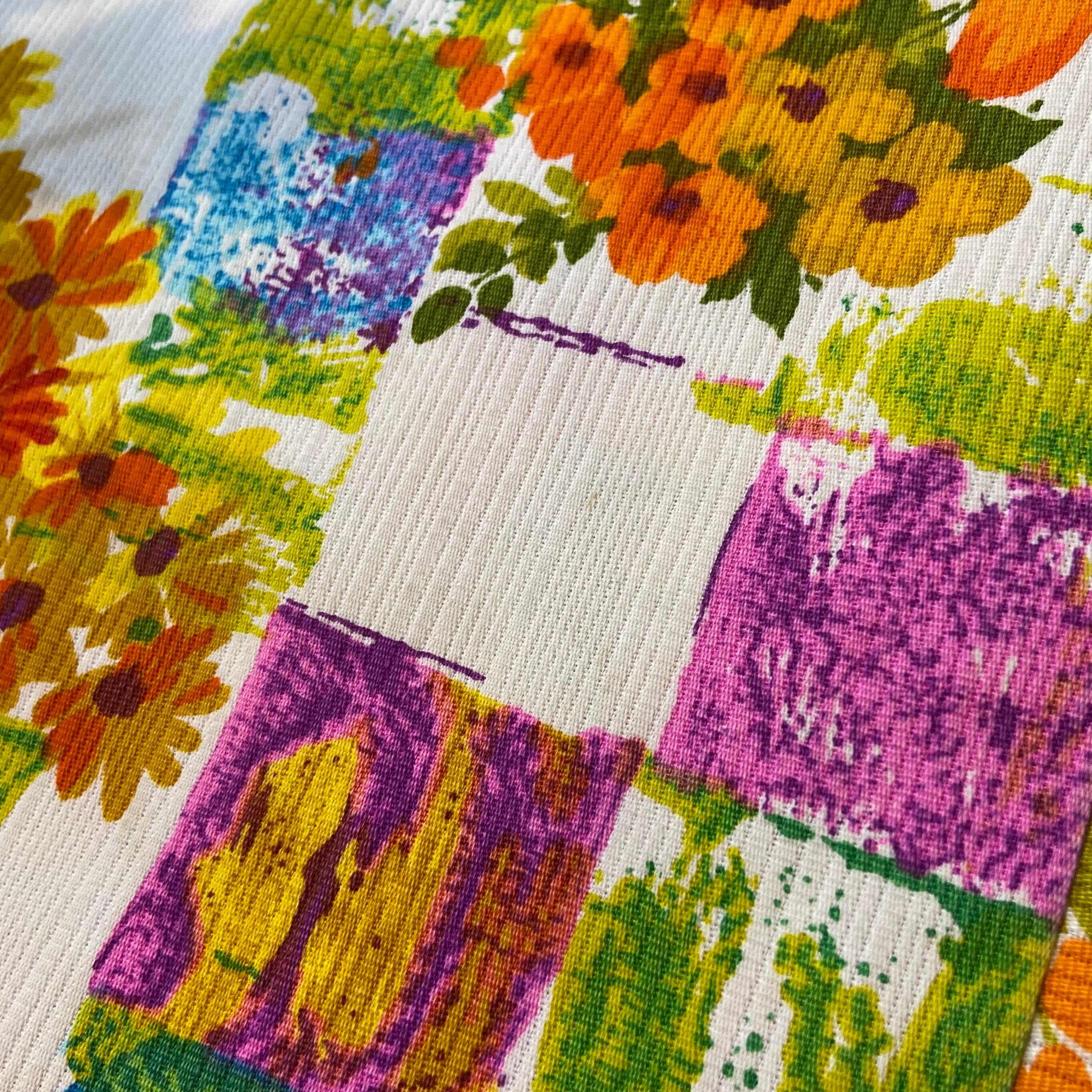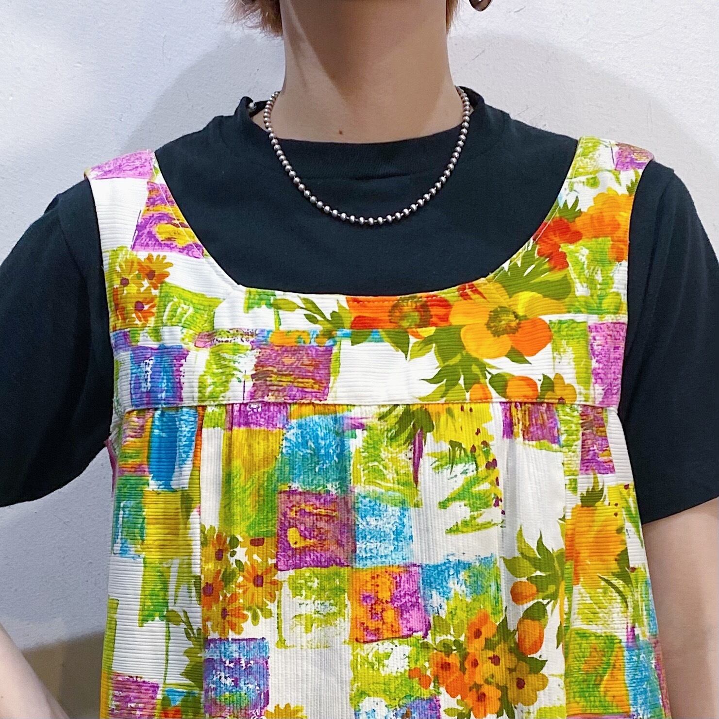 カラフルで華やかなパッチワークとお花柄が可愛い、70年代のミニワンピースです。