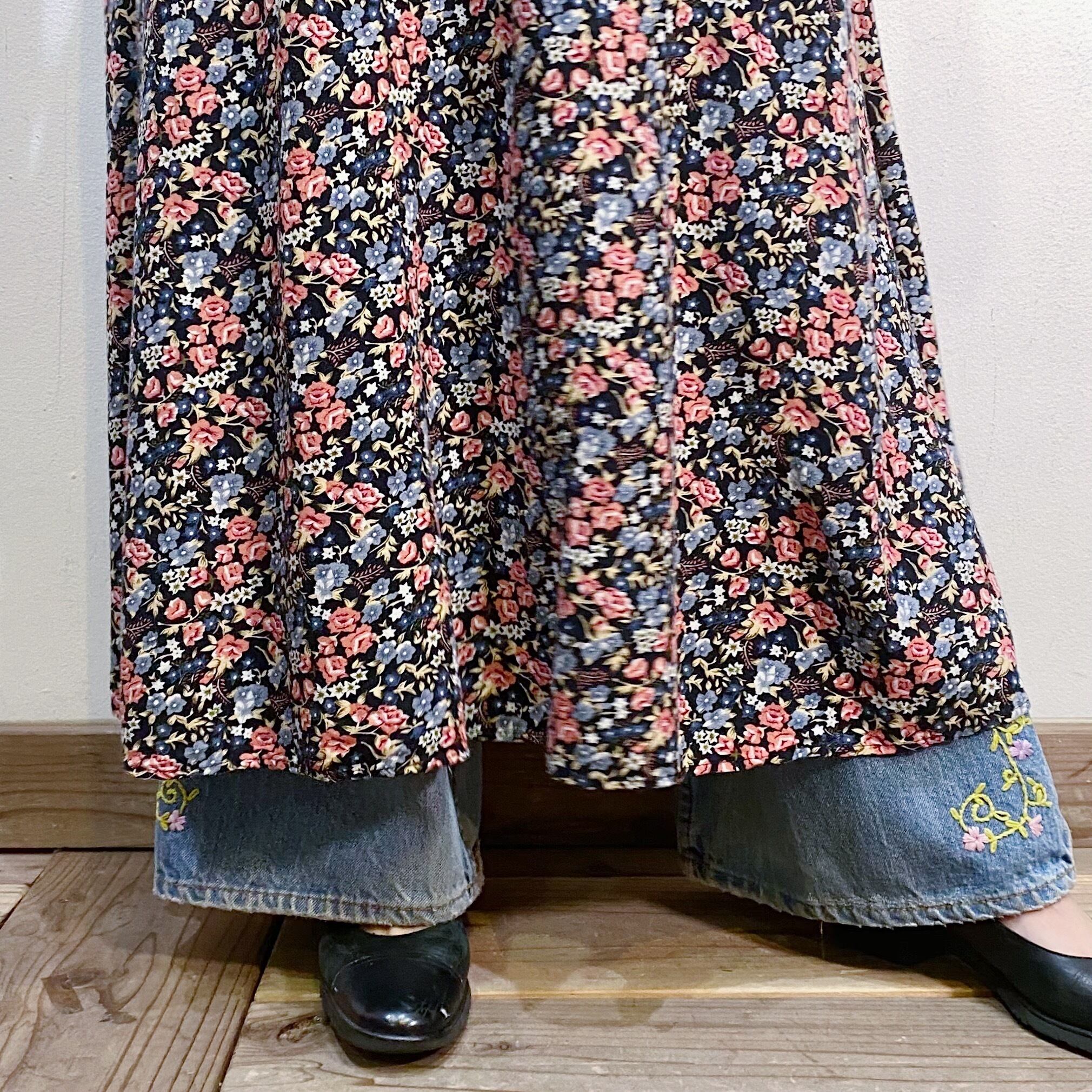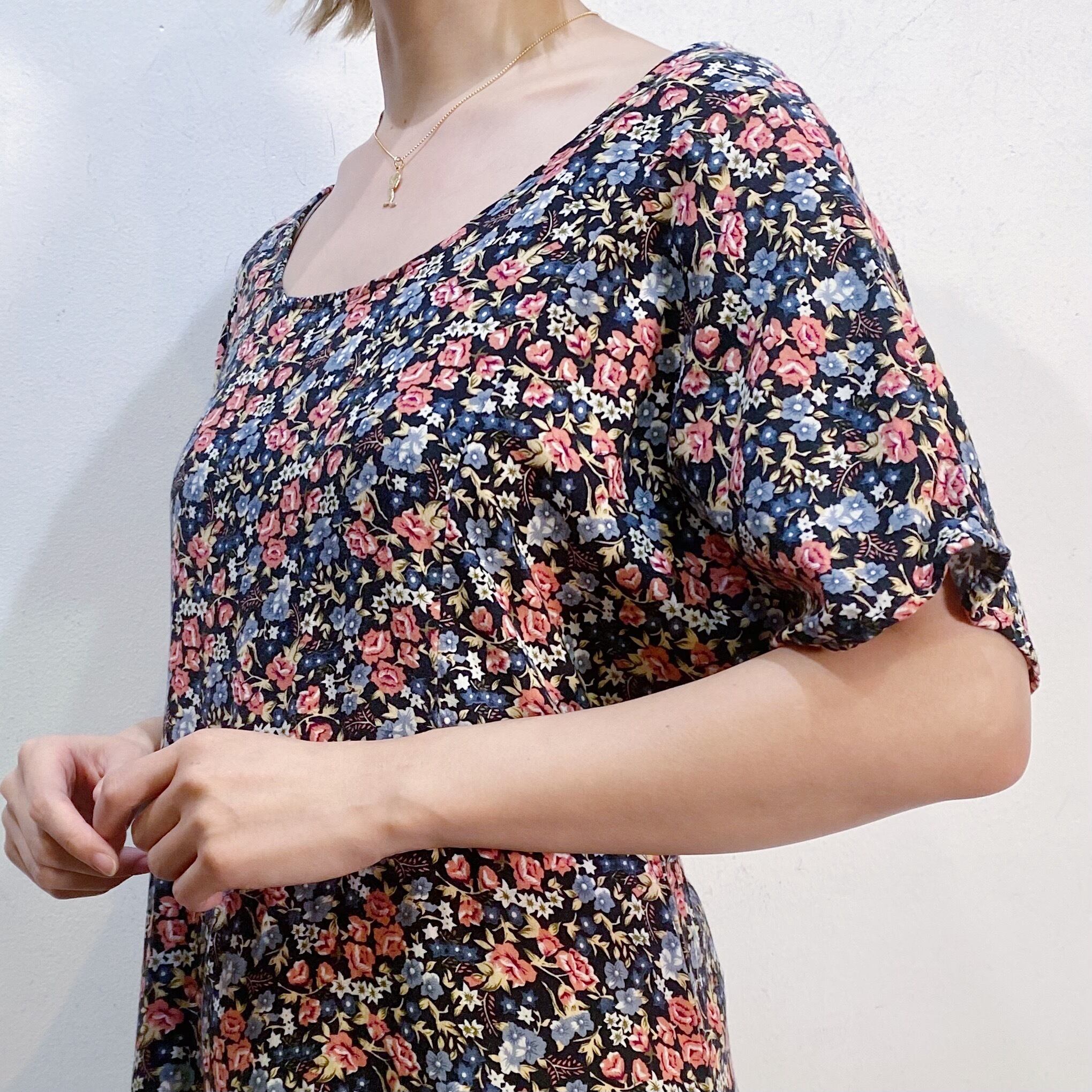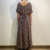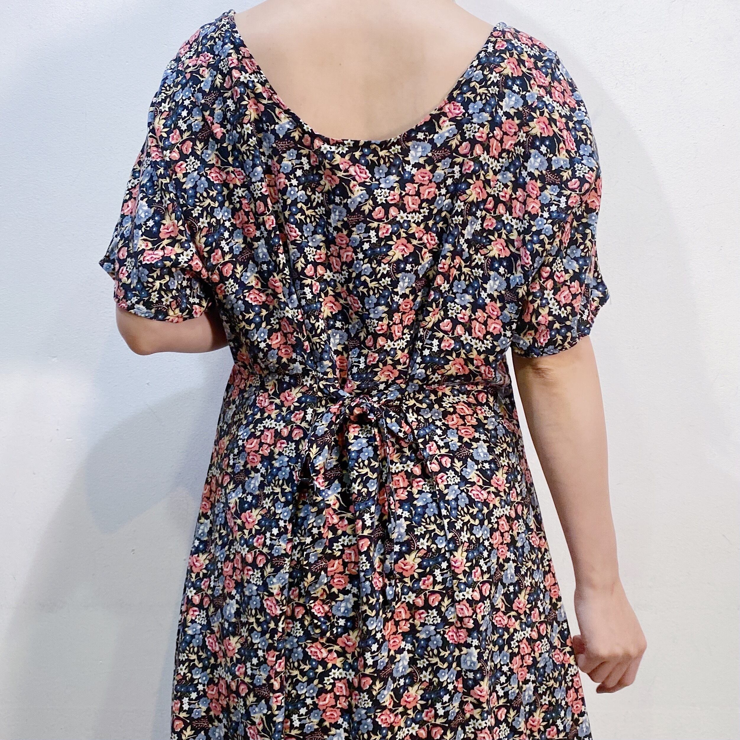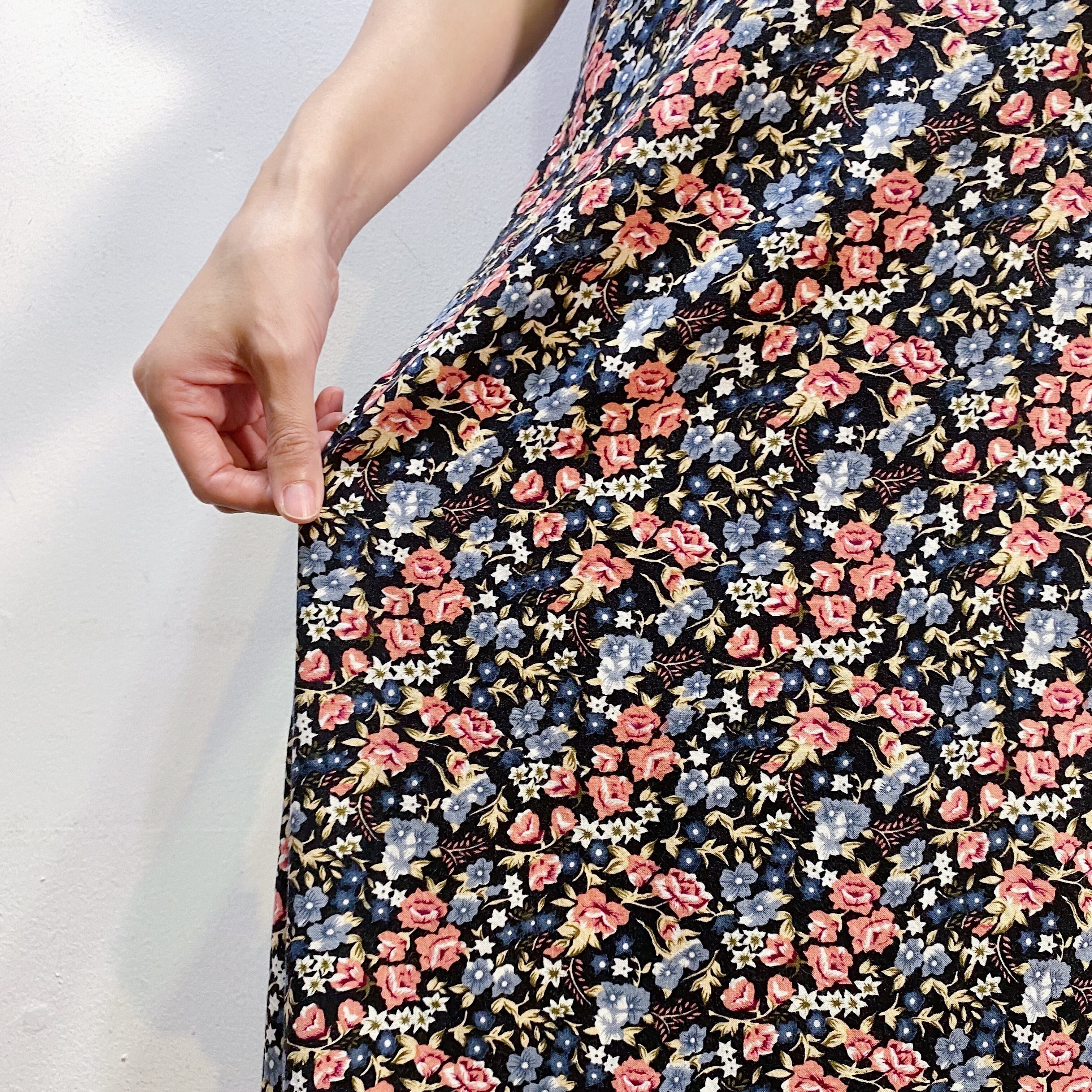 ブラックベースにピンクや水色の花柄が可愛い、80年代のワンピースです。