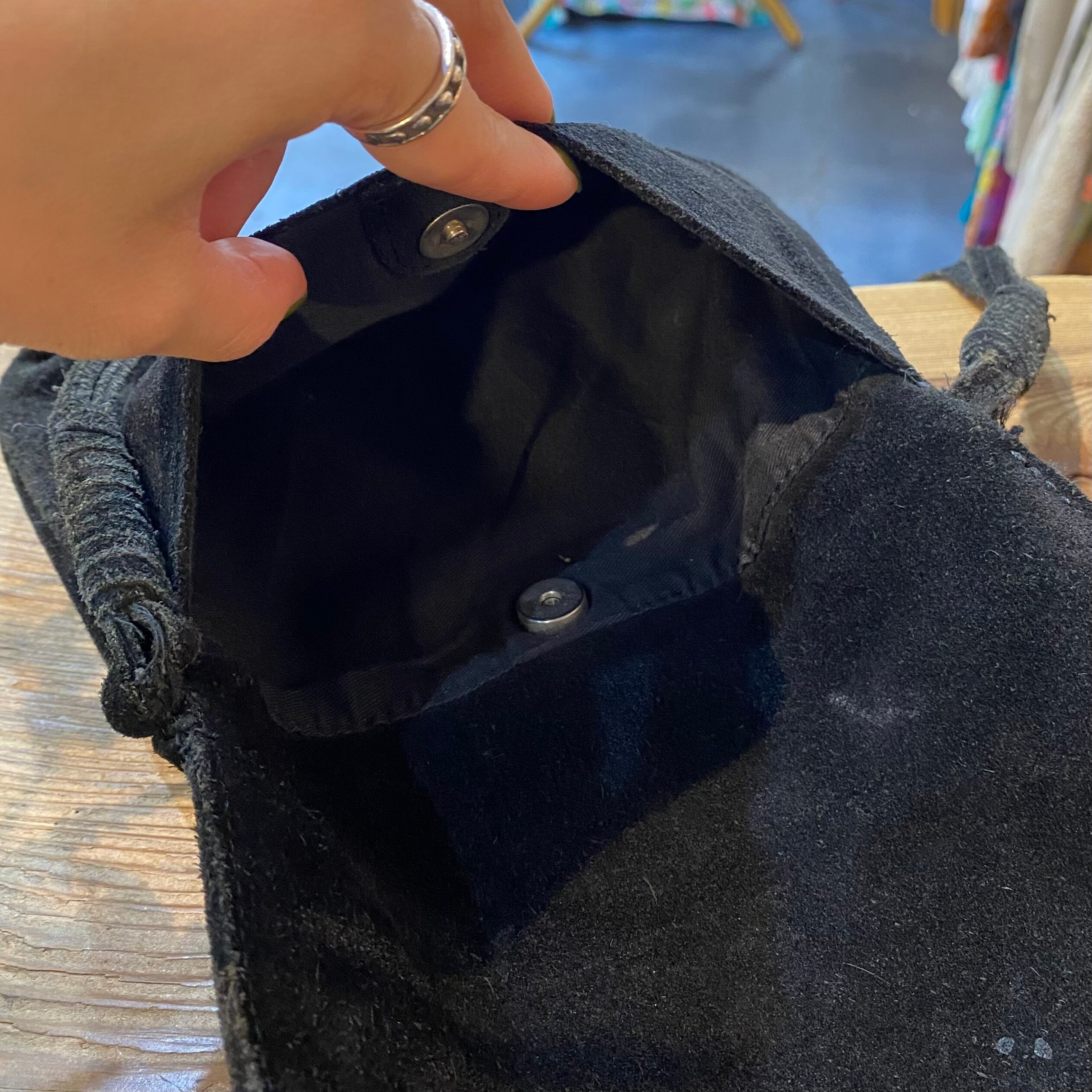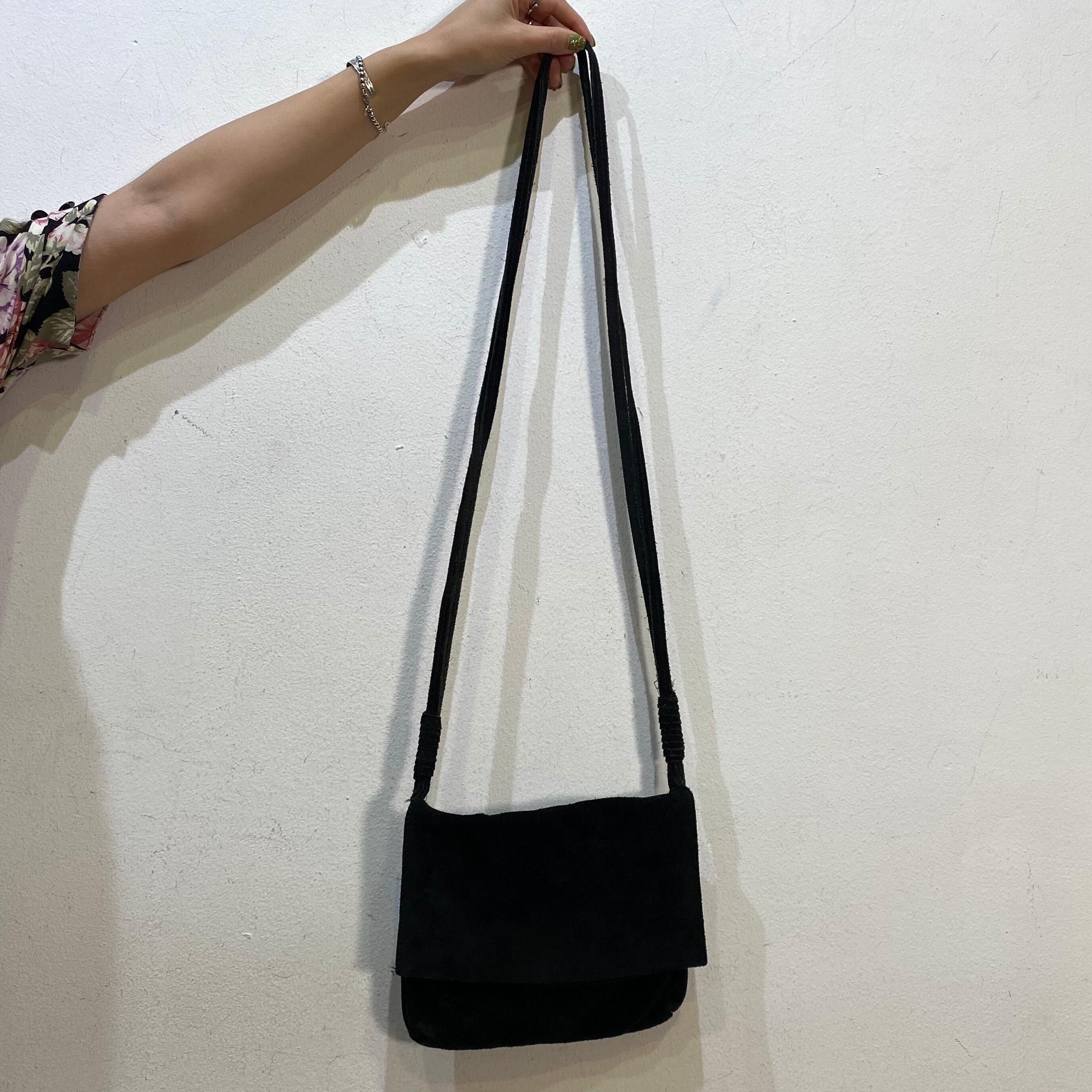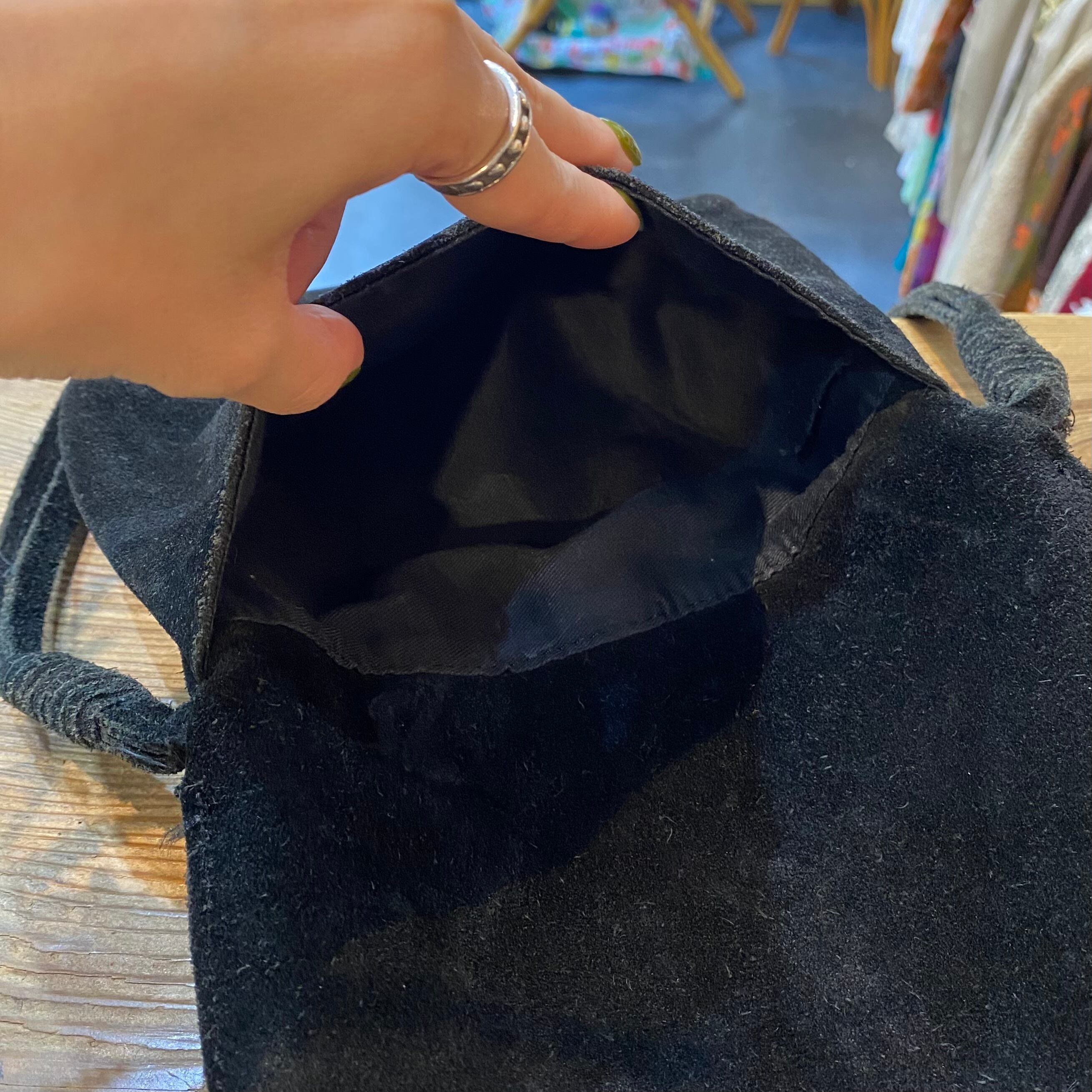 ブラックカラーでコーディネートに取り入れやすい、スエードのポシェットです。