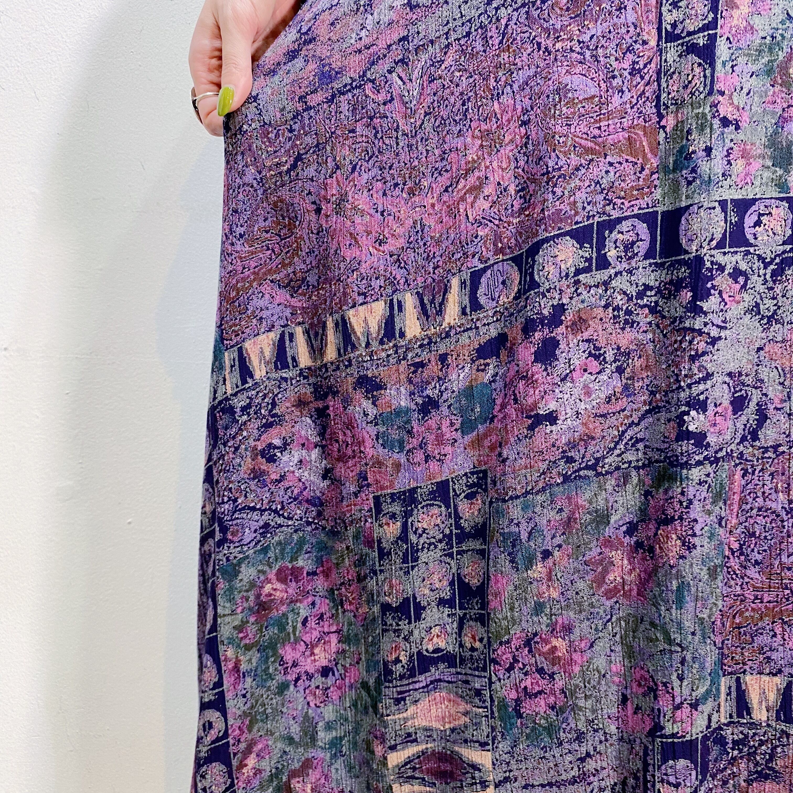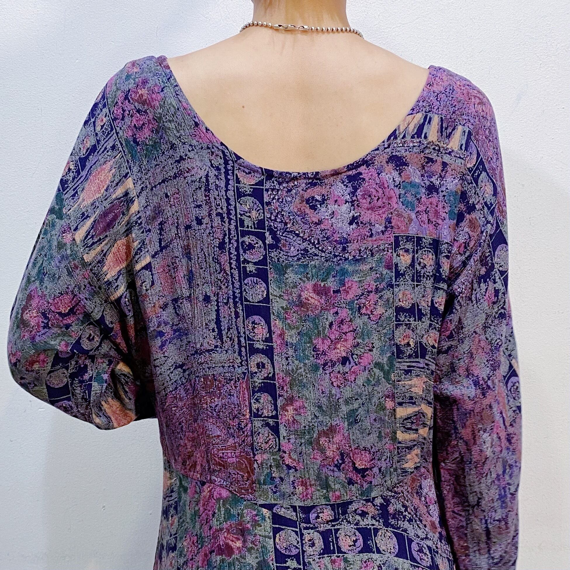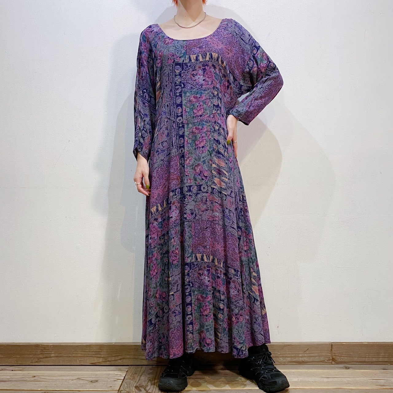 パープルやネイビー、グリーンなどの色合いが可愛い、とろんとしたレーヨン素材のワンピースです。