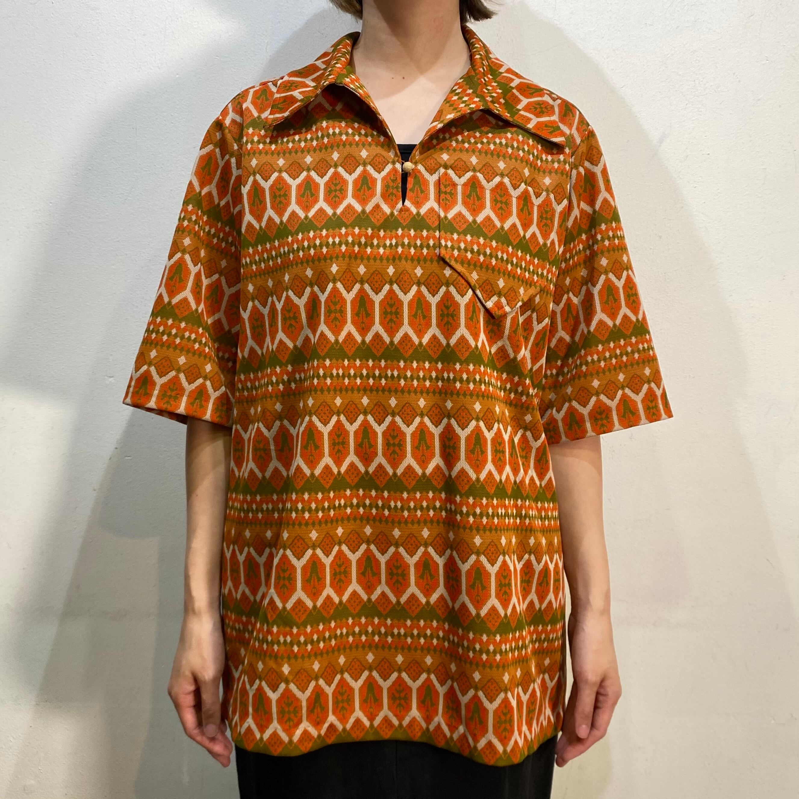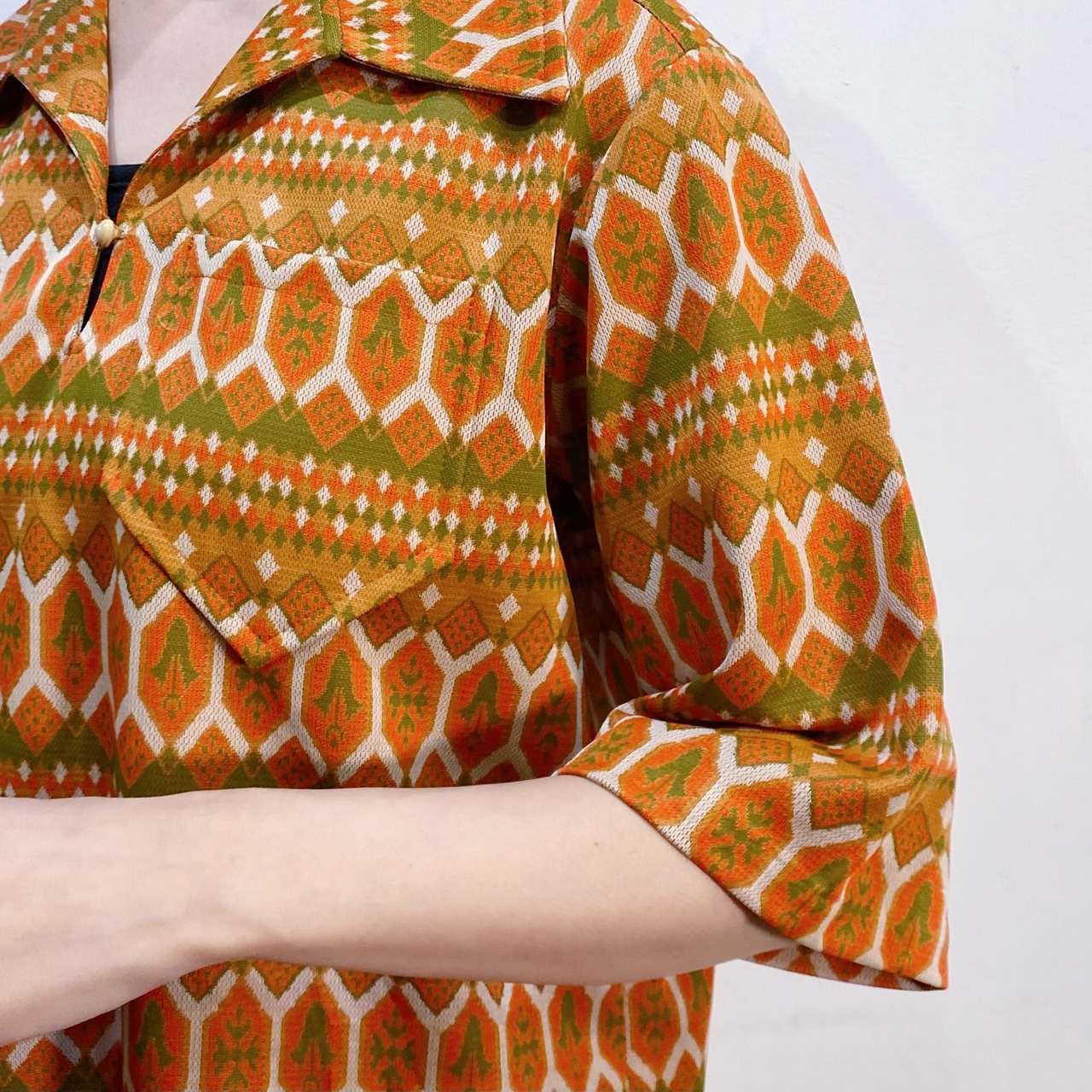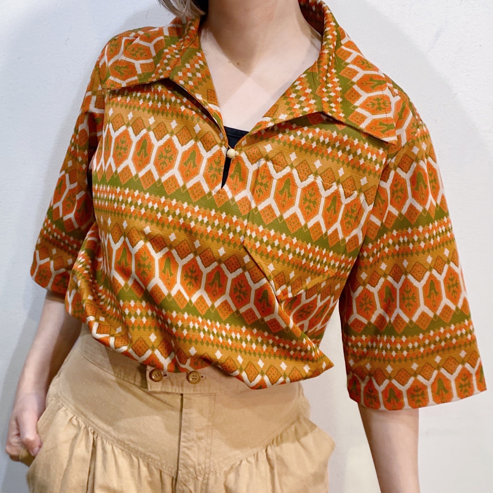 海外の壁紙や絨毯のようなテキスタイルが素敵な、70年代のトップスです。