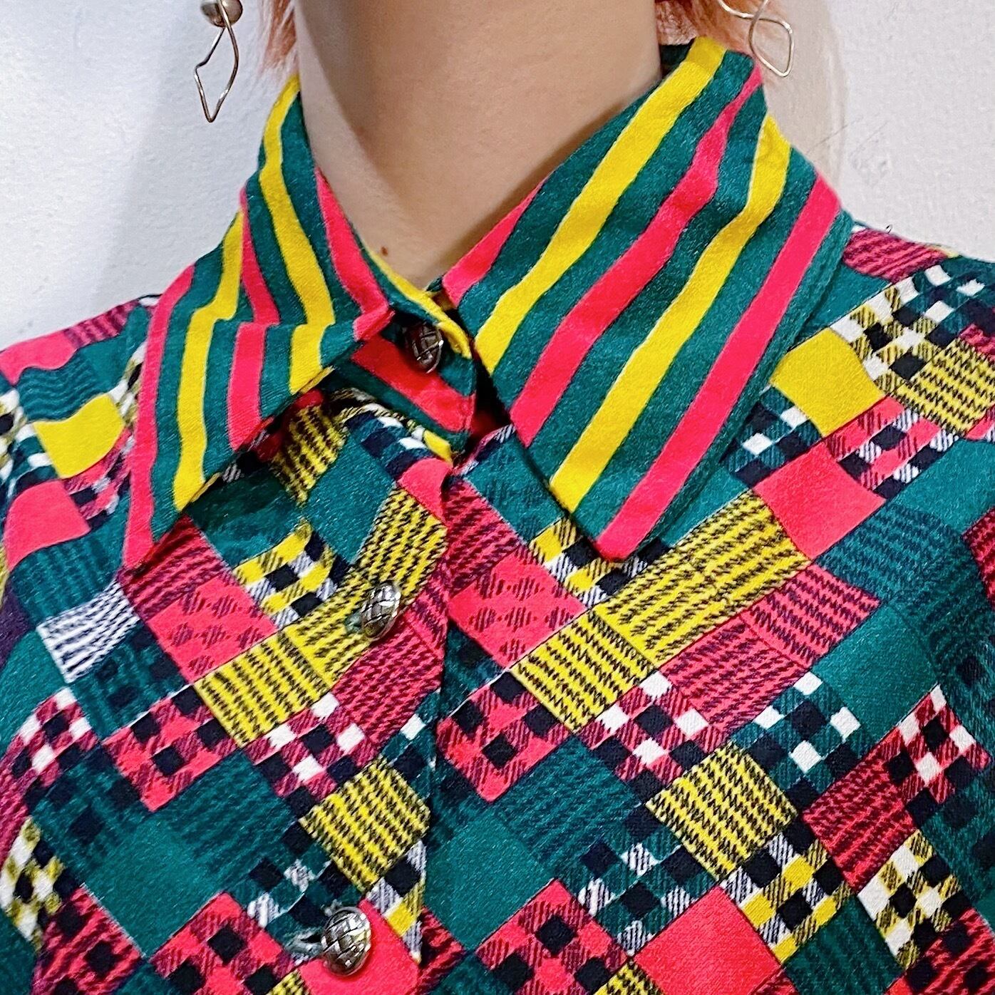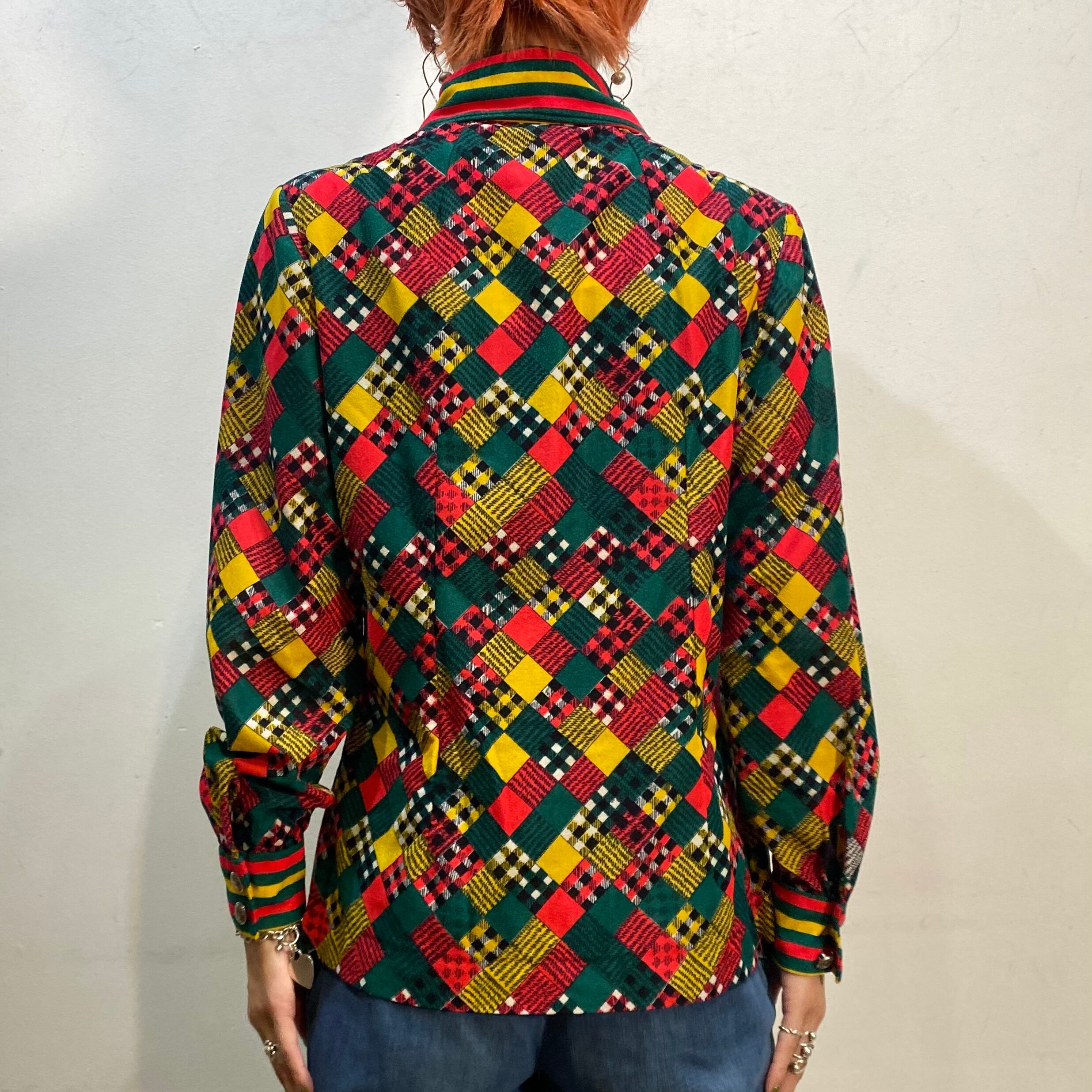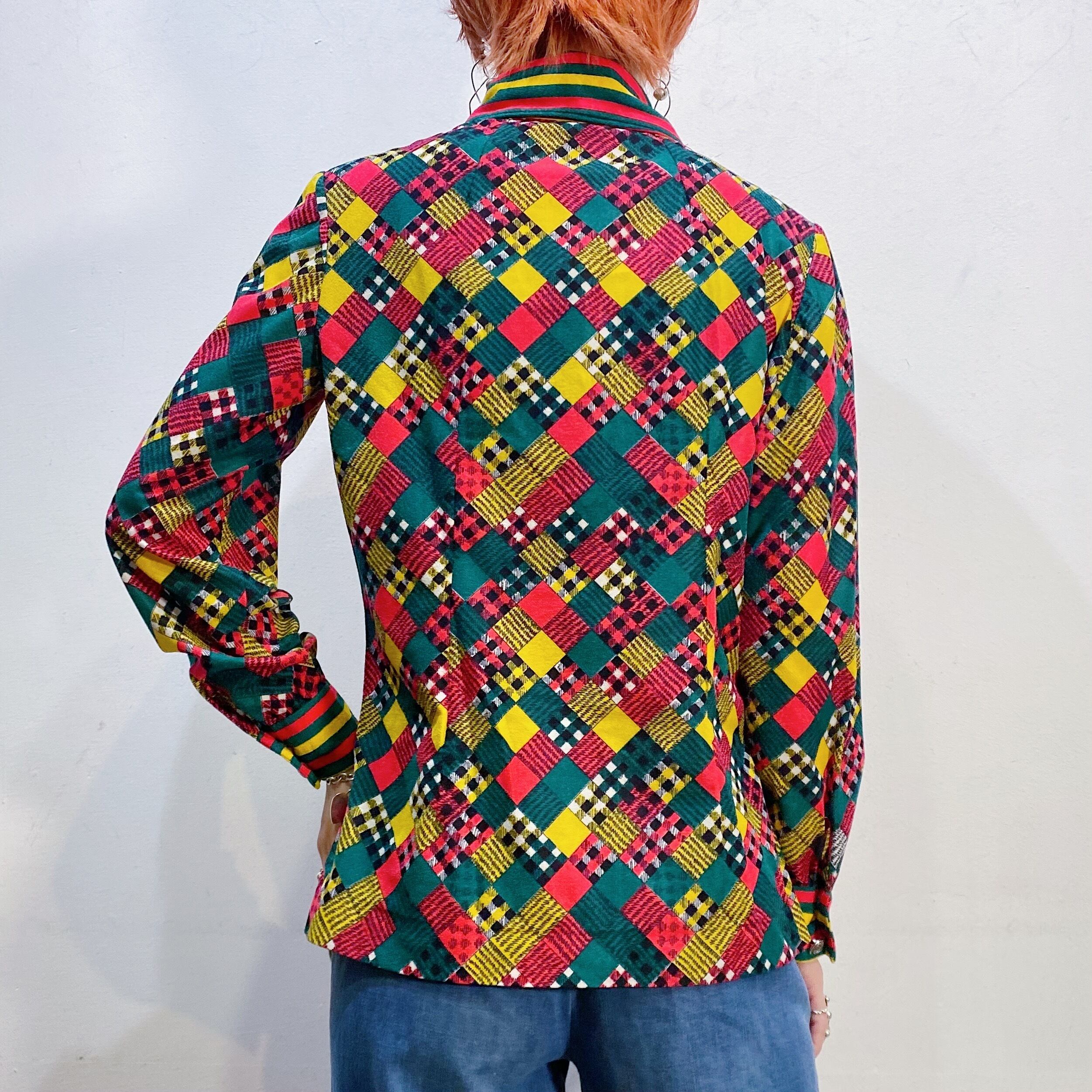 ダイヤ柄の中にチェック柄がある中々珍しい柄がオシャレな70年代の長袖シャツです。