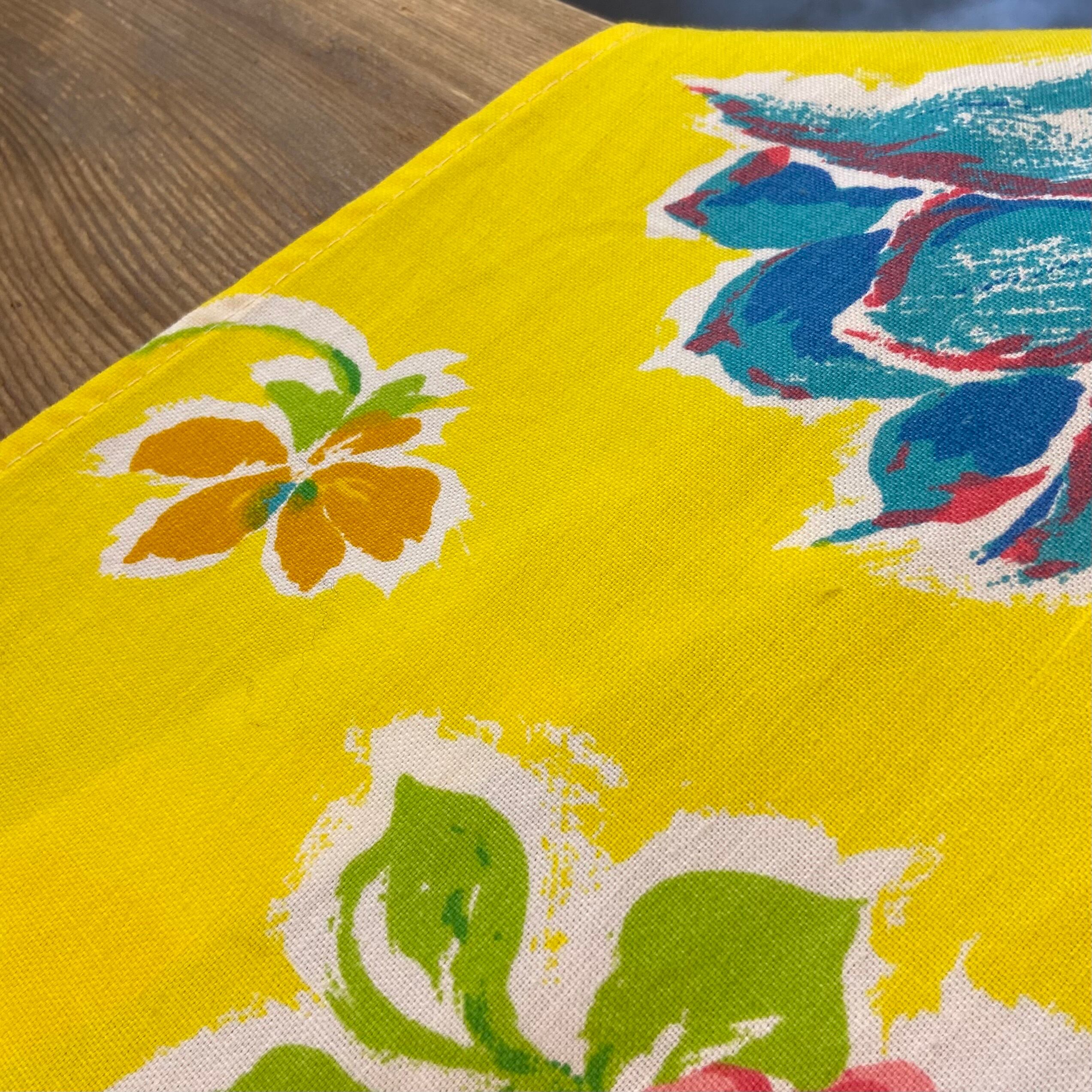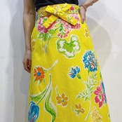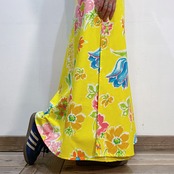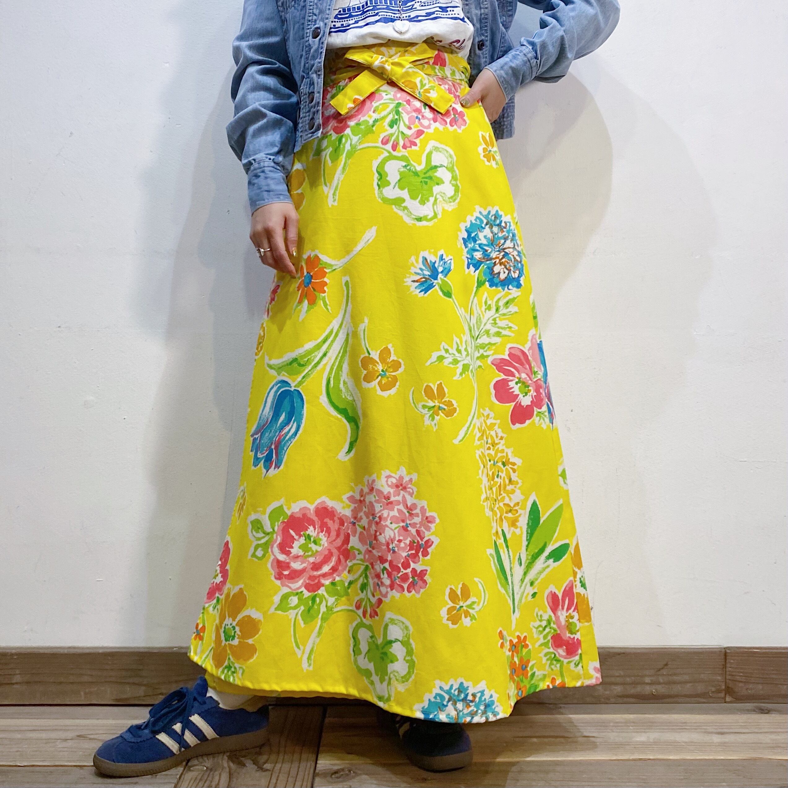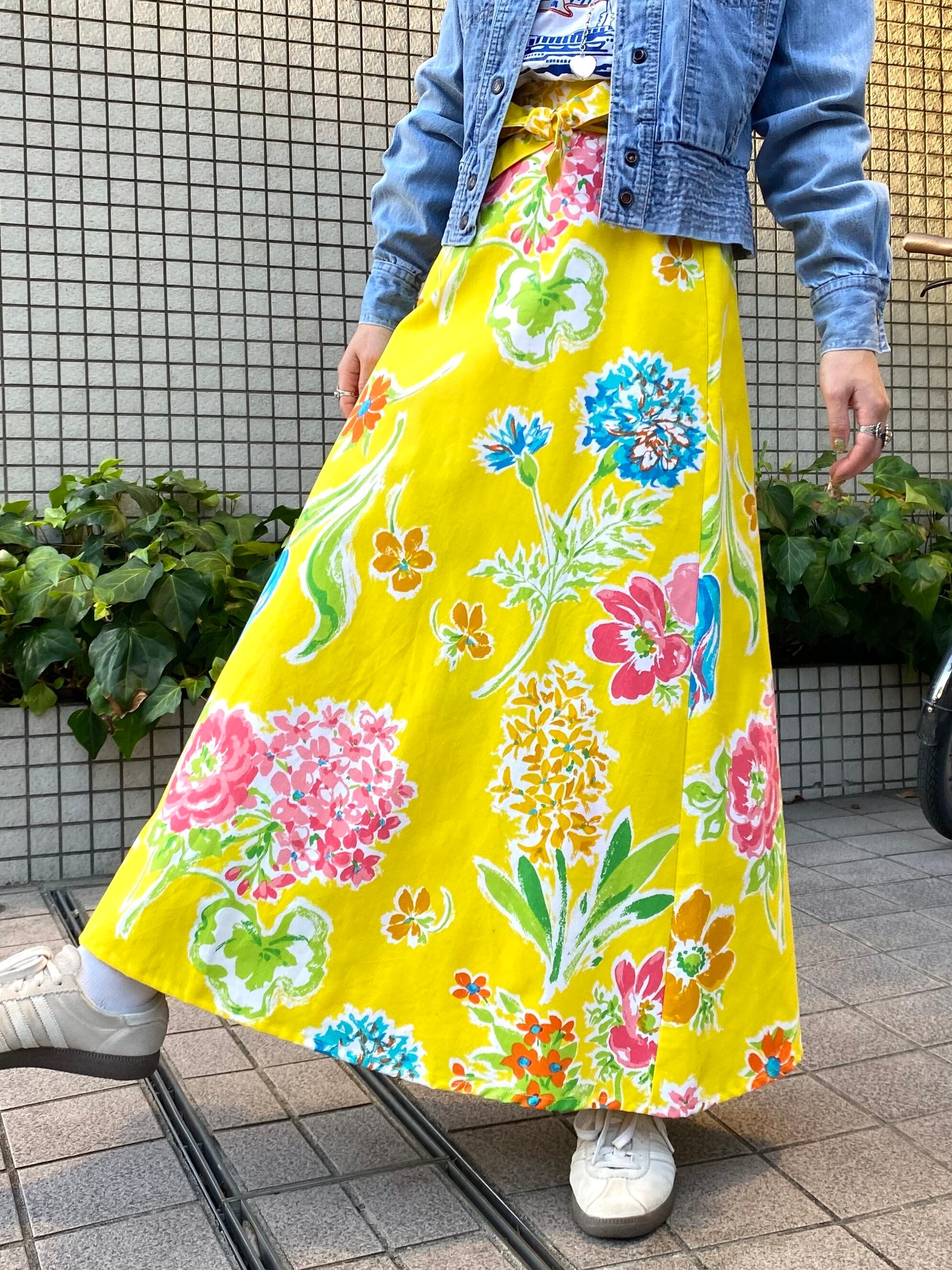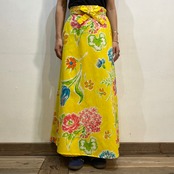 ハッピーなイエローベースに手書きタッチのカラフルなお花柄が可愛い、70年代のラップスカートです。
