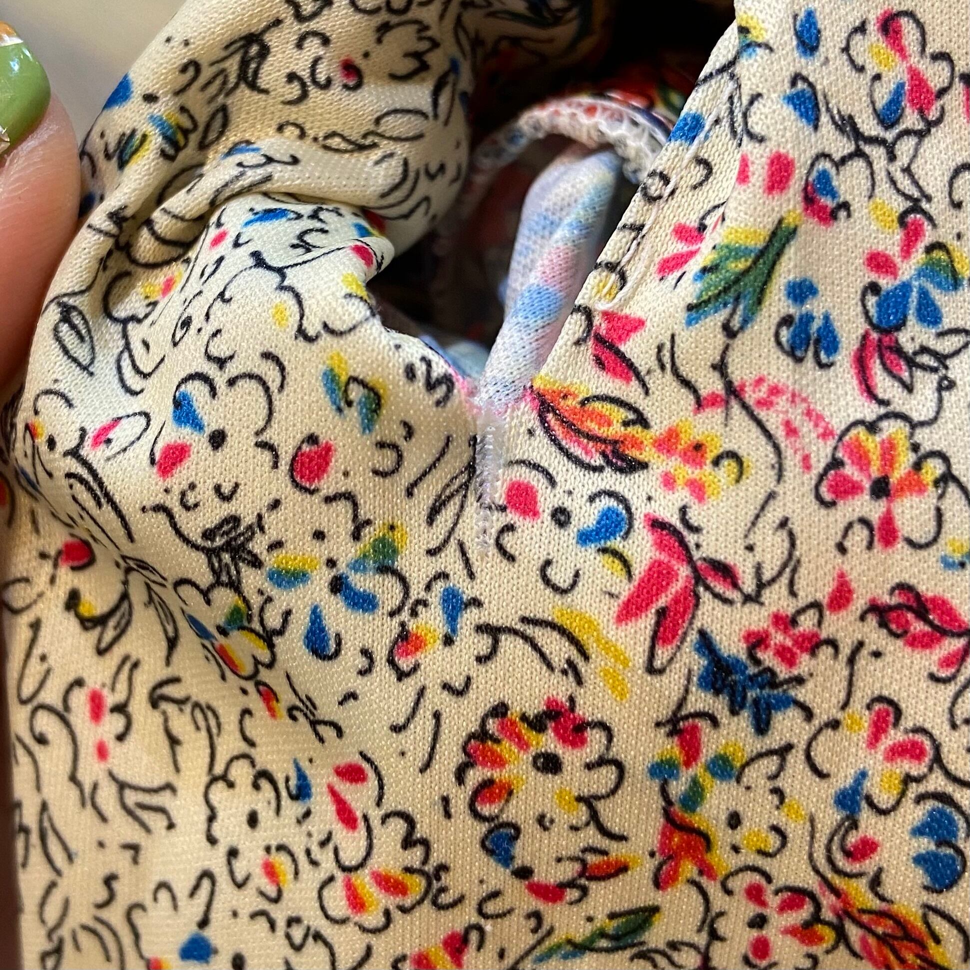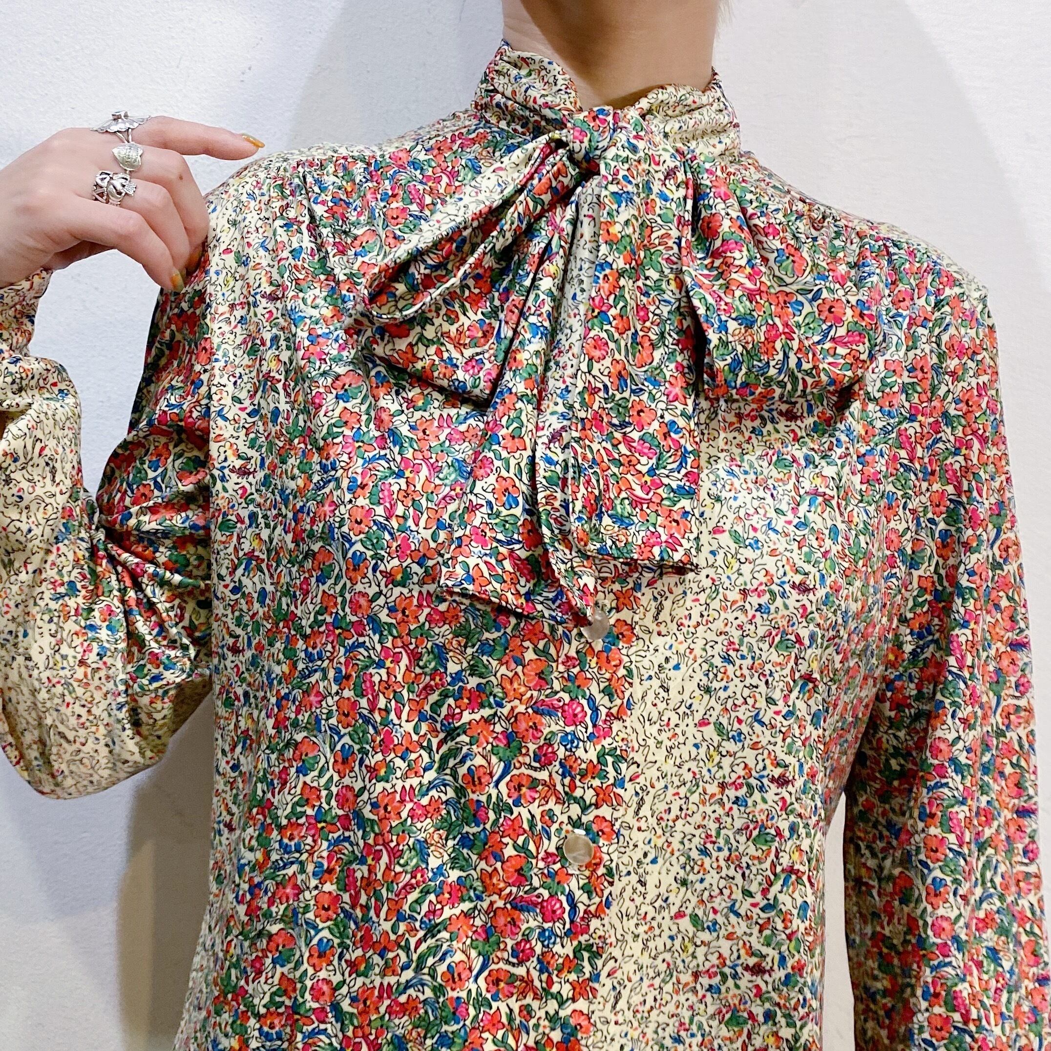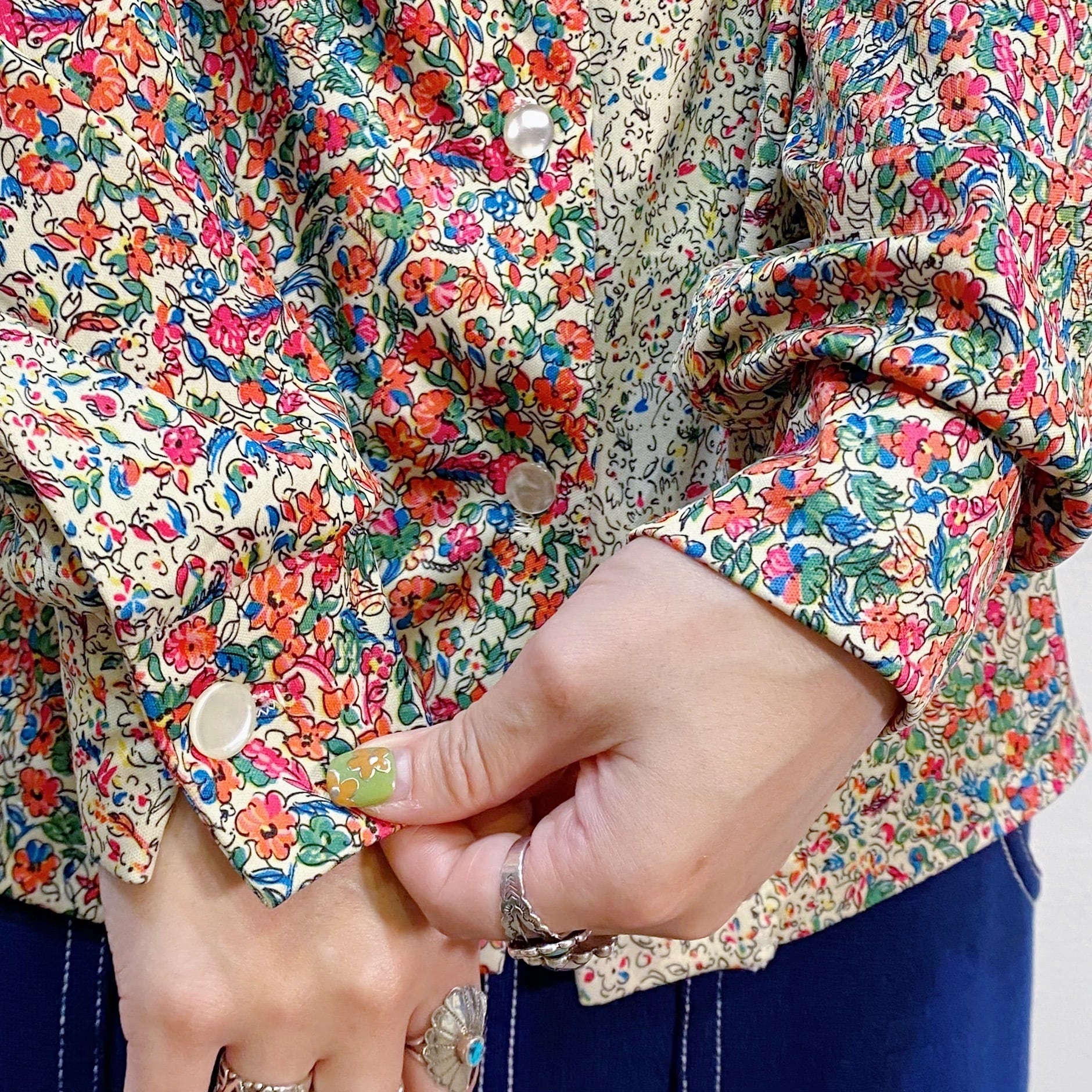 手書きタッチでレインボーカラーの小さな花柄が可愛い、70年代の長袖シャツです。