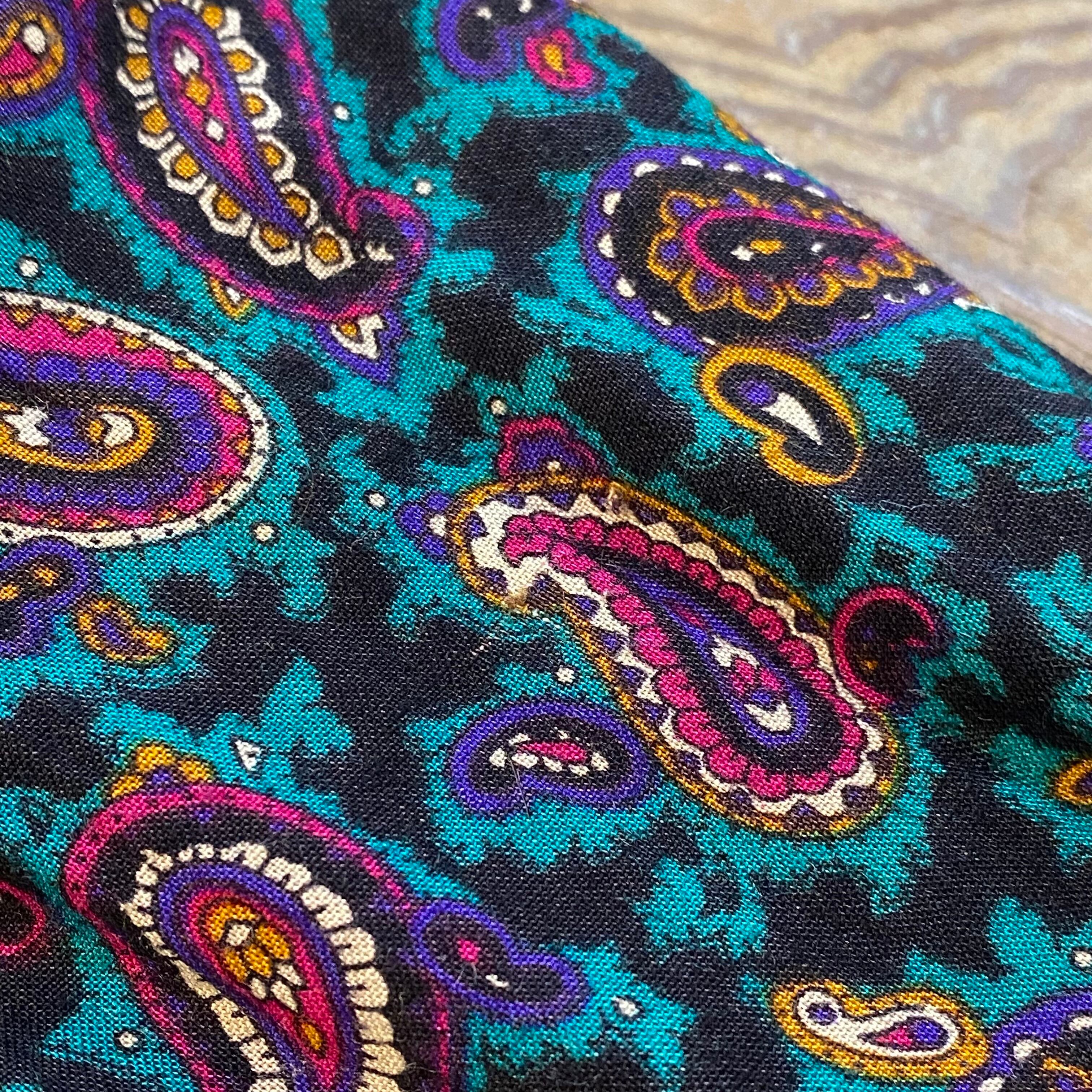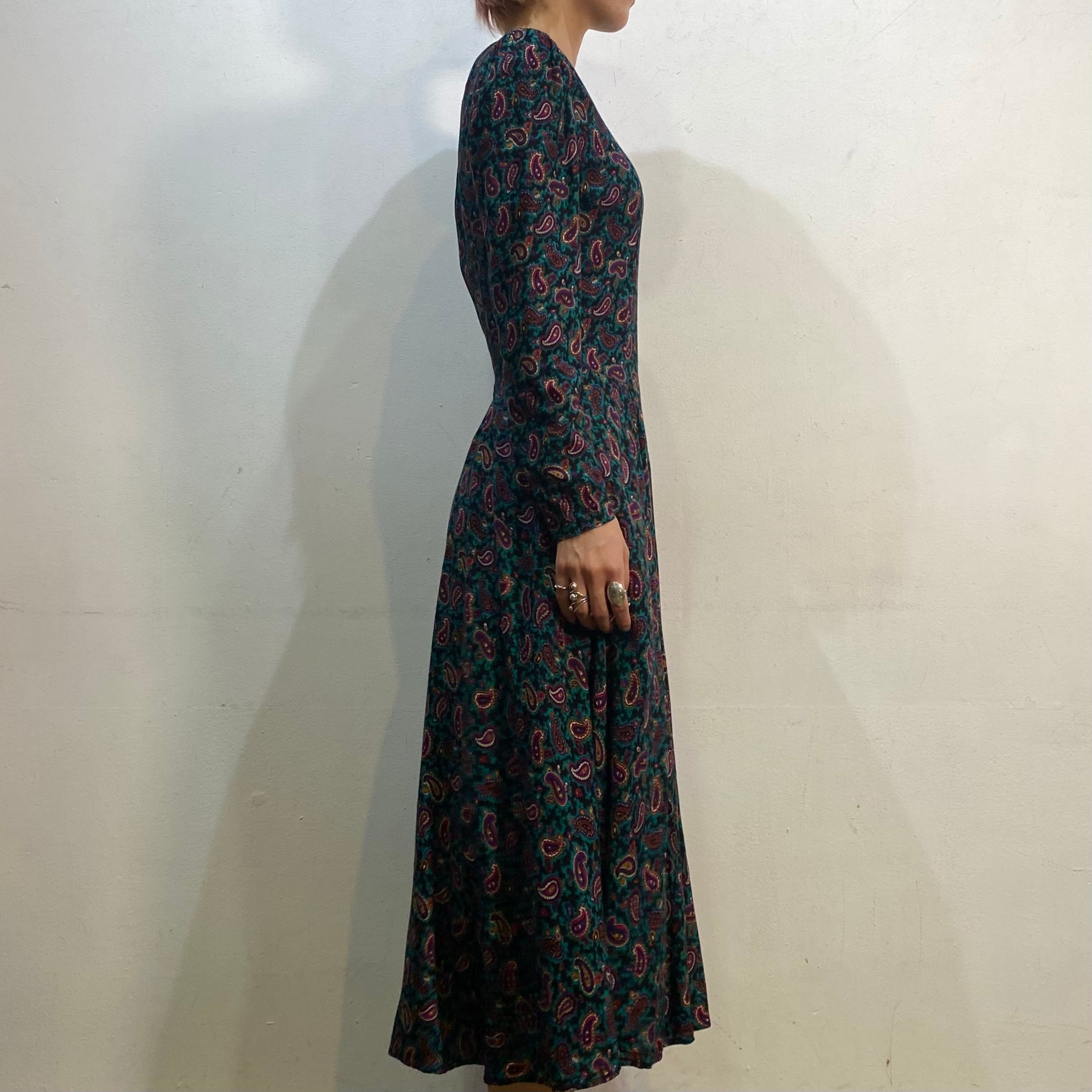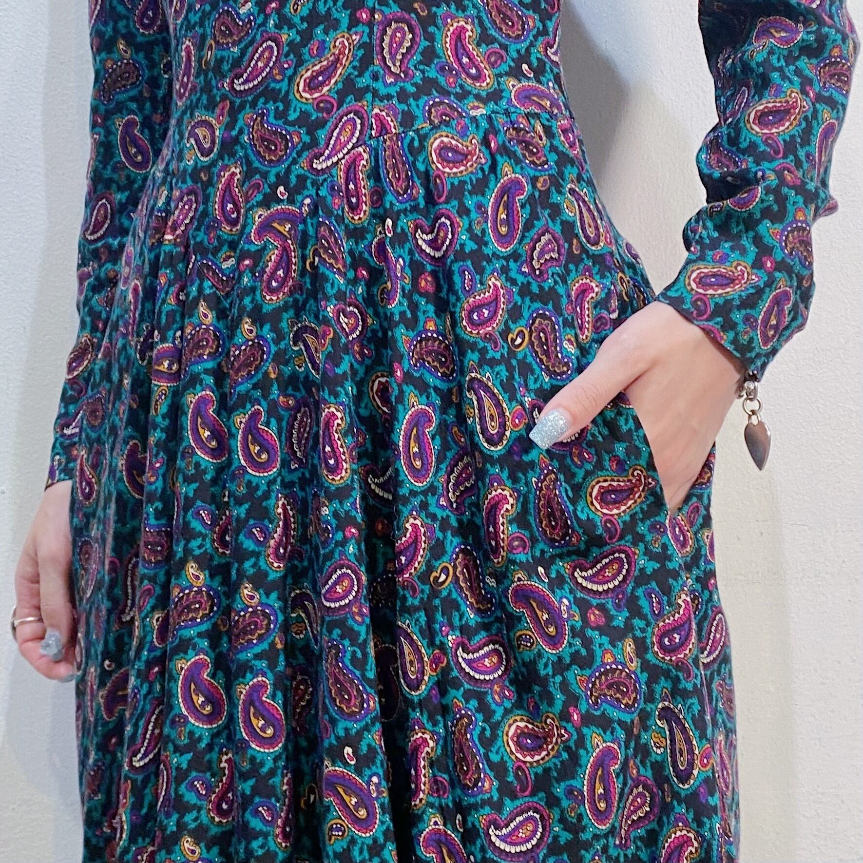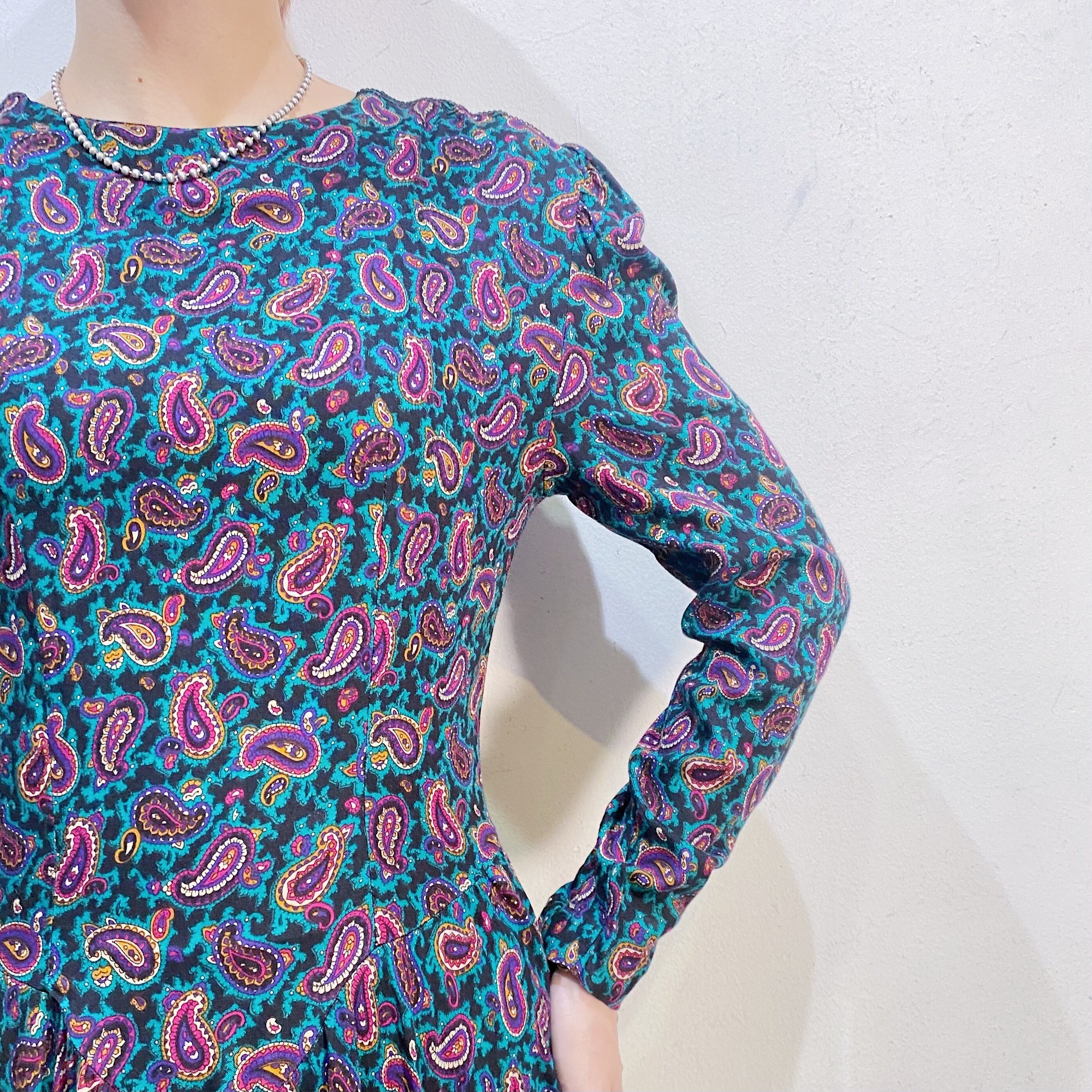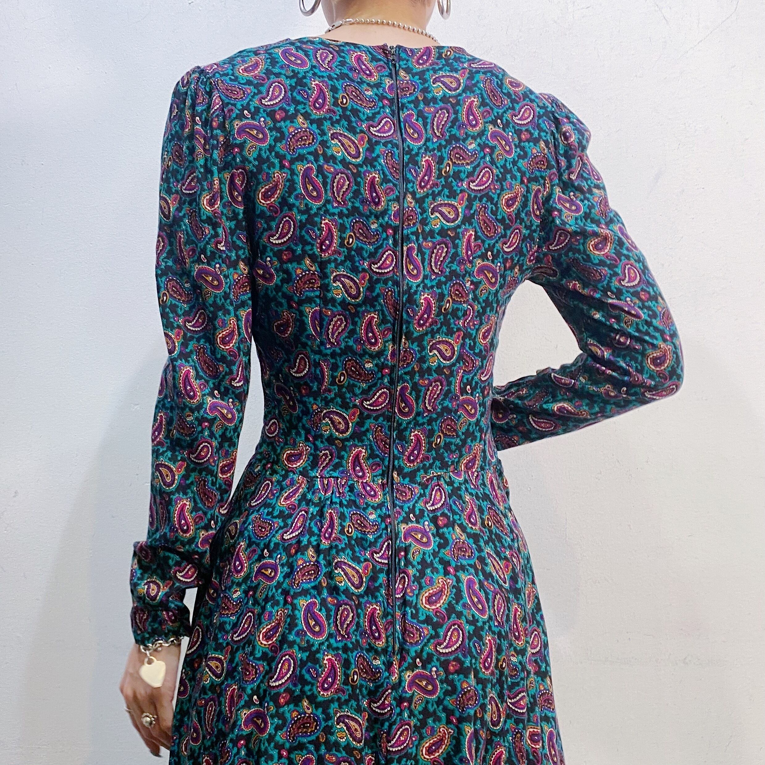 グリーンベースのペイズリー柄が可愛い、80年代のワンピースです。