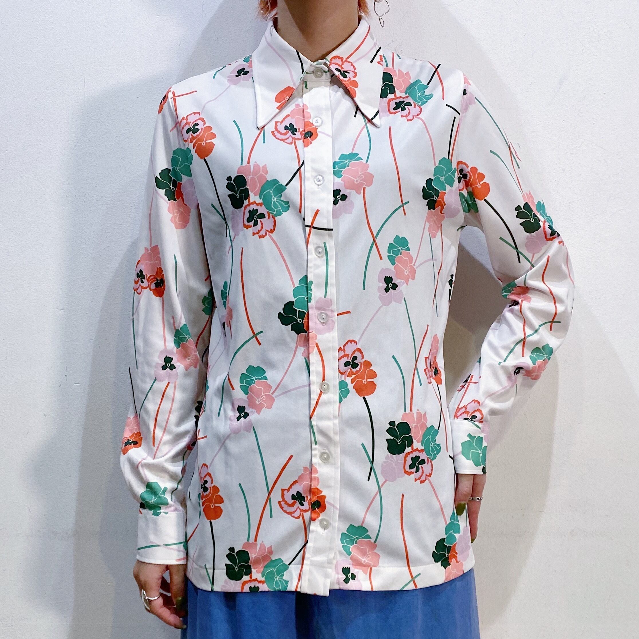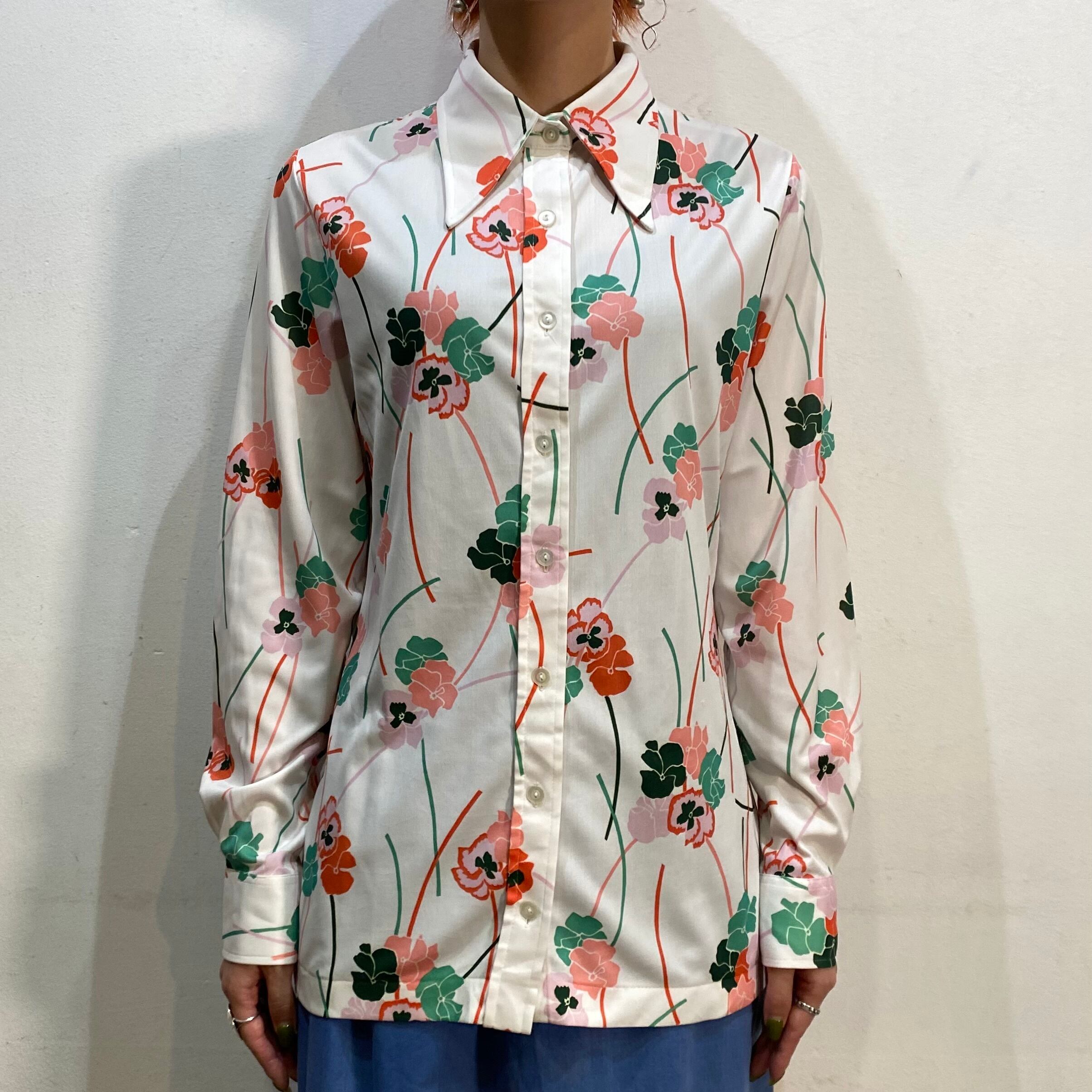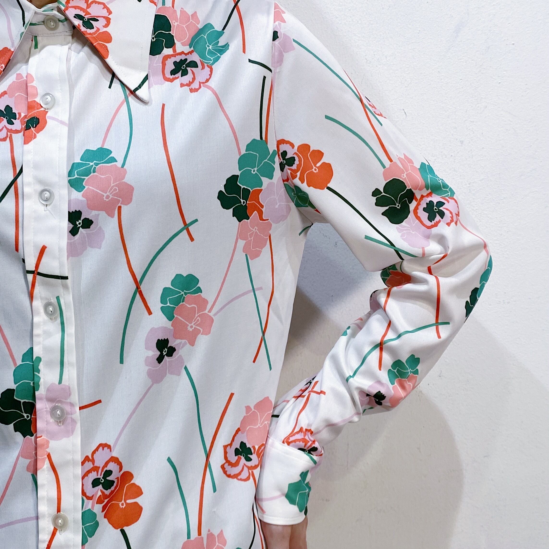 グリーンやピンクのお花の総柄が可愛い、70年代の長袖シャツです。