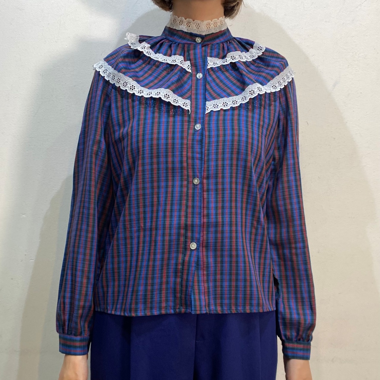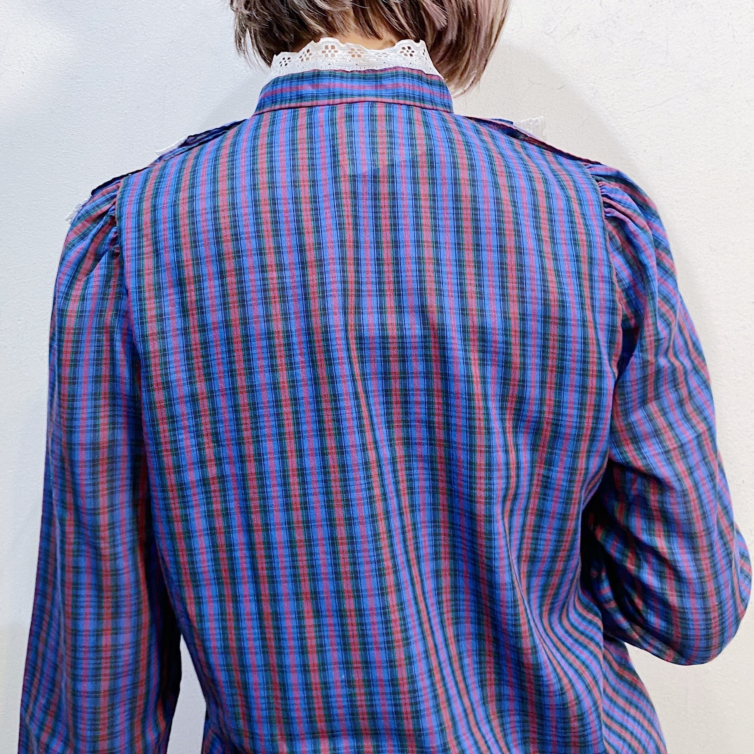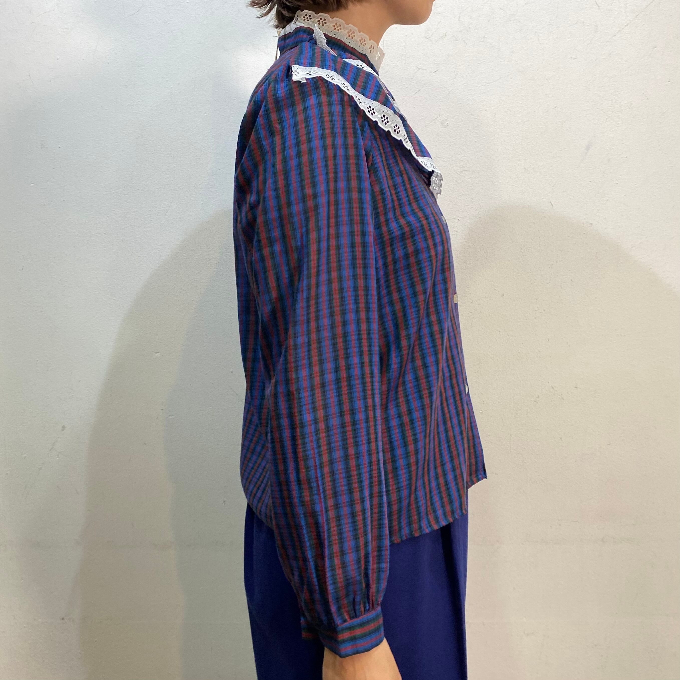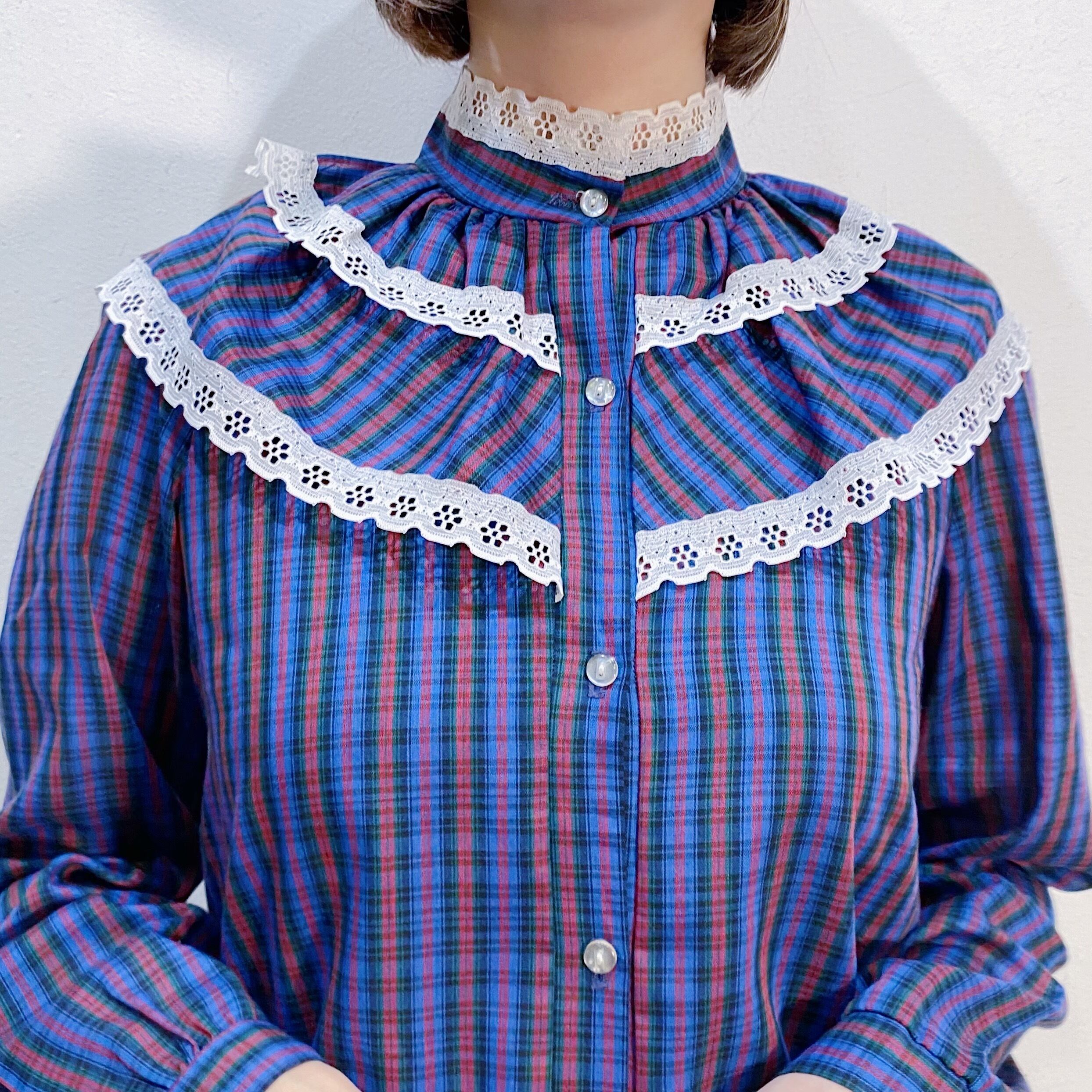 80s blue plaid lace blouse