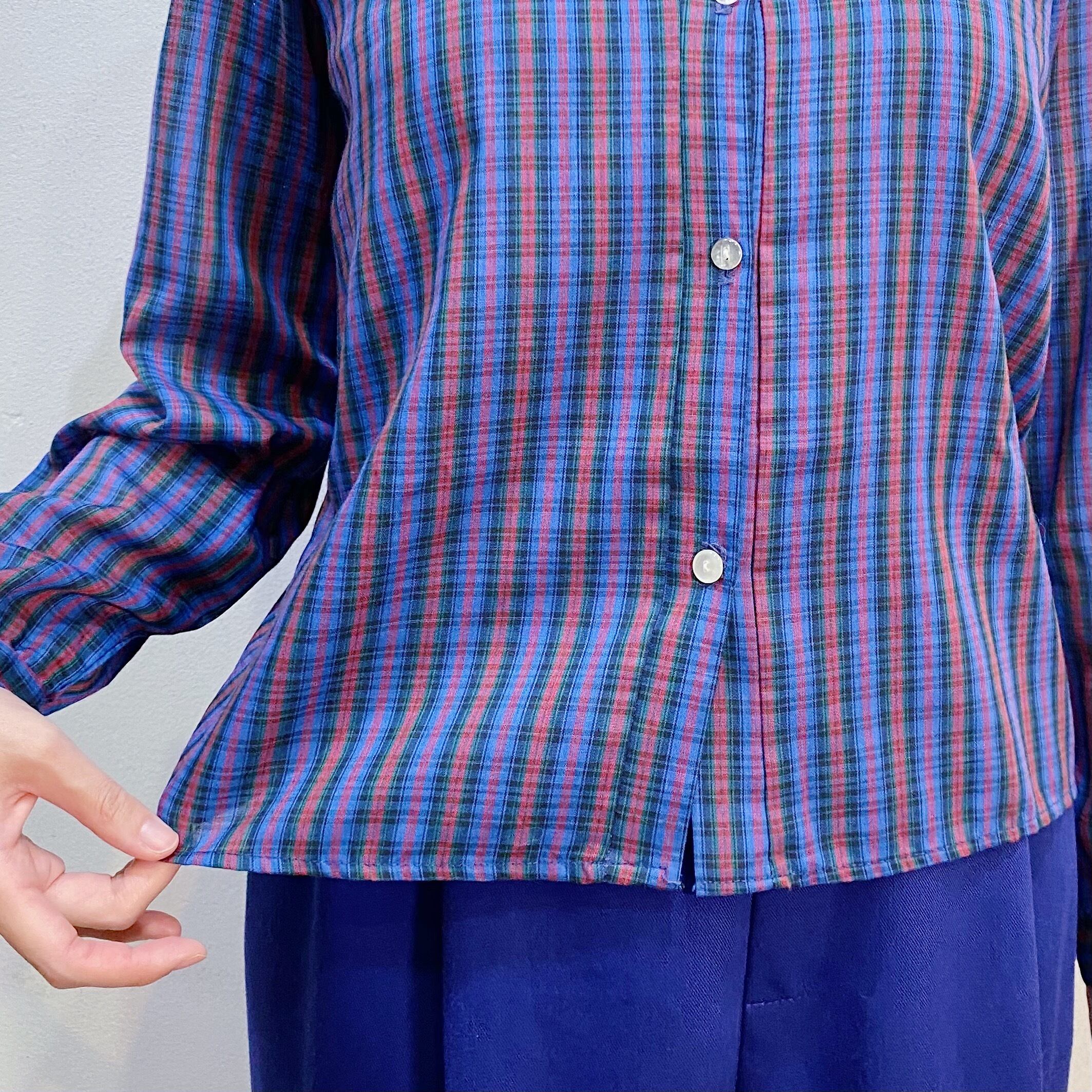 落ち着いた色合いのブルーチェックで、甘くなりすぎずに着ていただけますよ。