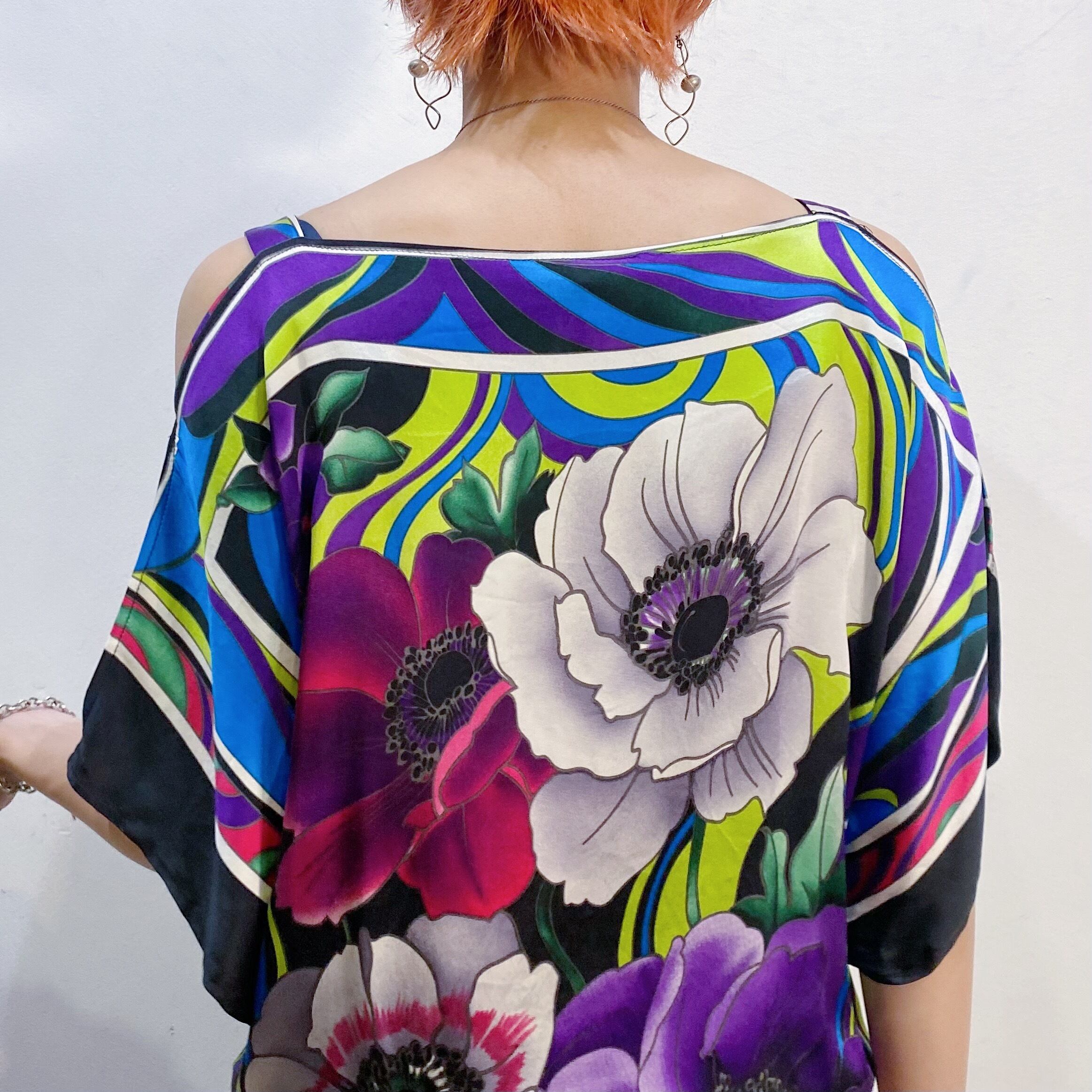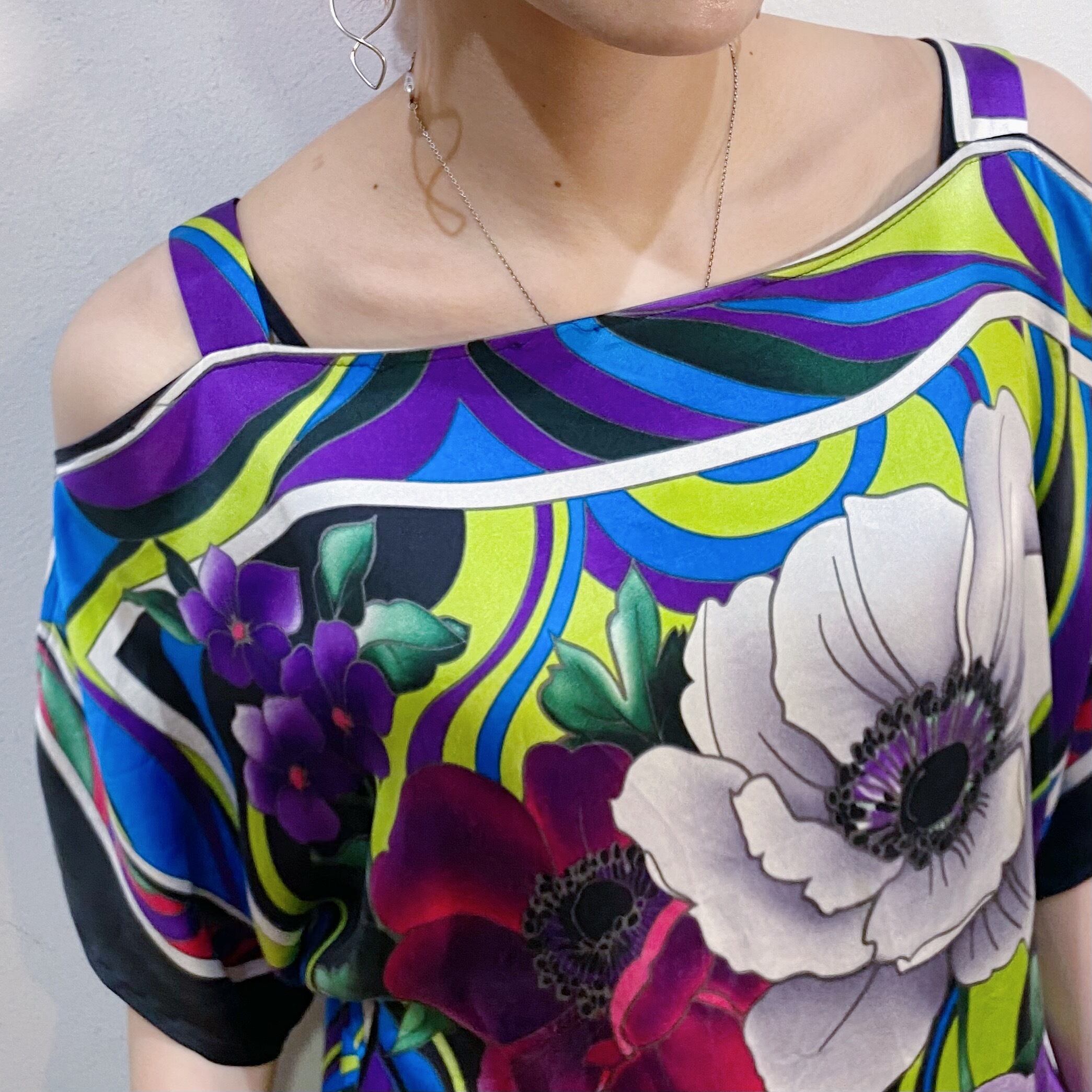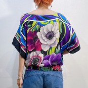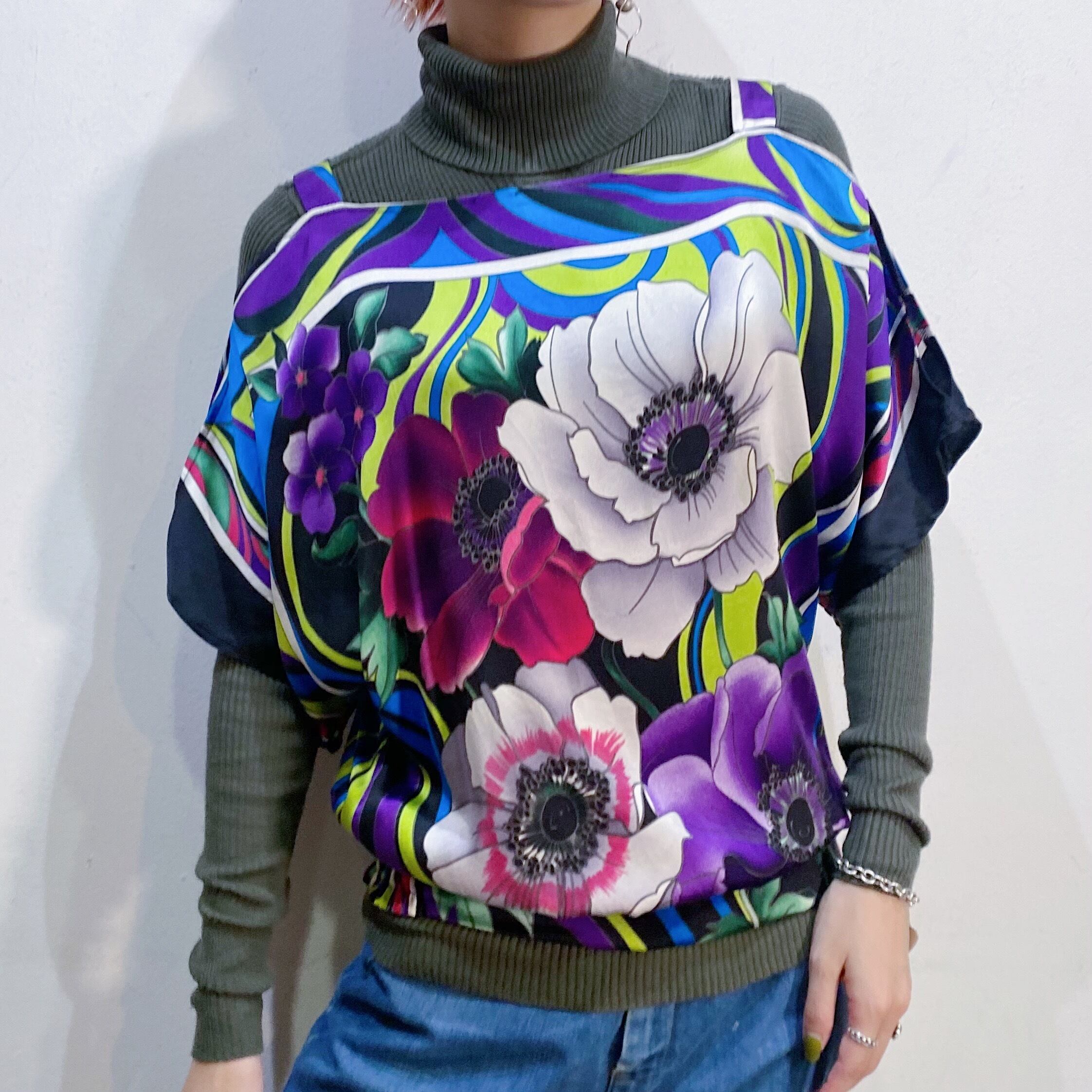 サイケな色合いに大胆な花柄が可愛い、シルク素材のトップスです。