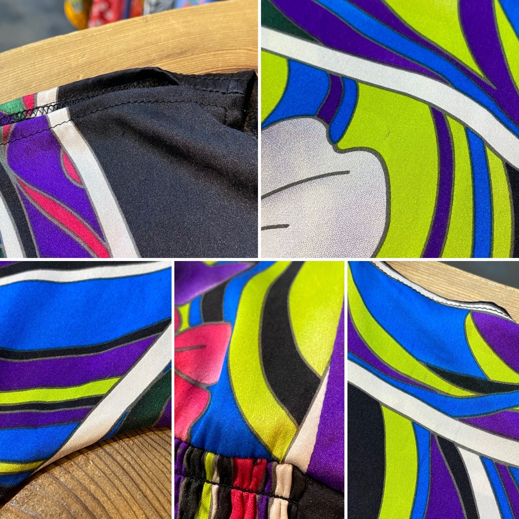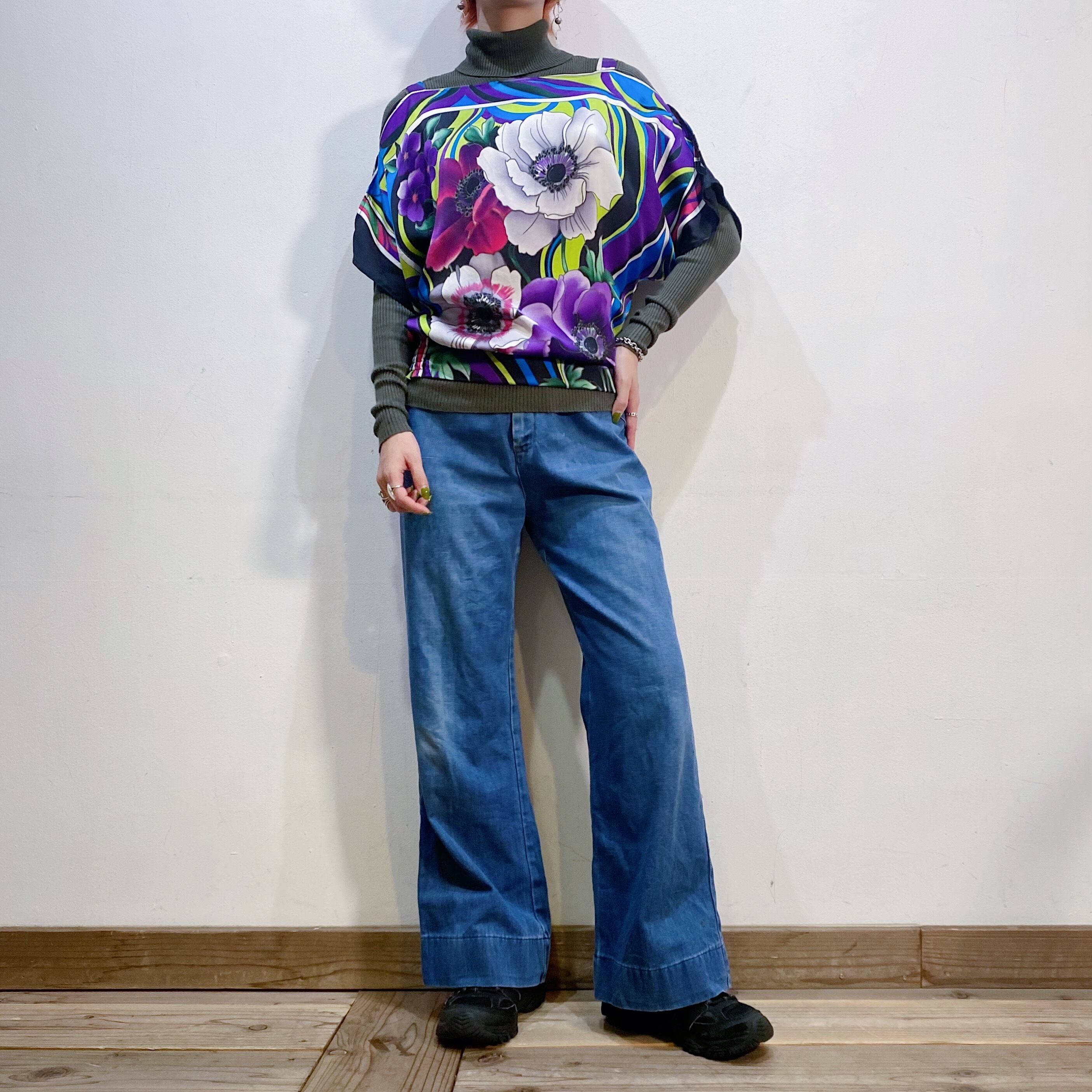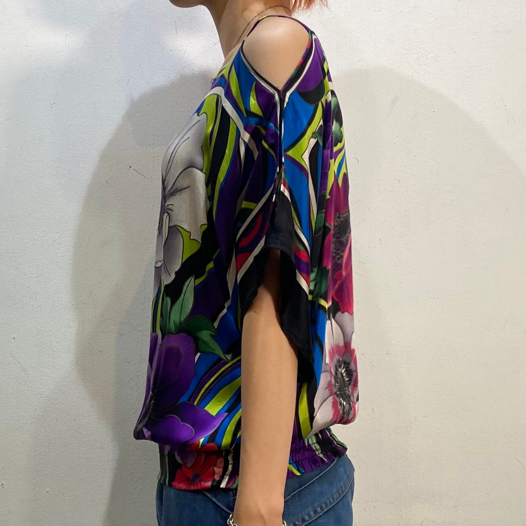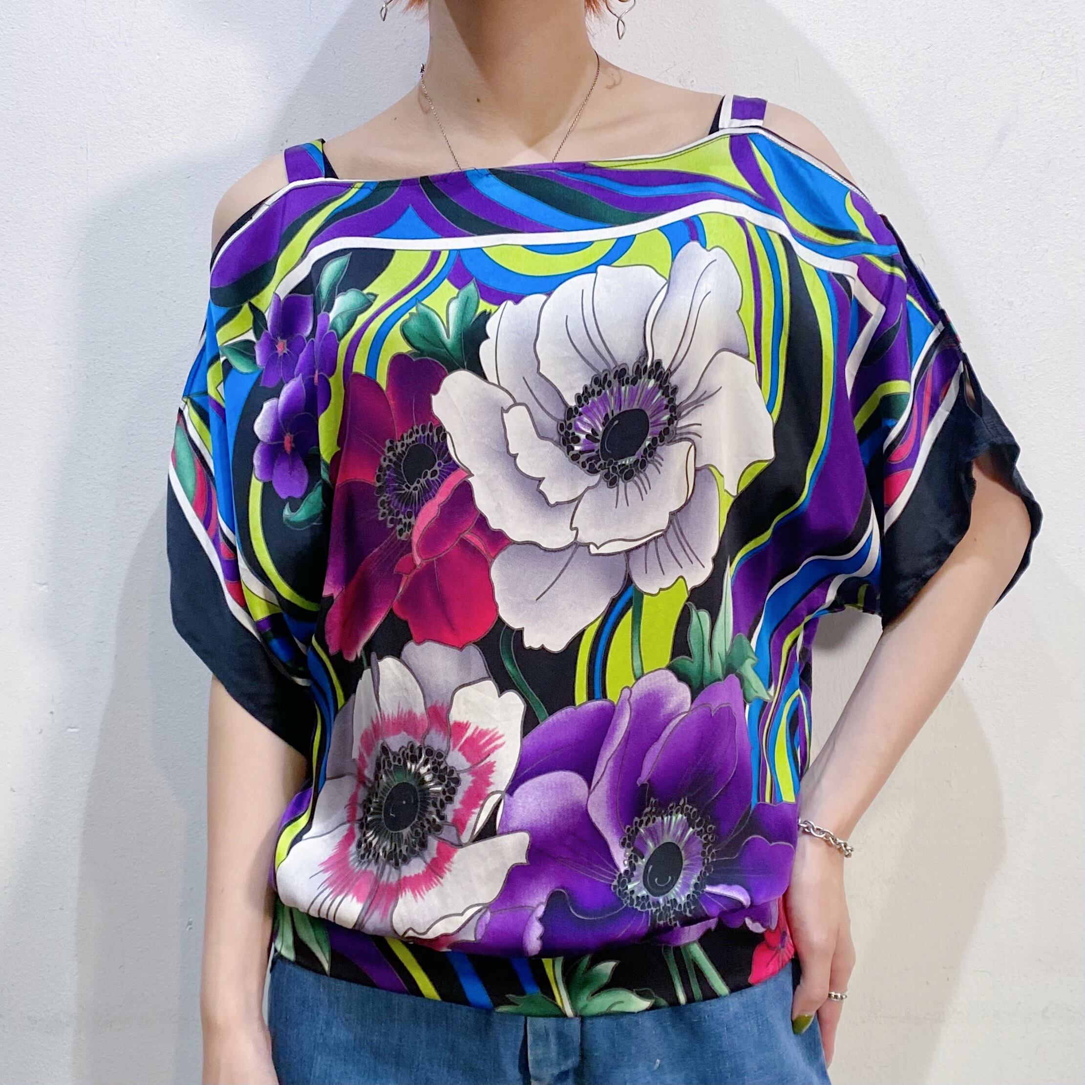サイケな色合いに大胆な花柄が可愛い、シルク素材のトップスです。