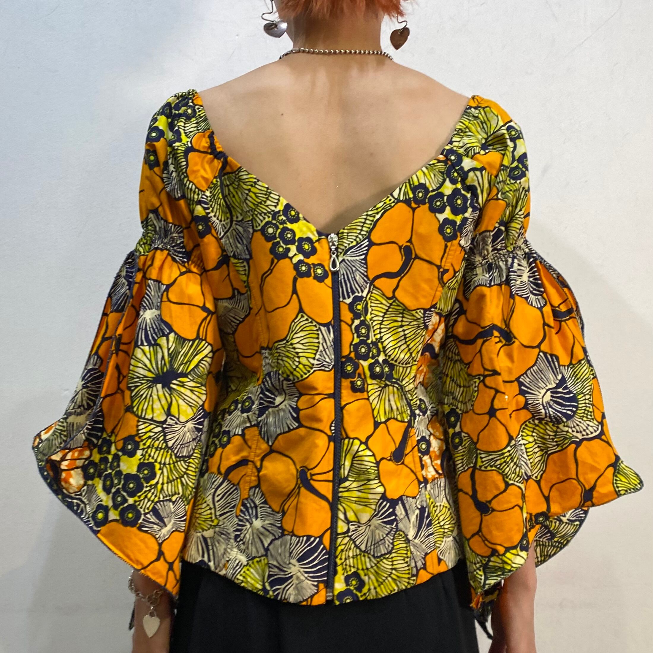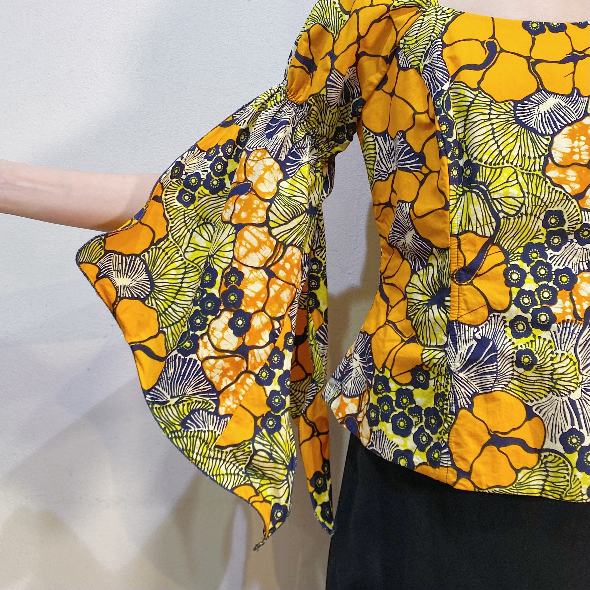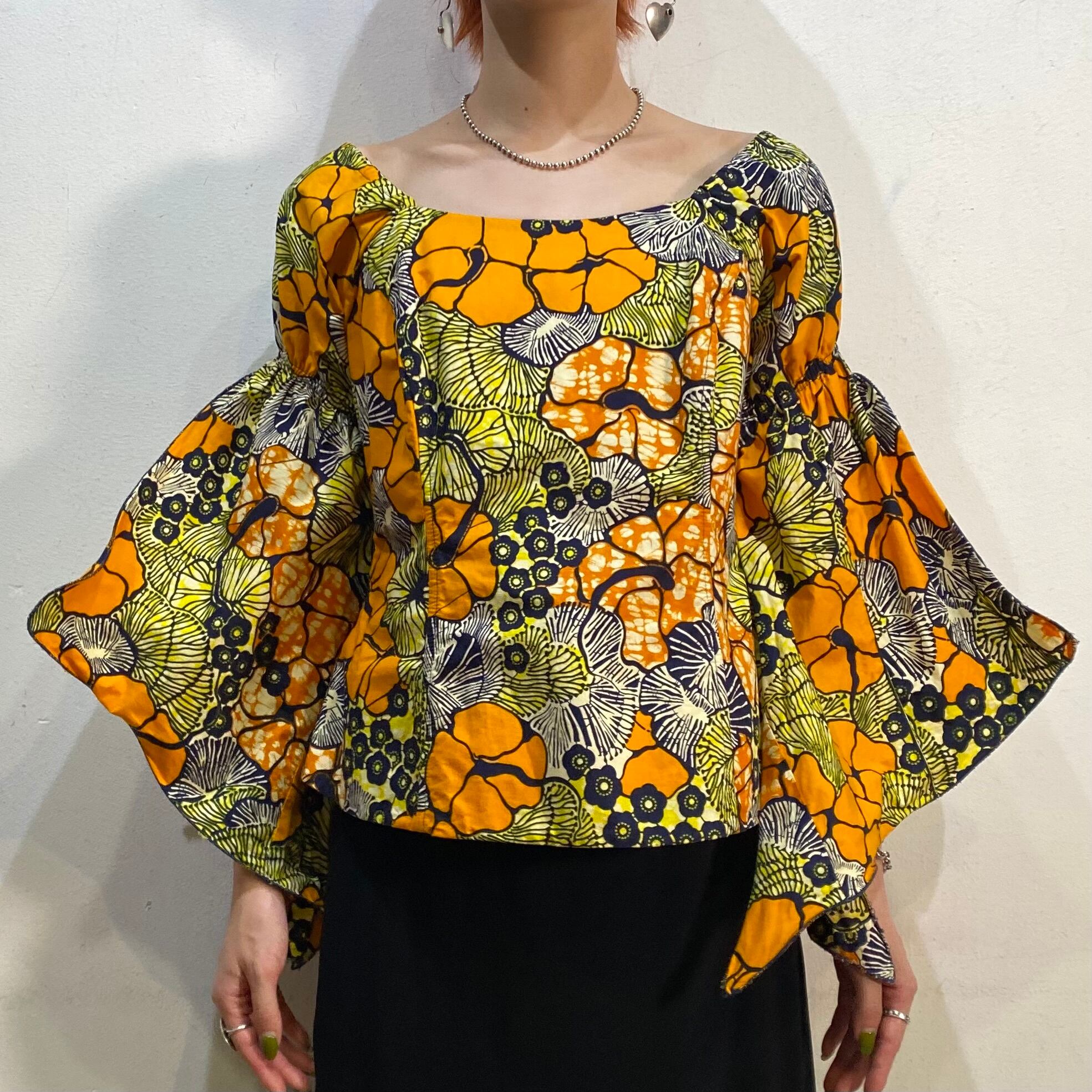 オレンジイエロー系の花柄の色合いにフレアスリーブのお袖がたまらなく可愛い、アフリカンバティックのトップスです。
