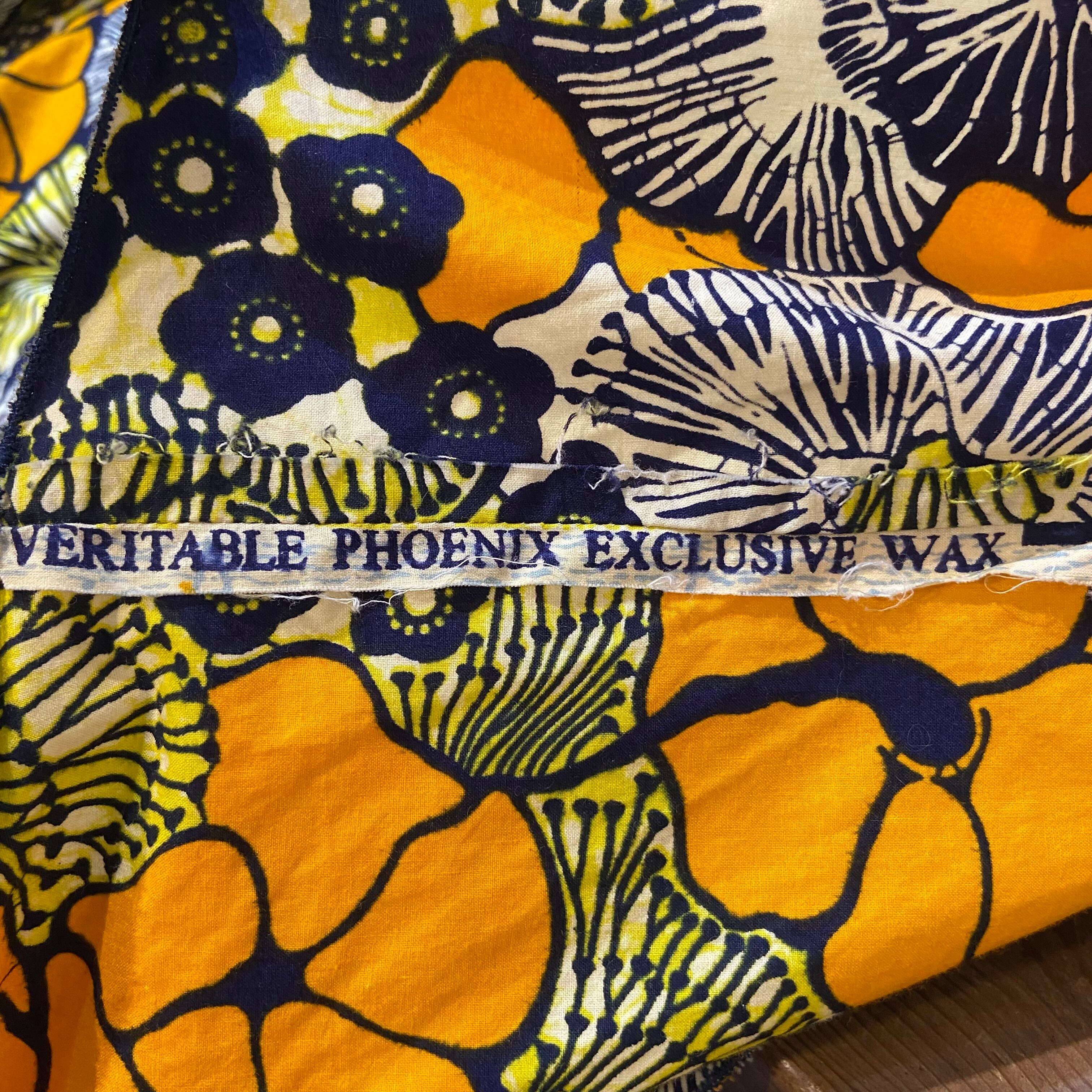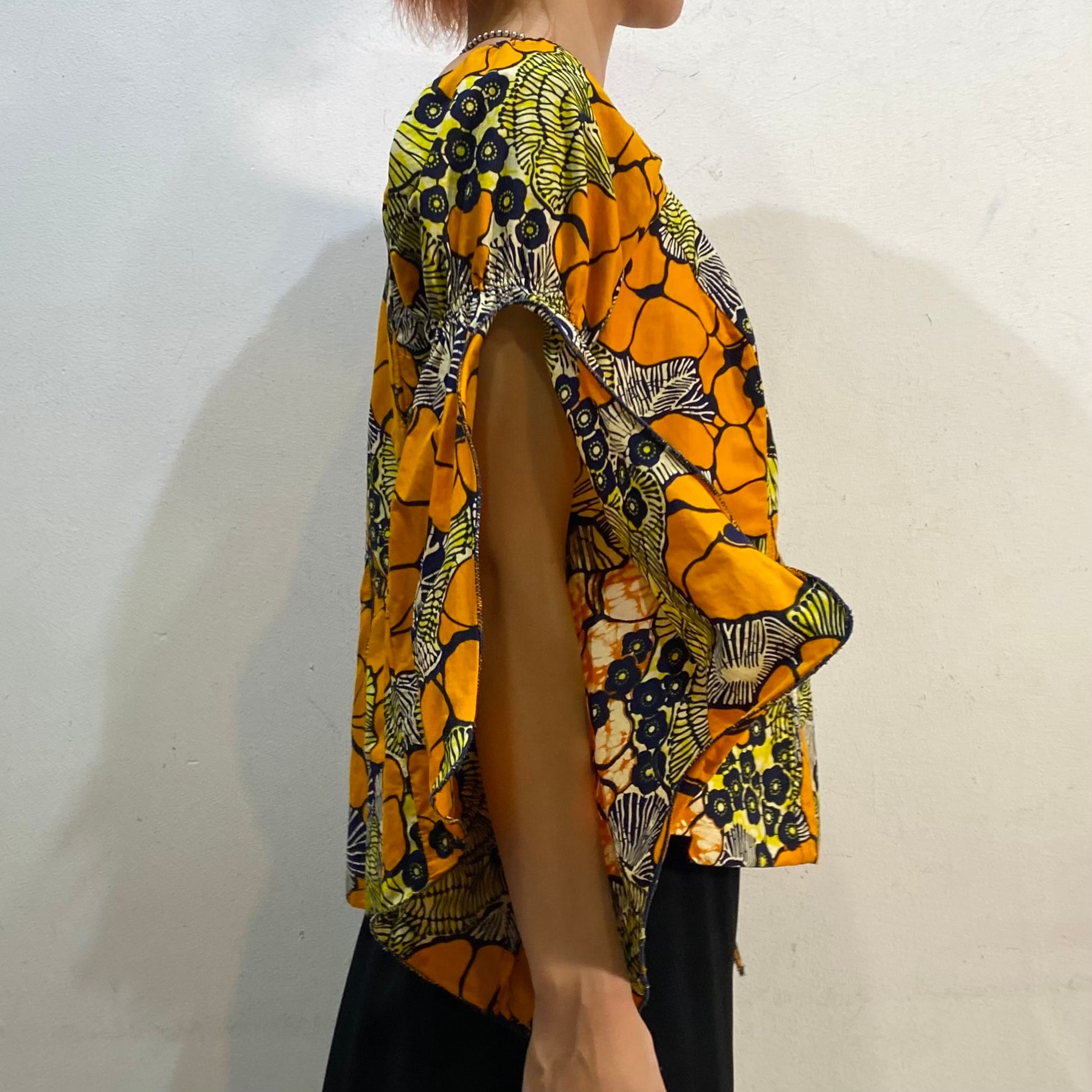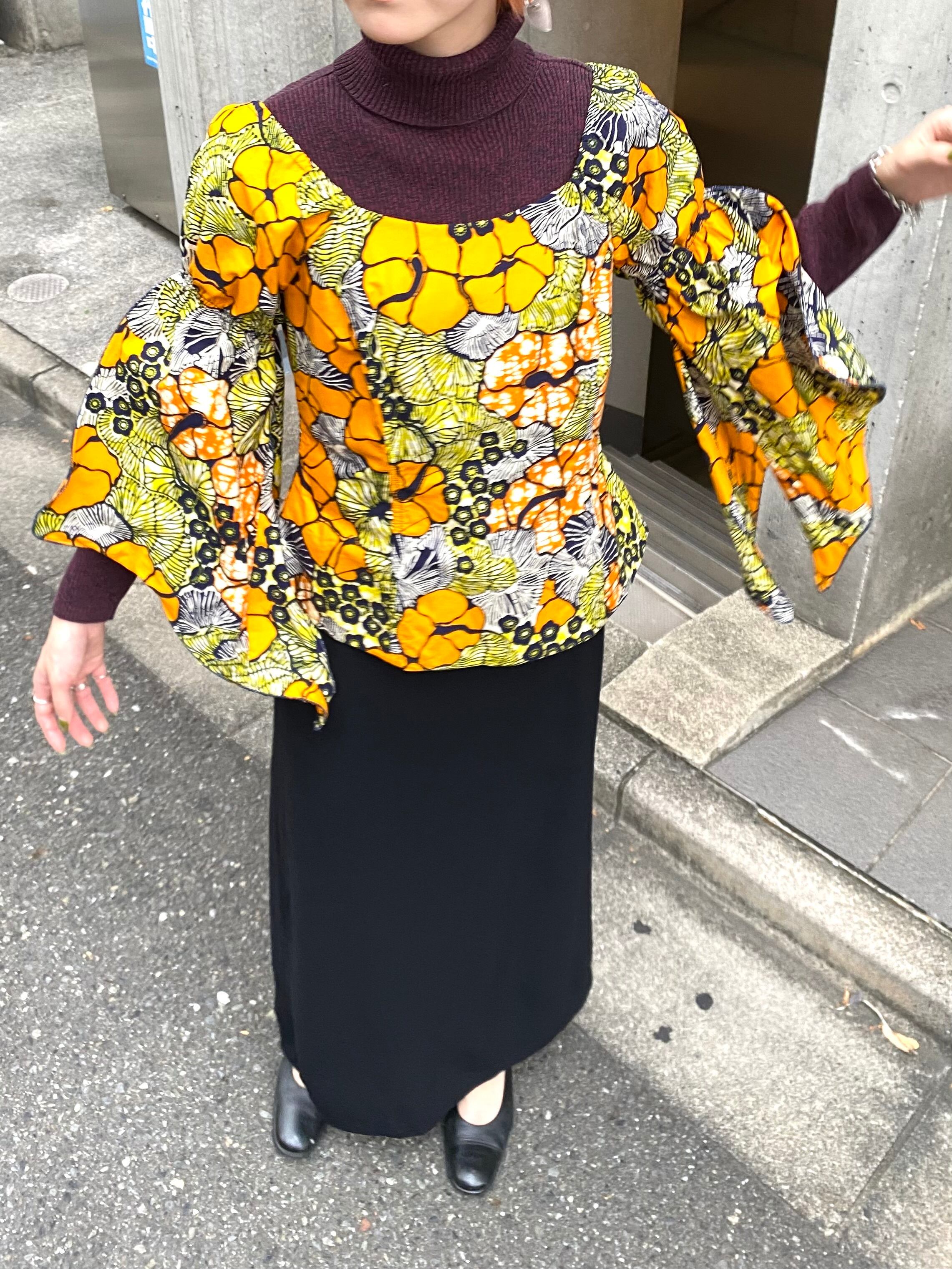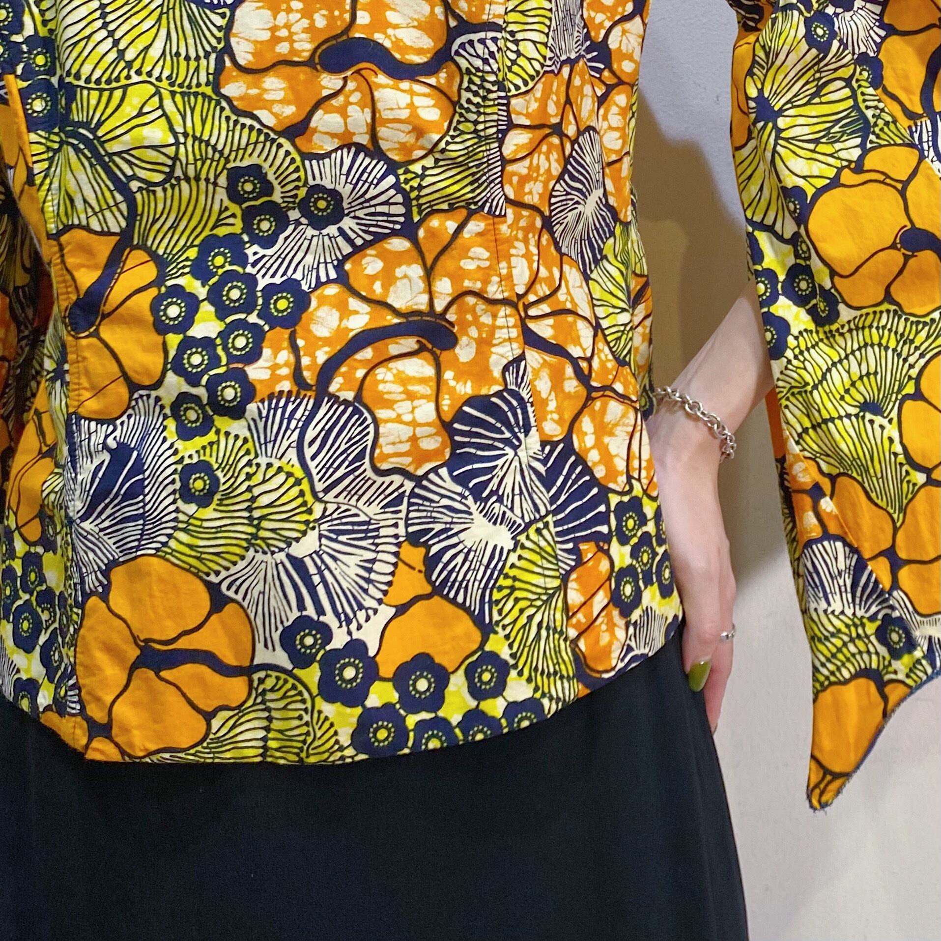 オレンジイエロー系の花柄の色合いにフレアスリーブのお袖がたまらなく可愛い、アフリカンバティックのトップスです。