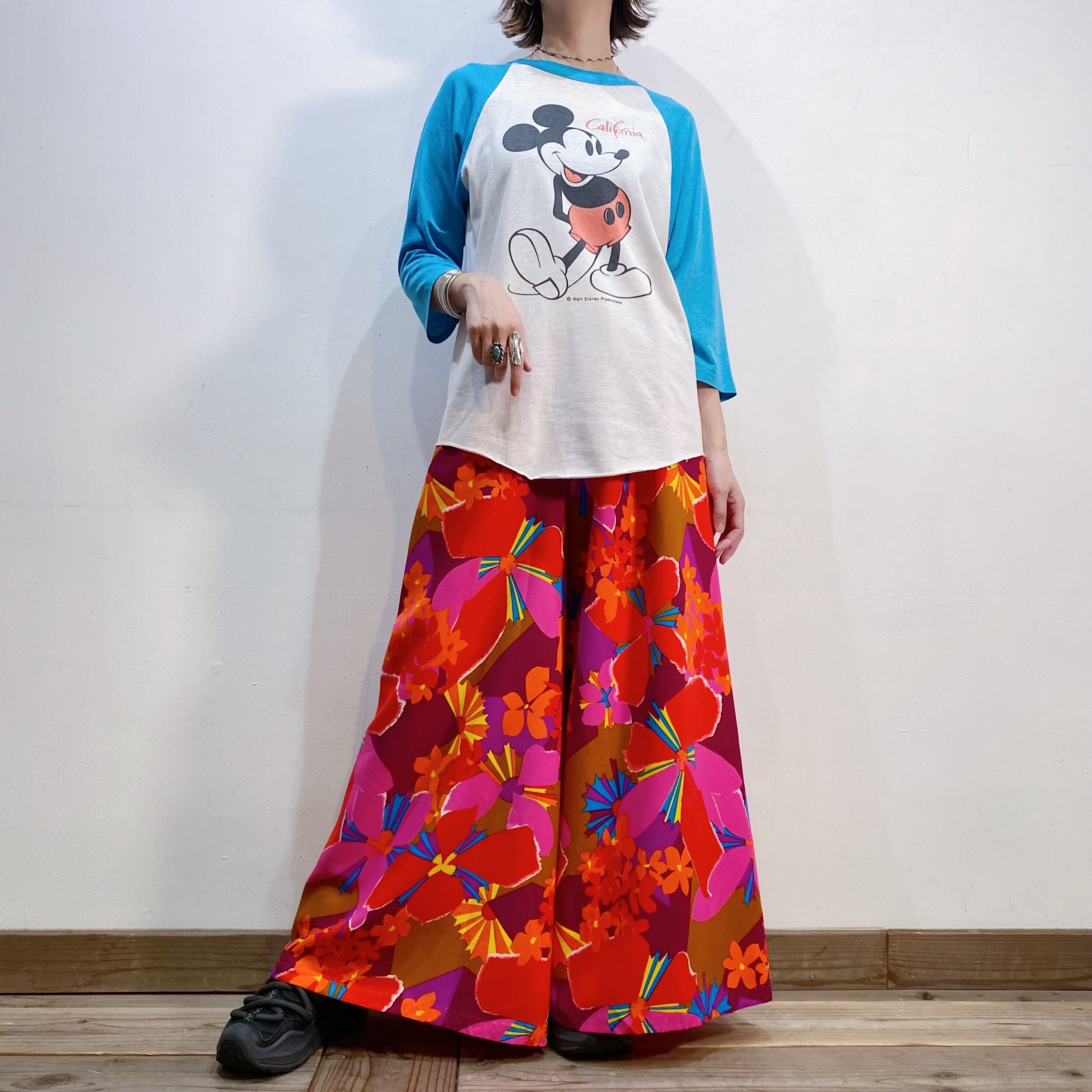 着用写真のようなヴィンテージの柄ボトムスとも相性良く着られますし、シンプルにデニムパンツと合わせても決まります。