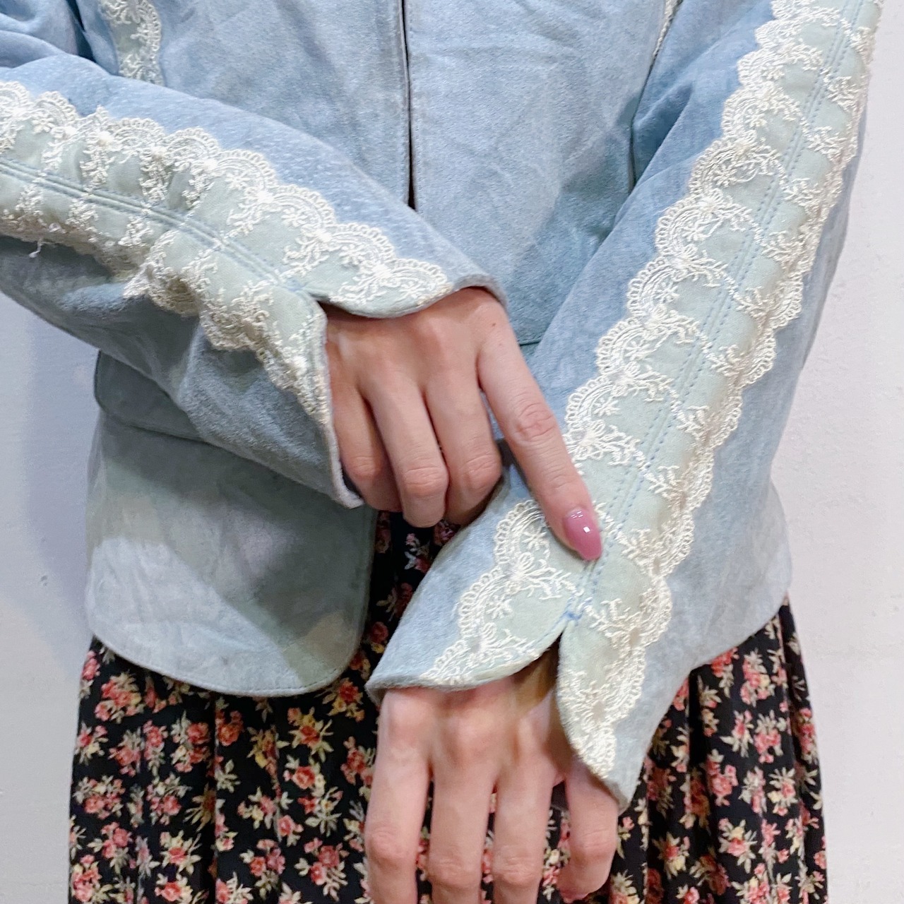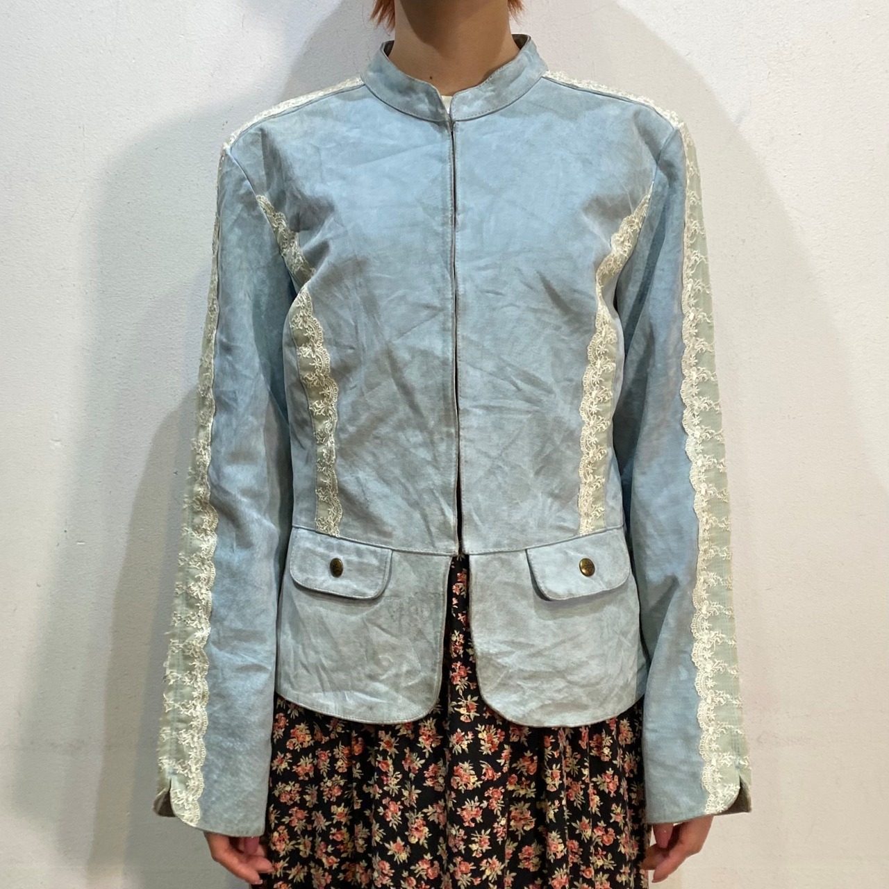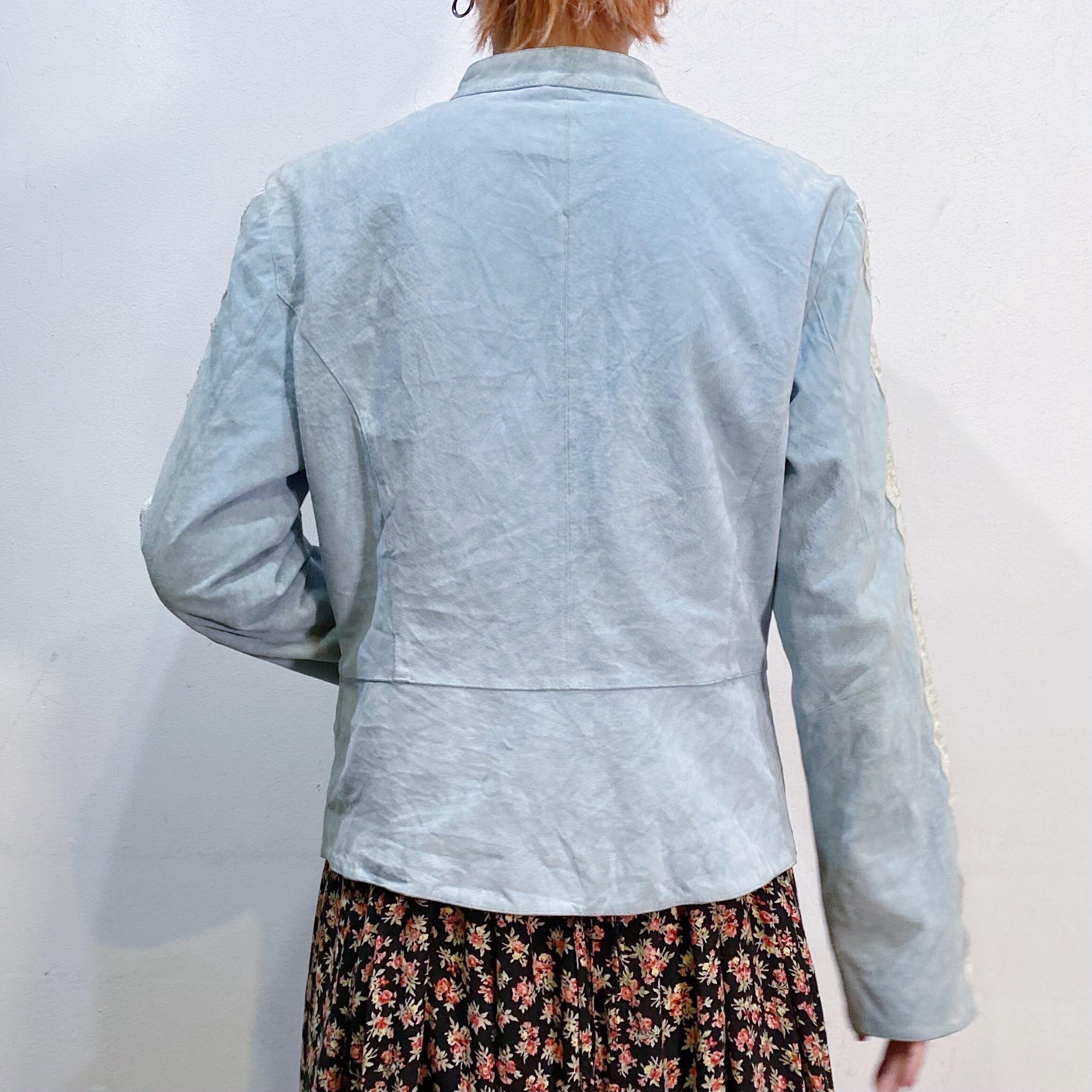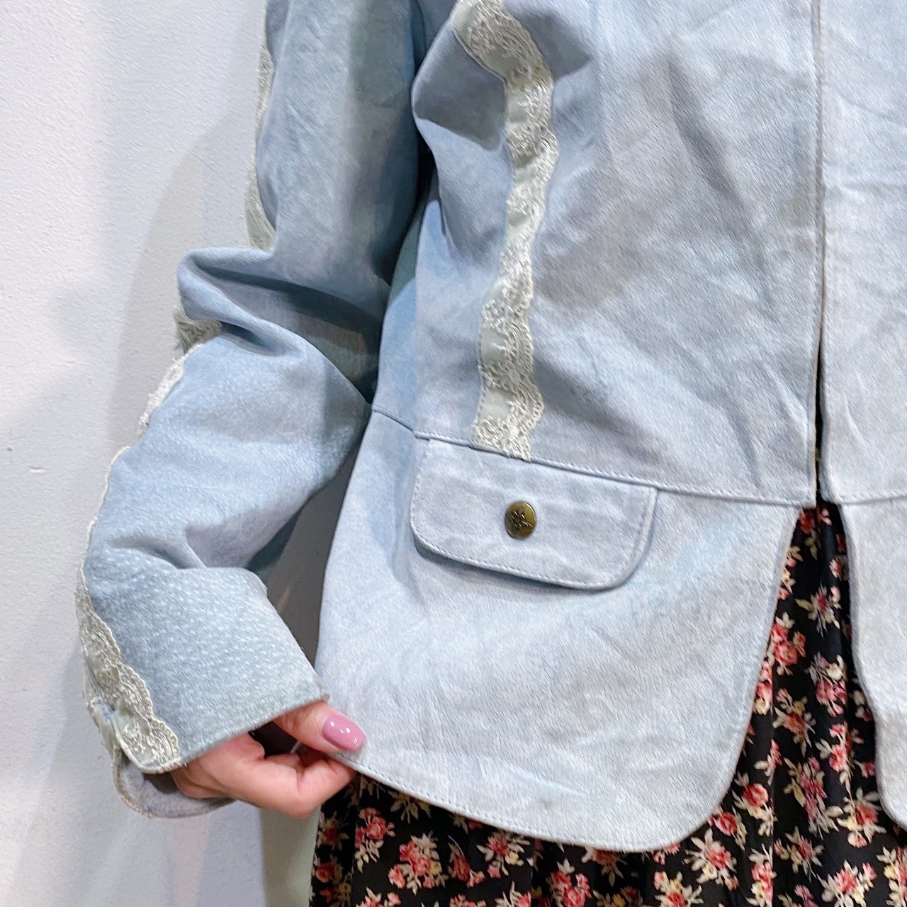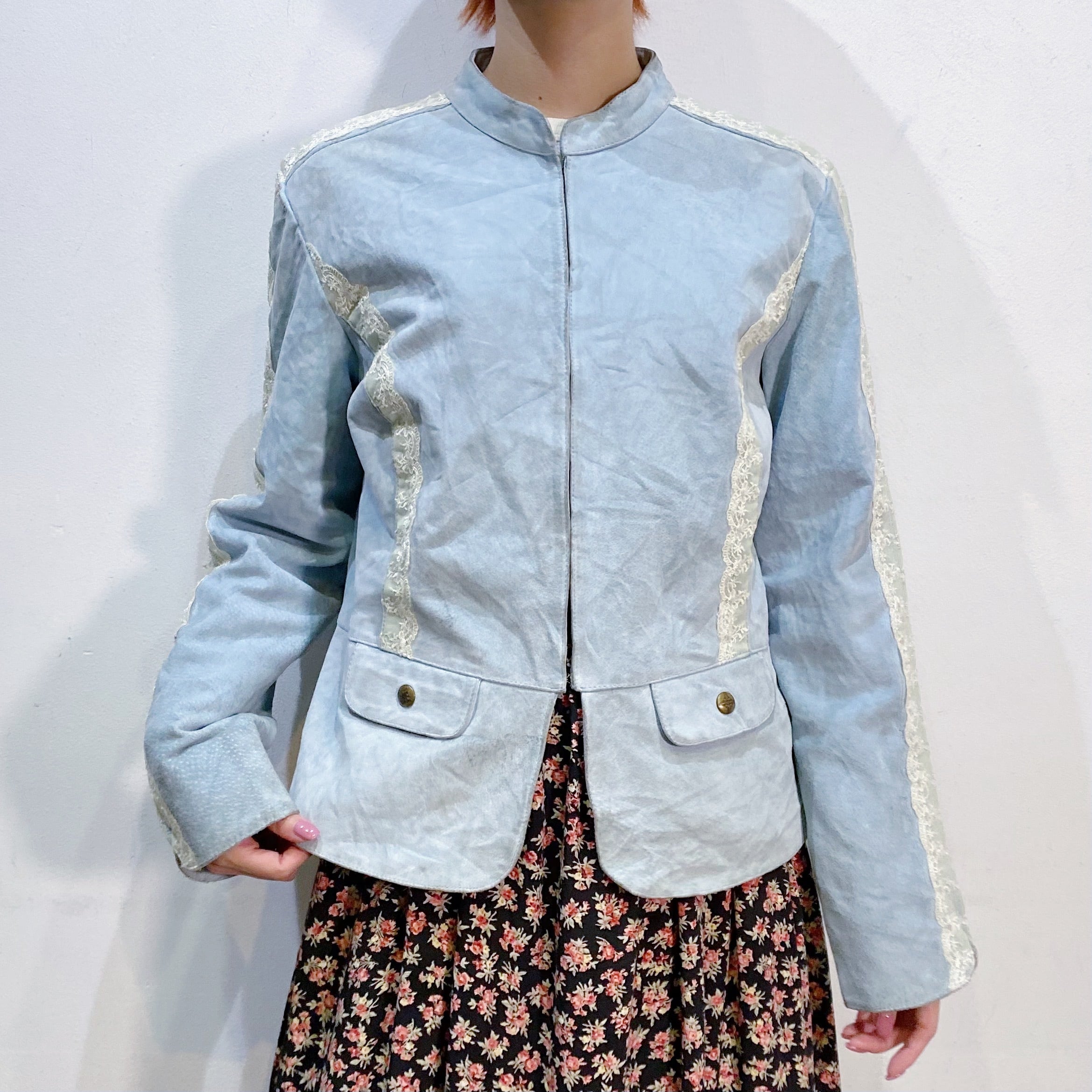 サックスブルー×レースのデザインが最高に可愛い、レザージャケットです。