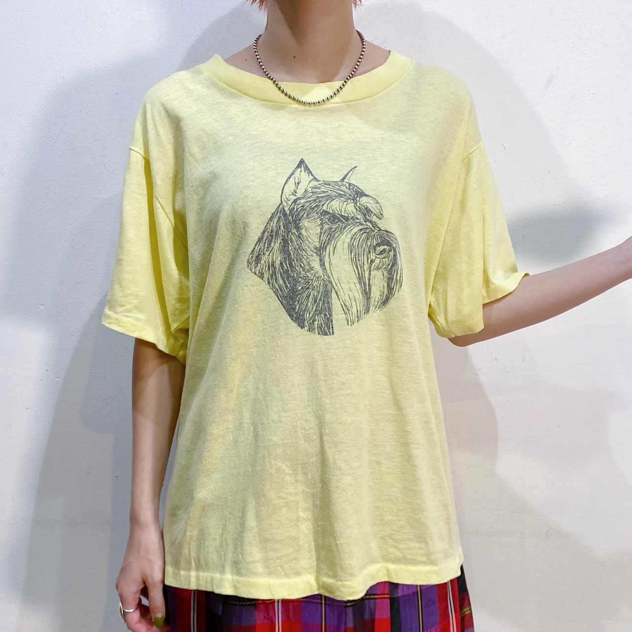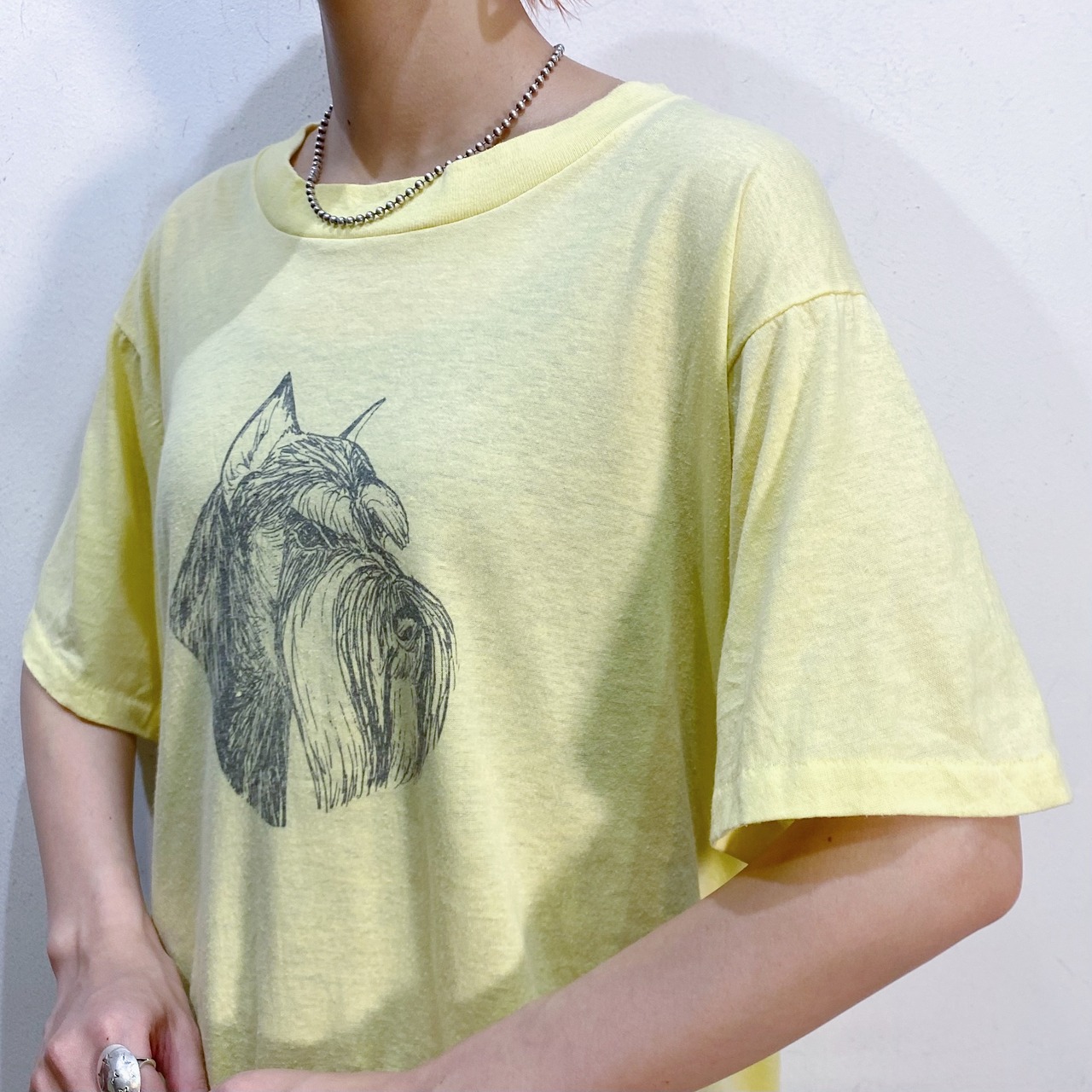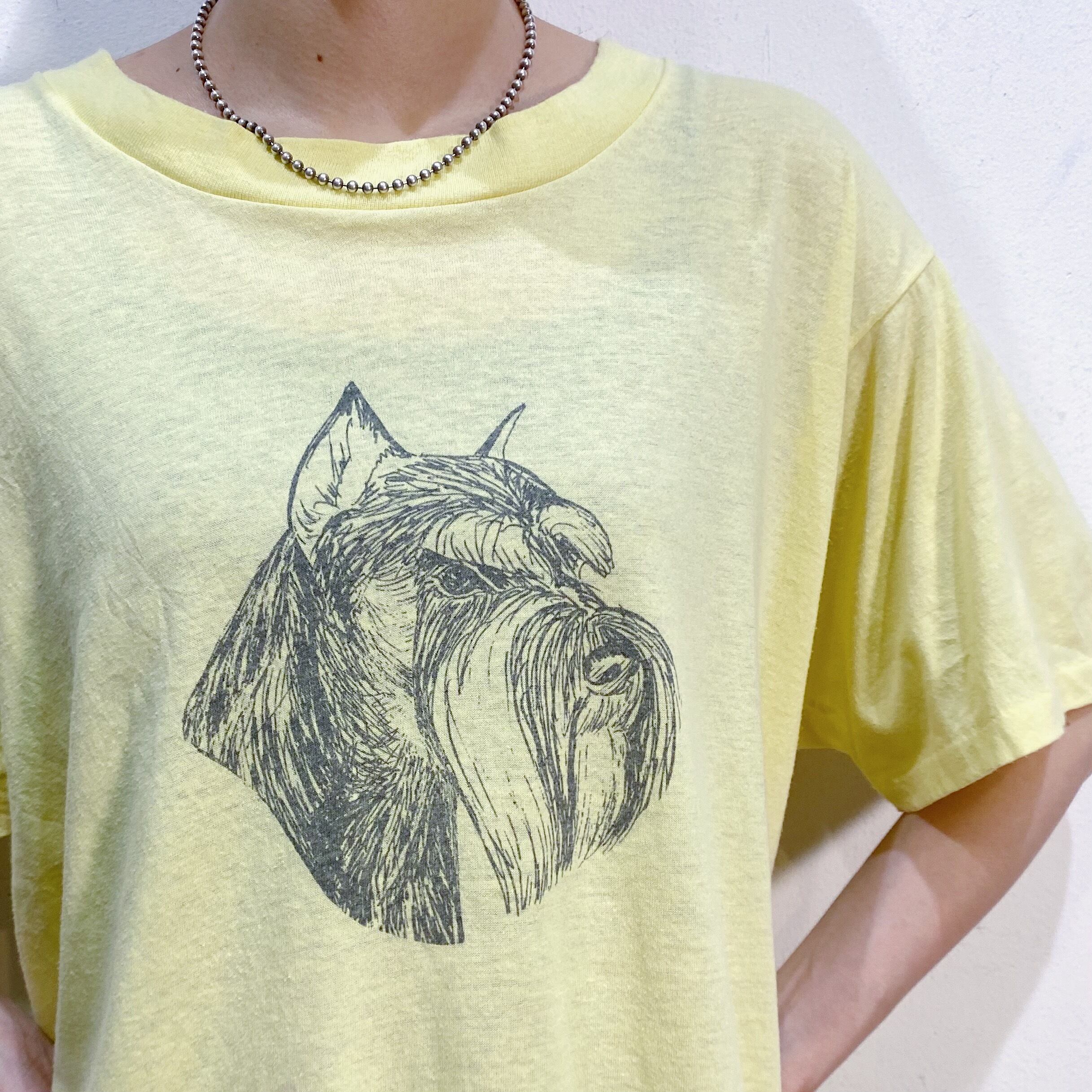 淡いイエローのボディにシュナウザーの顔がプリントされた、80年代のTシャツです。