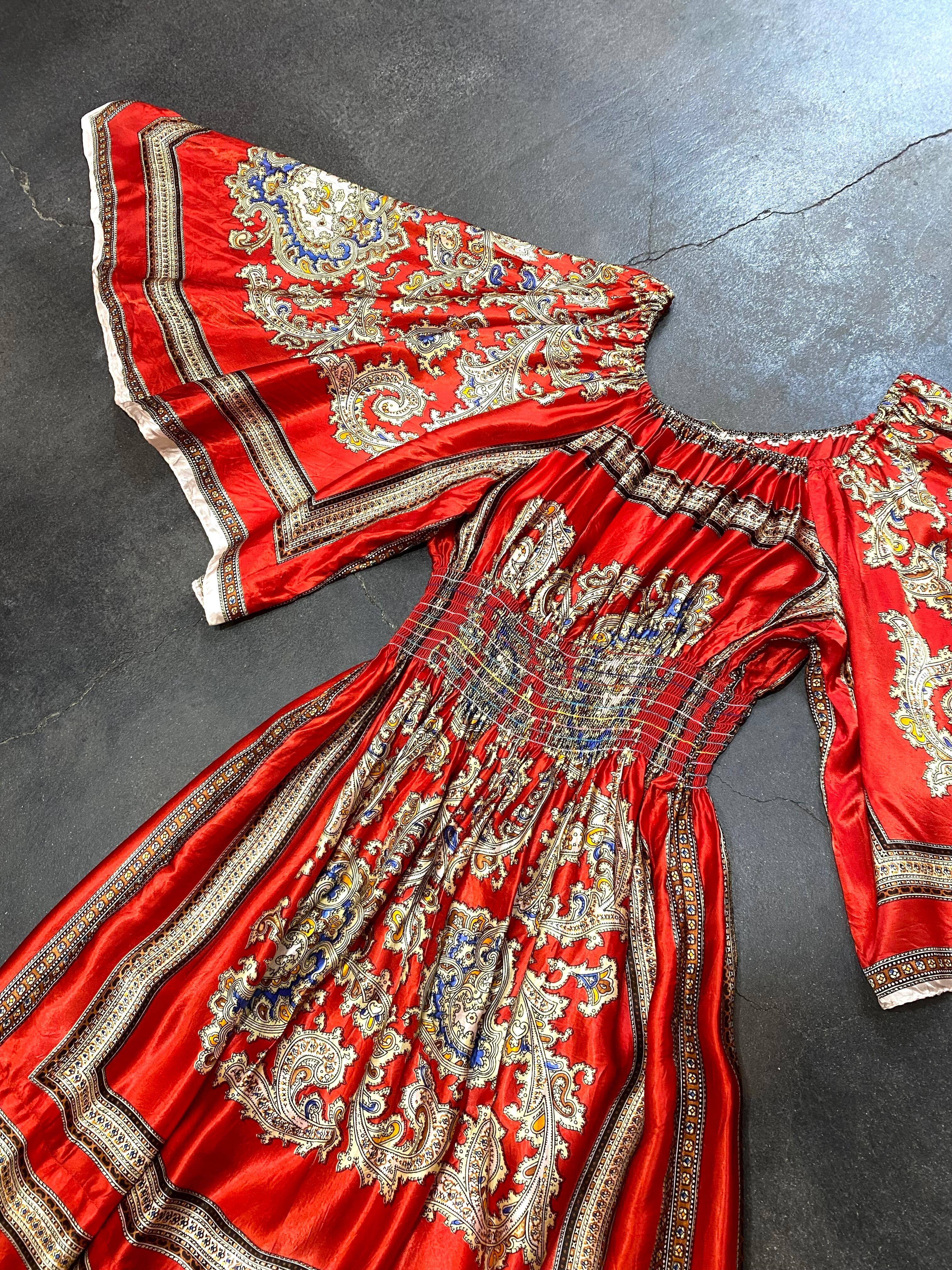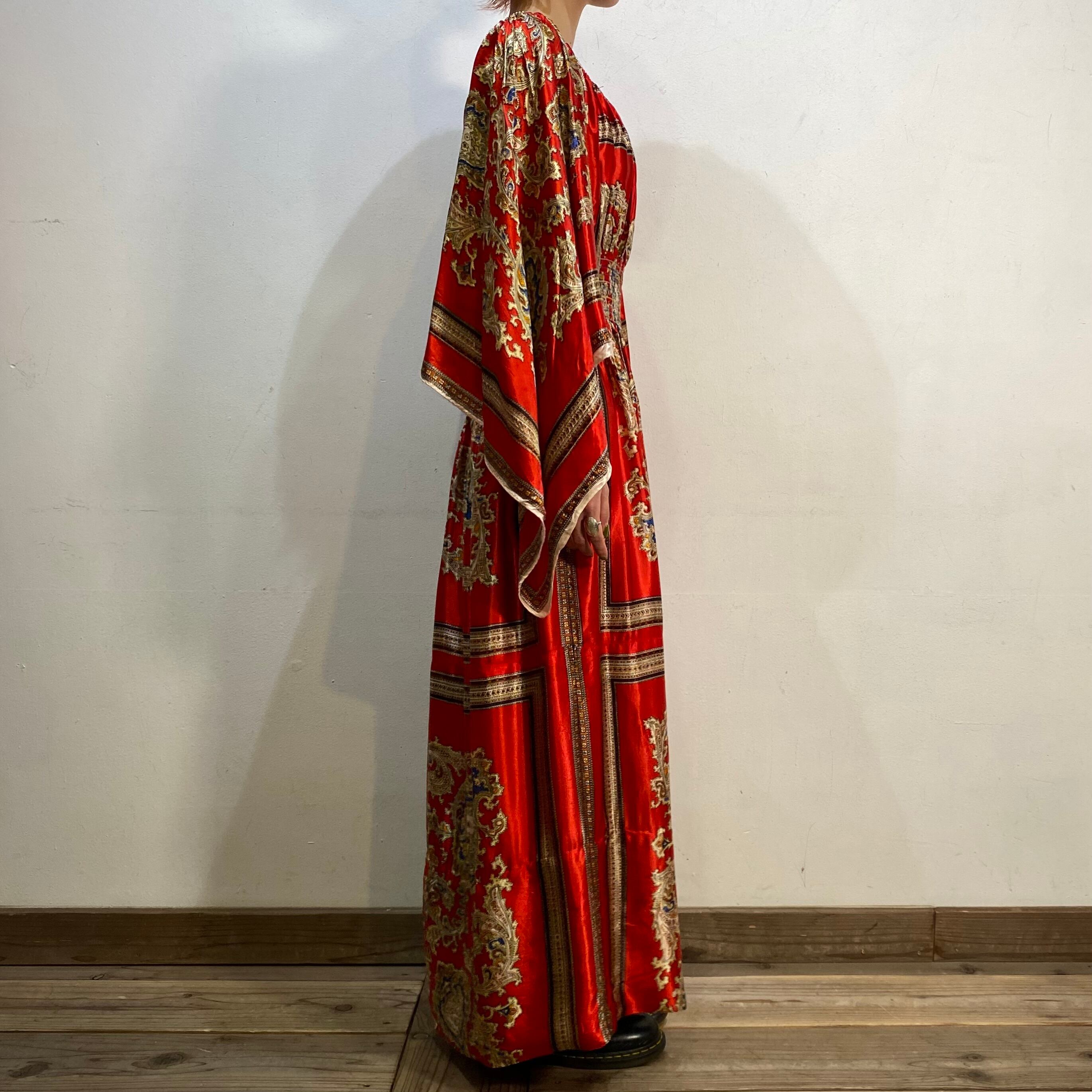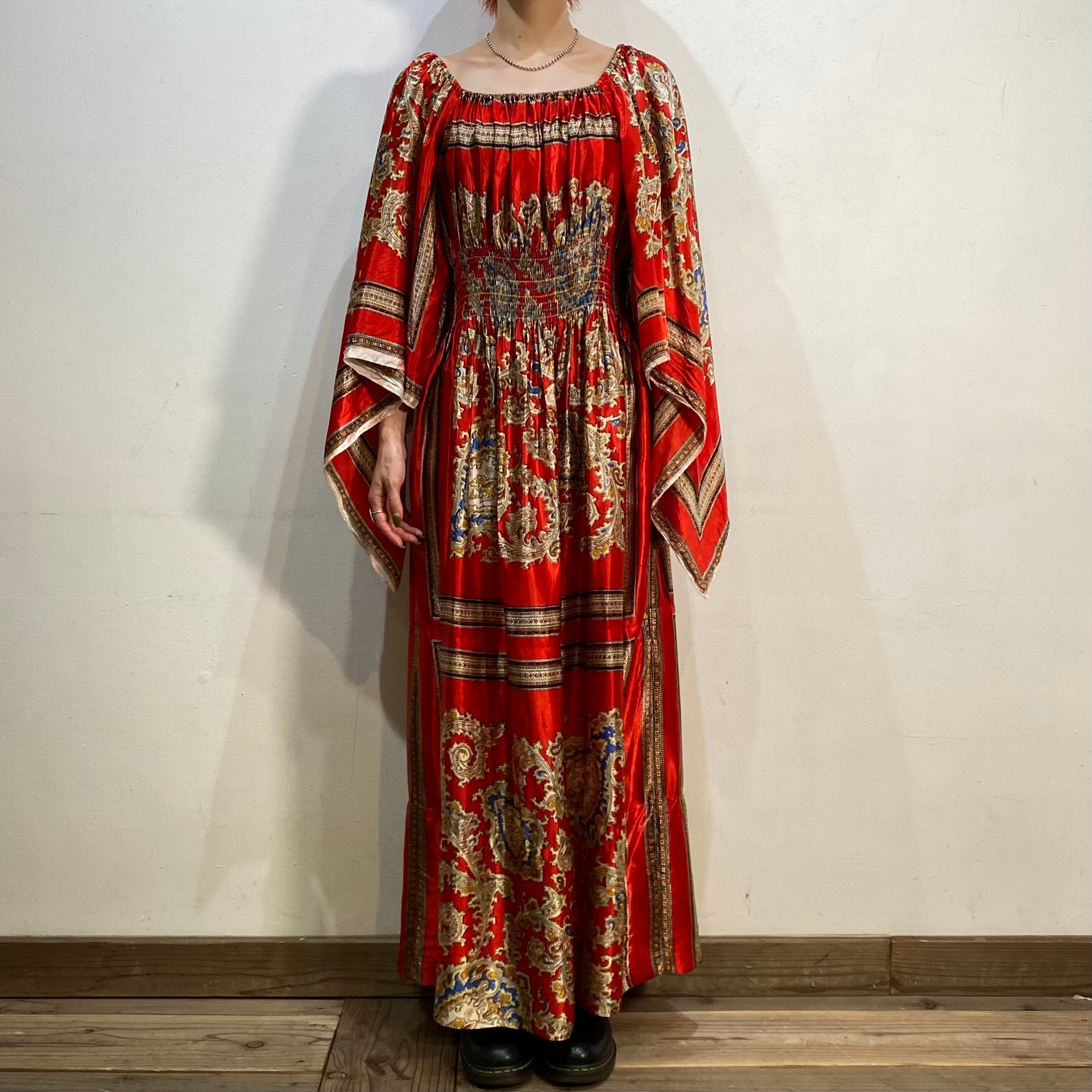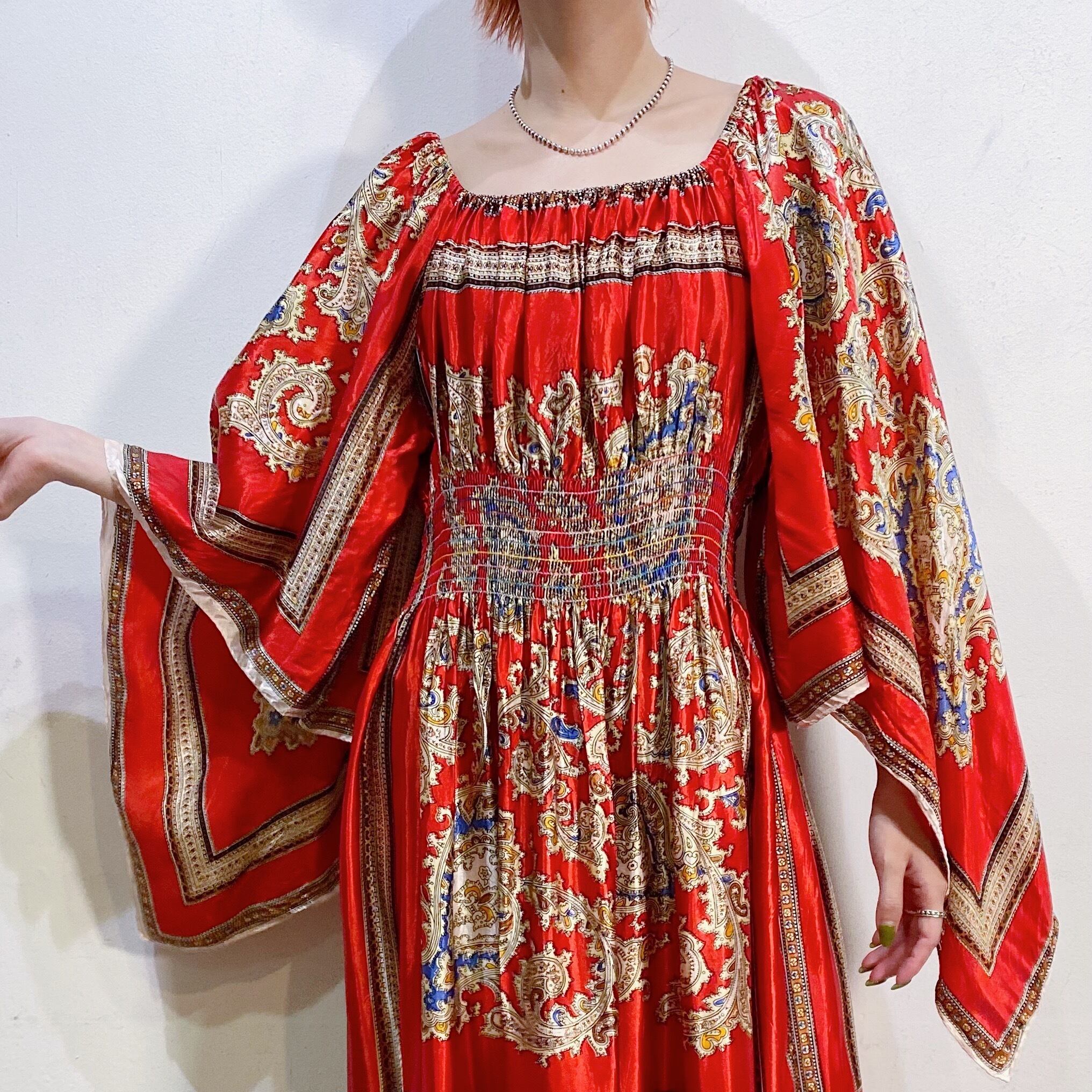 スカーフのような生地を用いて作られた70年代のスペシャルなロングワンピースです。