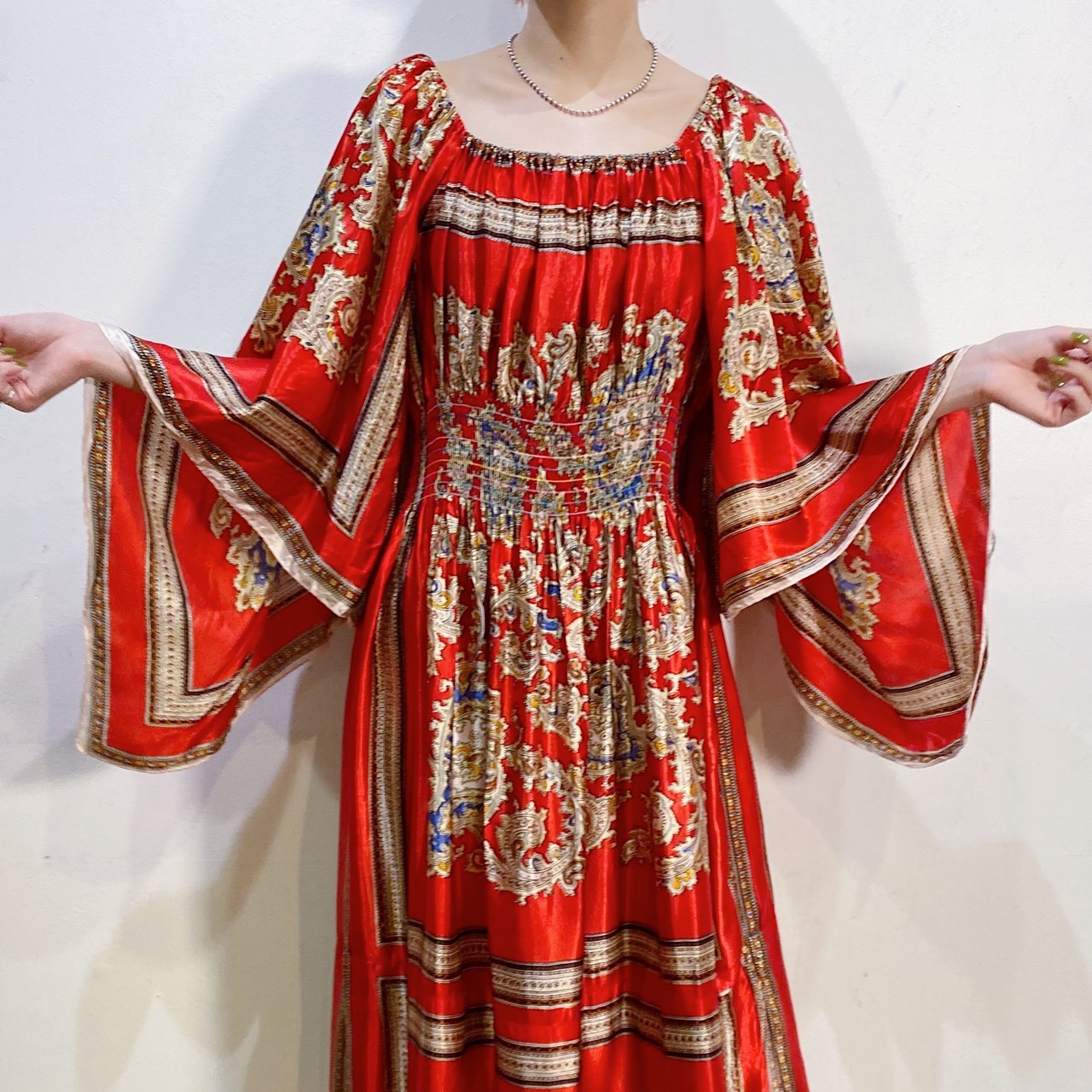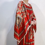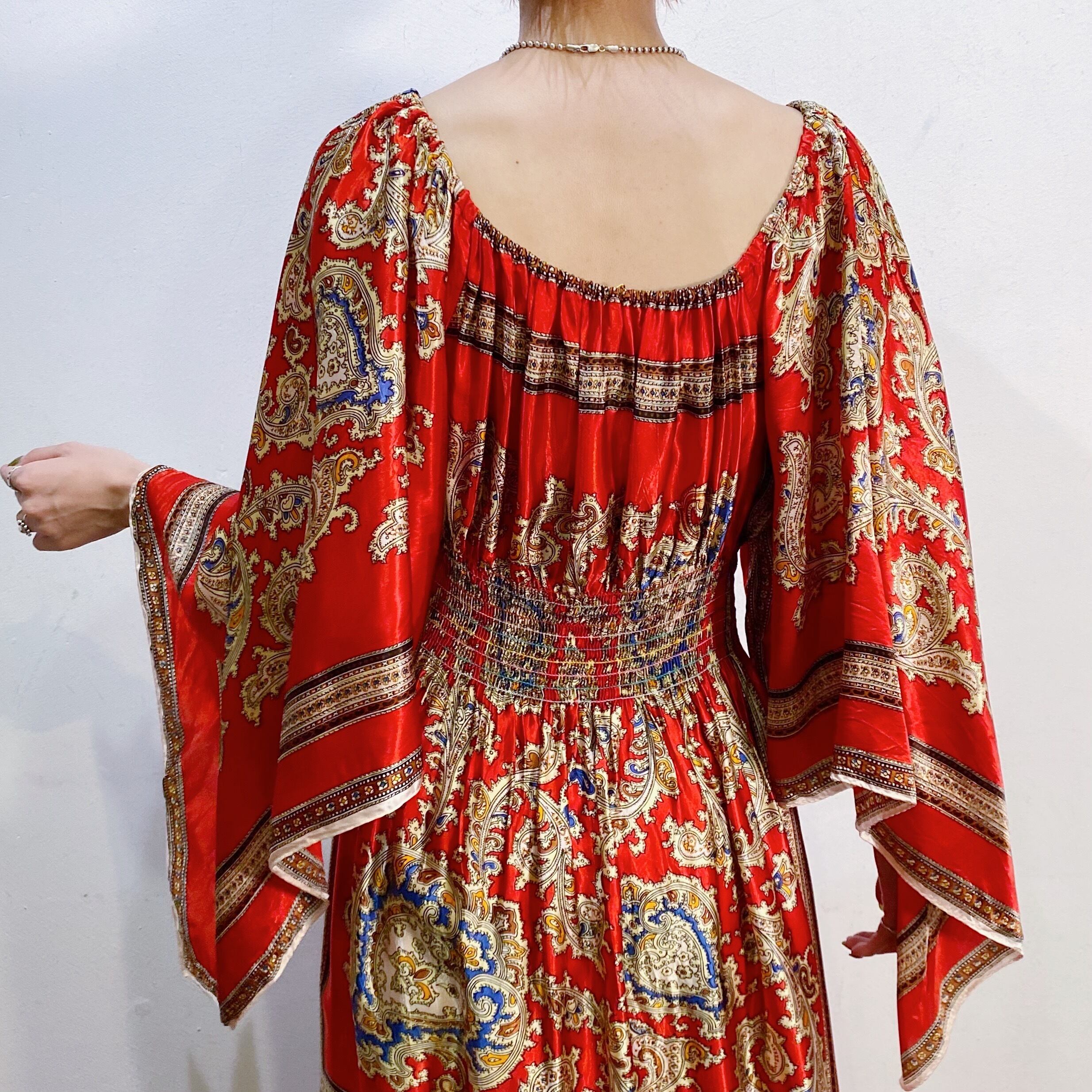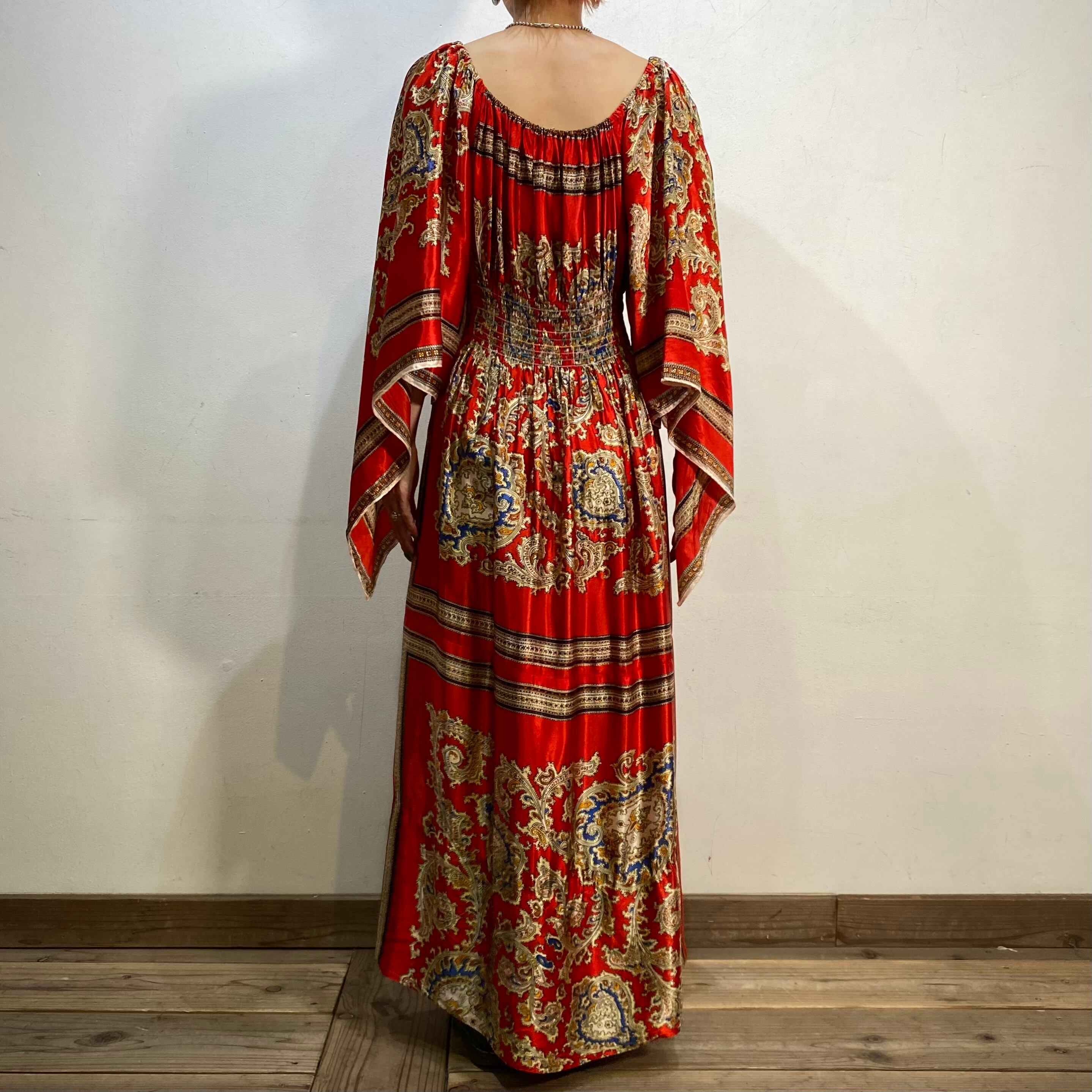 スカーフのような生地を用いて作られた70年代のスペシャルなロングワンピースです。