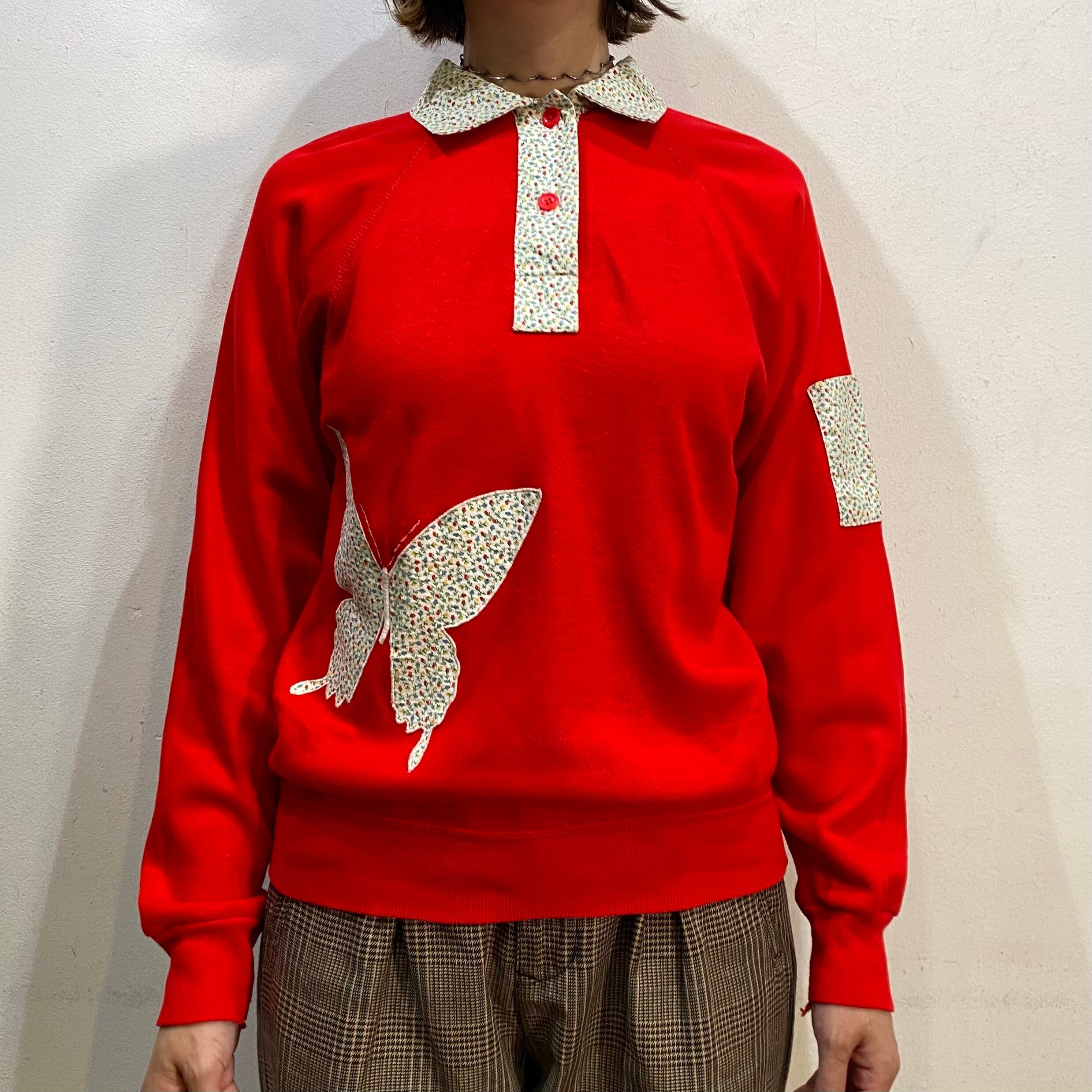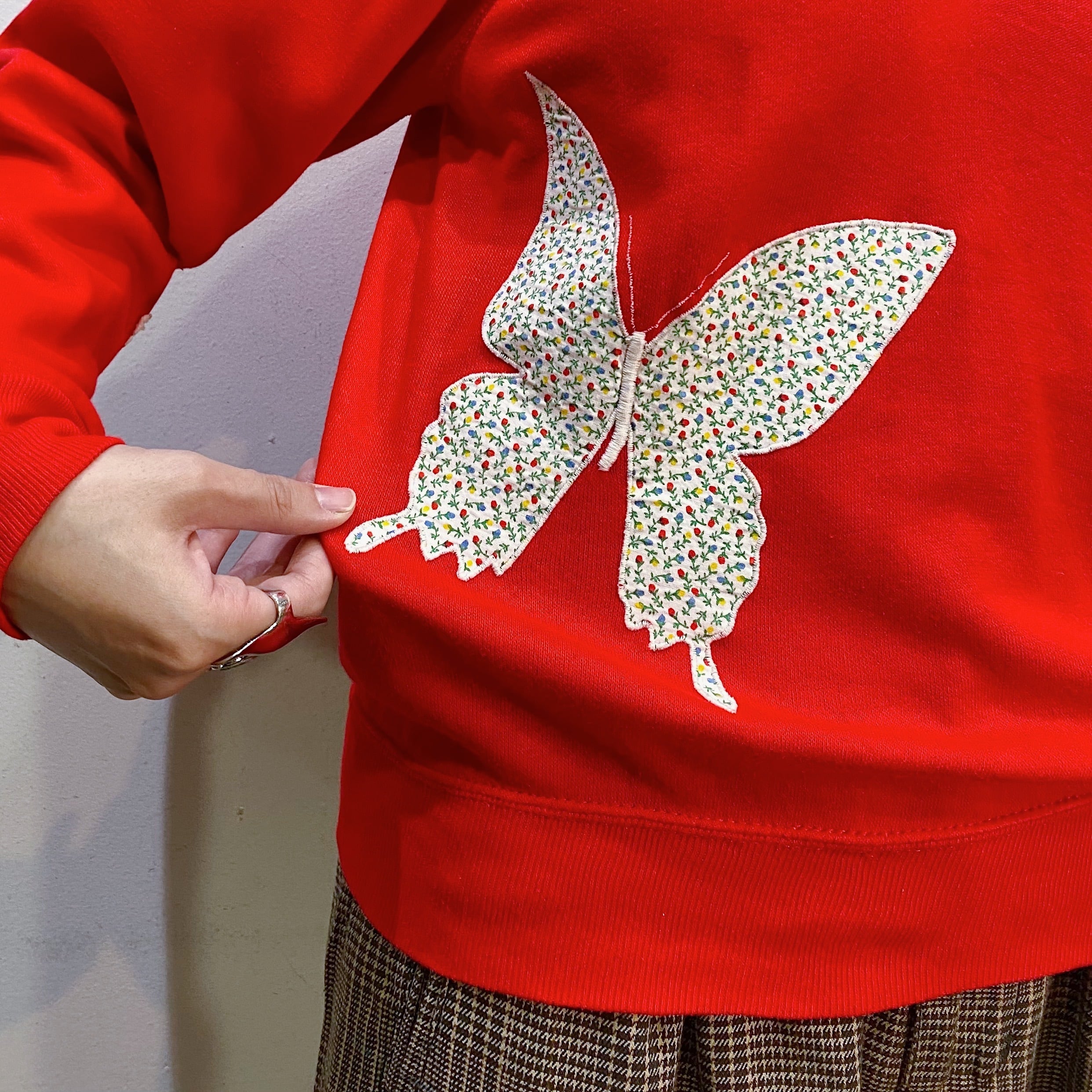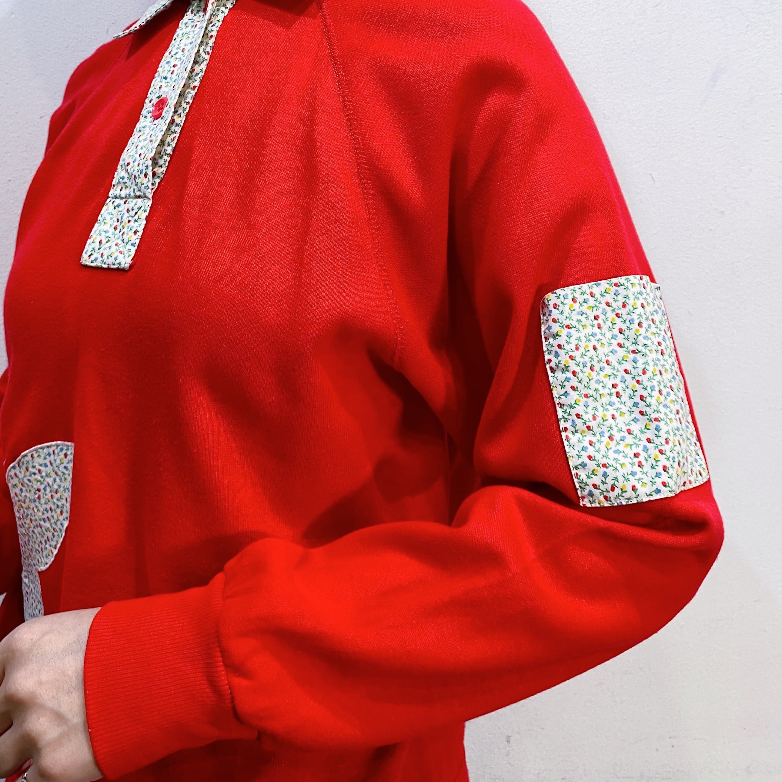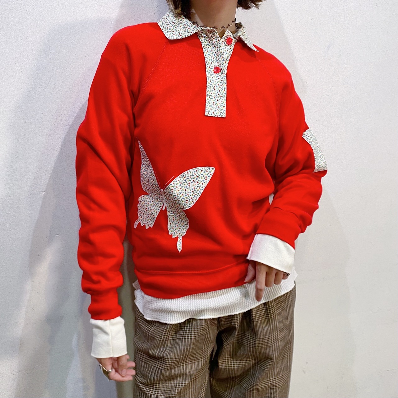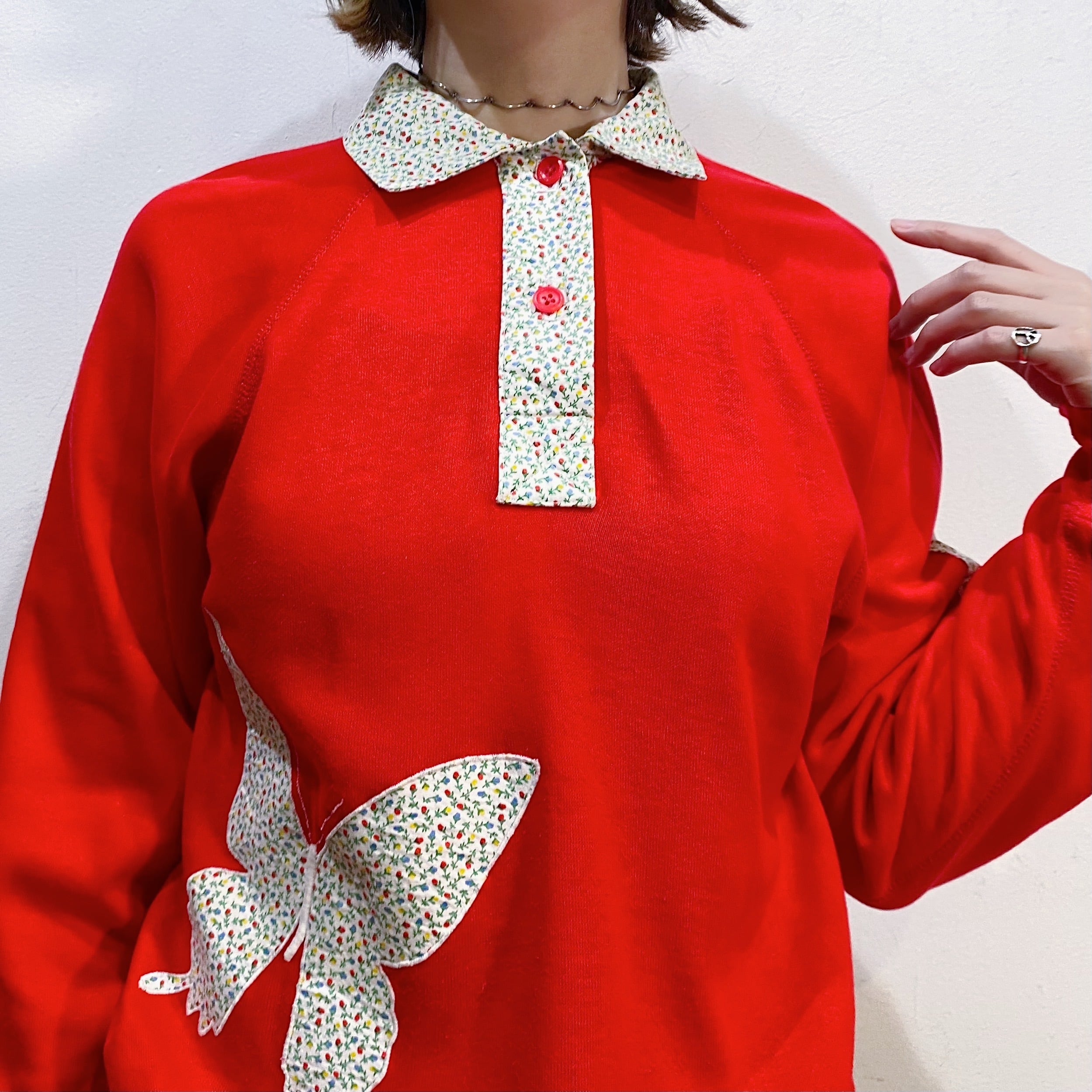 パッキリとした赤に70年代らしい小花柄の襟やポケット、蝶々のアップリケが可愛いスウェットシャツです。