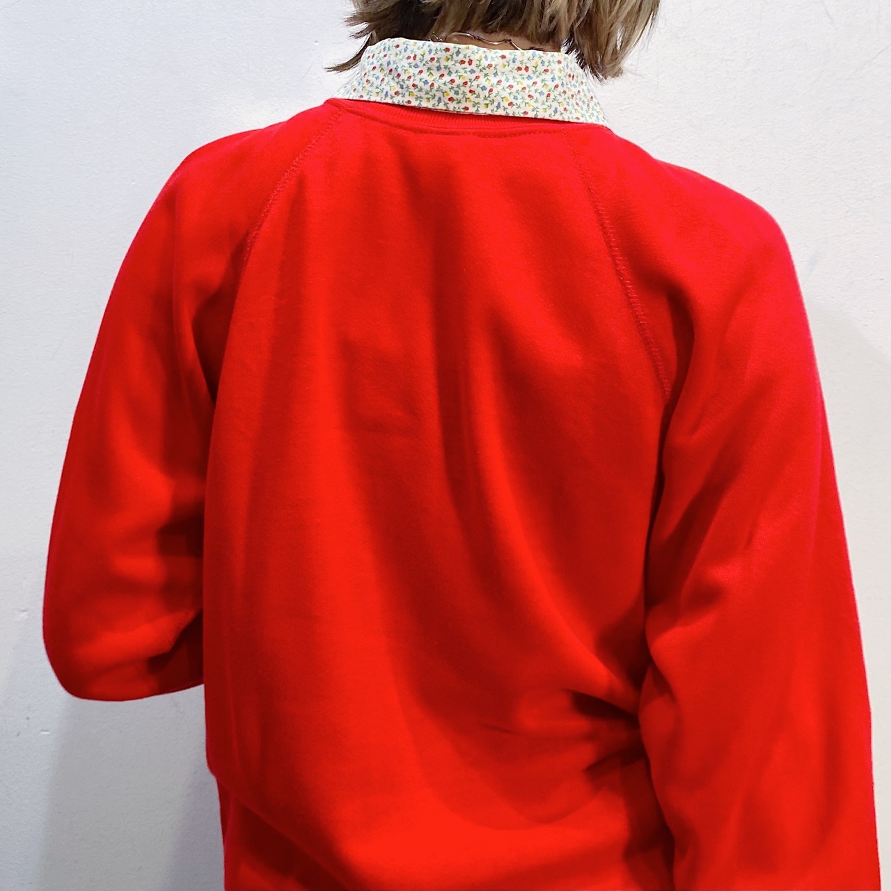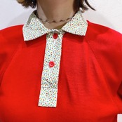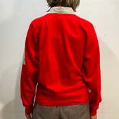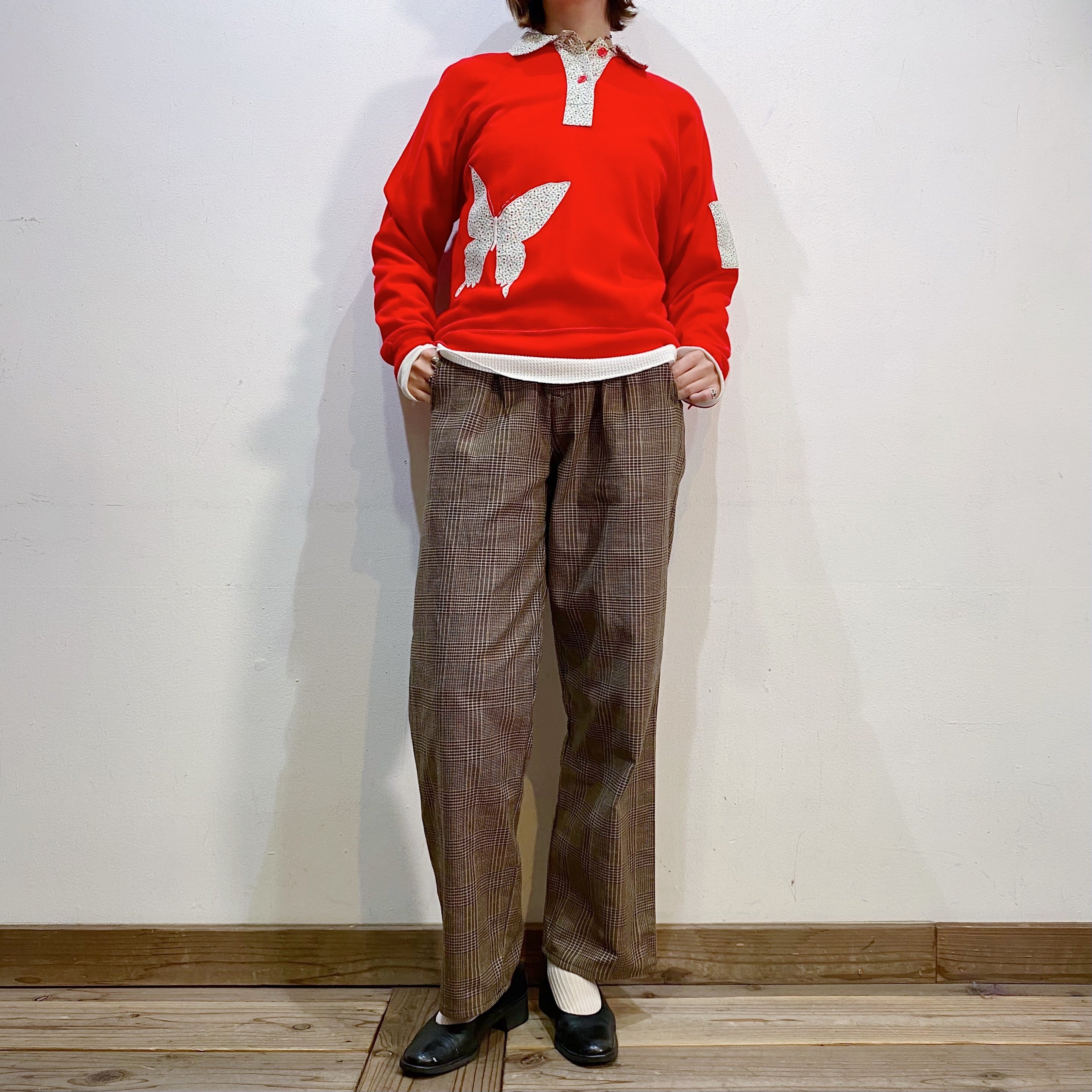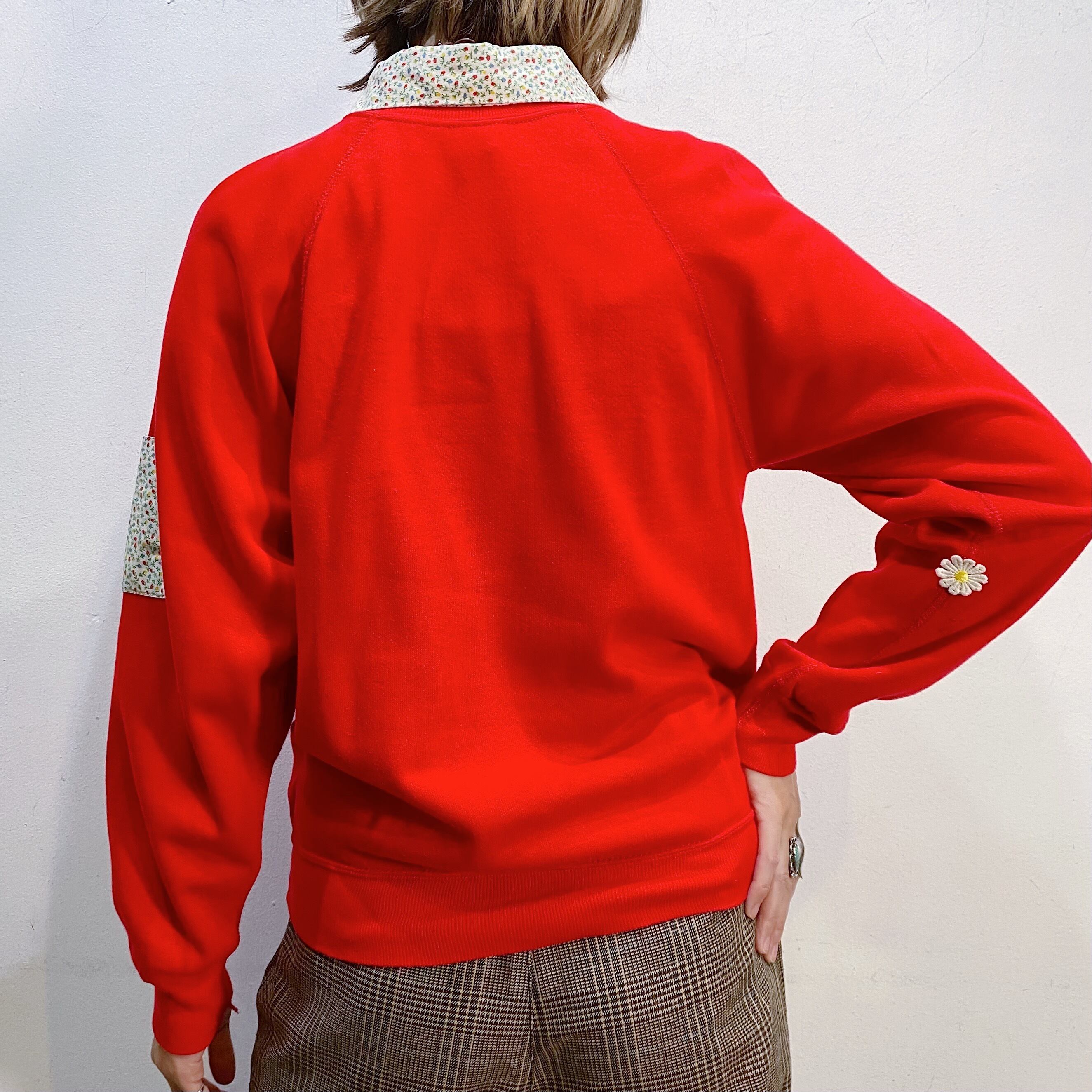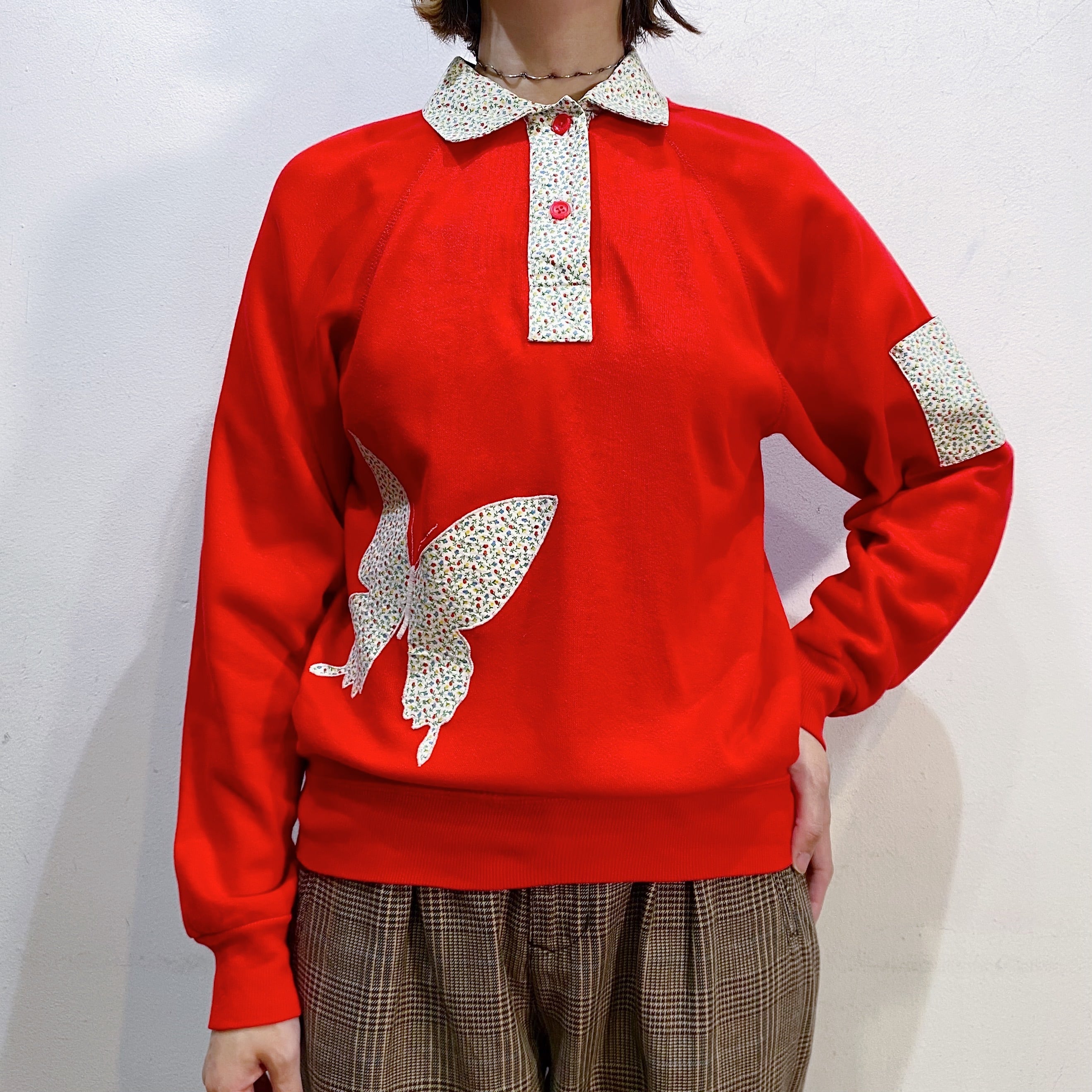 パッキリとした赤に70年代らしい小花柄の襟やポケット、蝶々のアップリケが可愛いスウェットシャツです。
