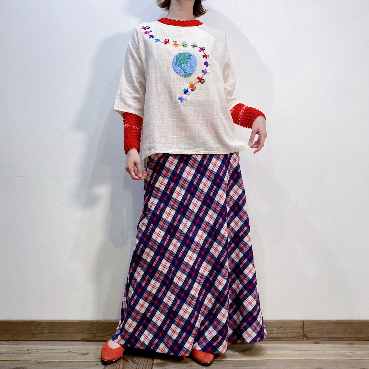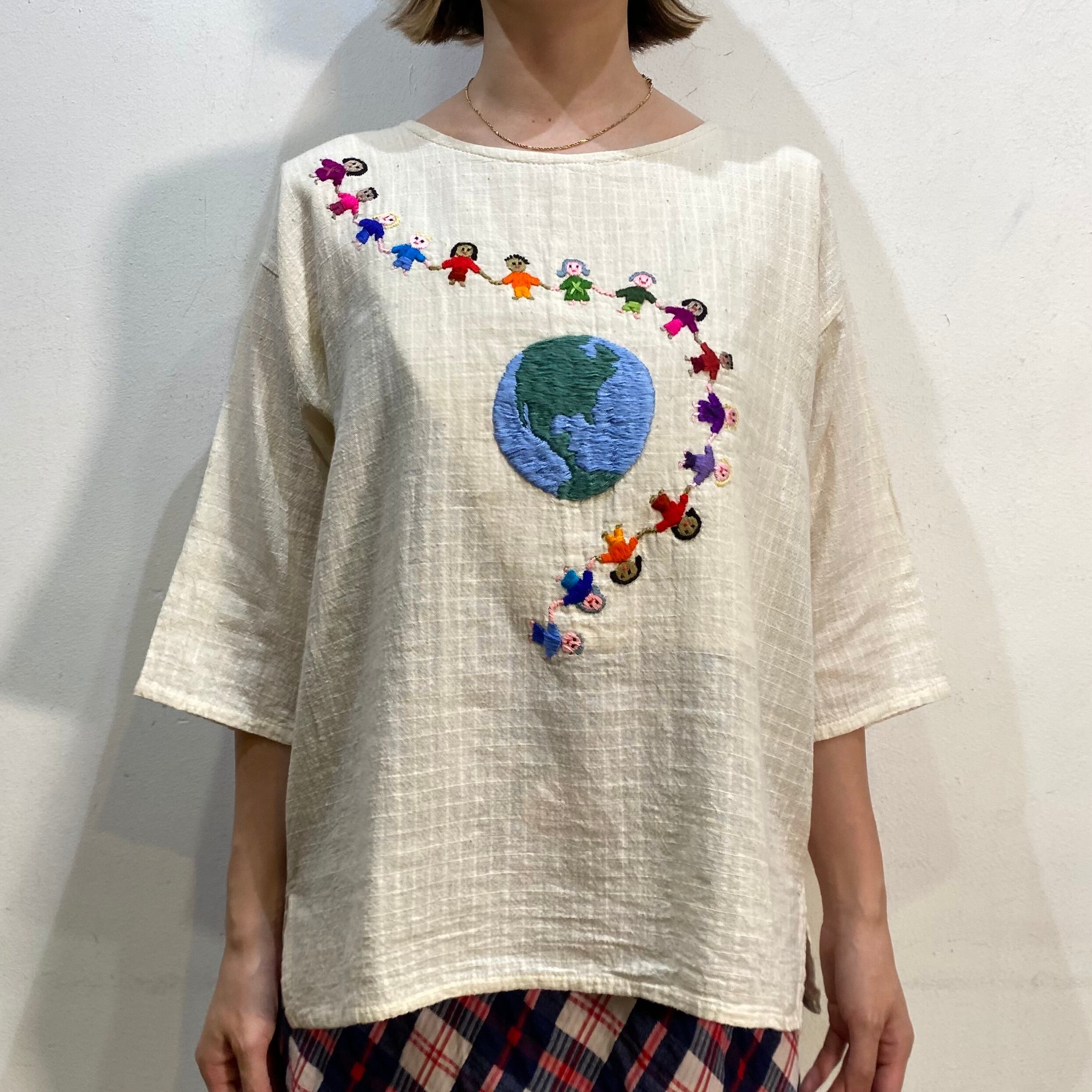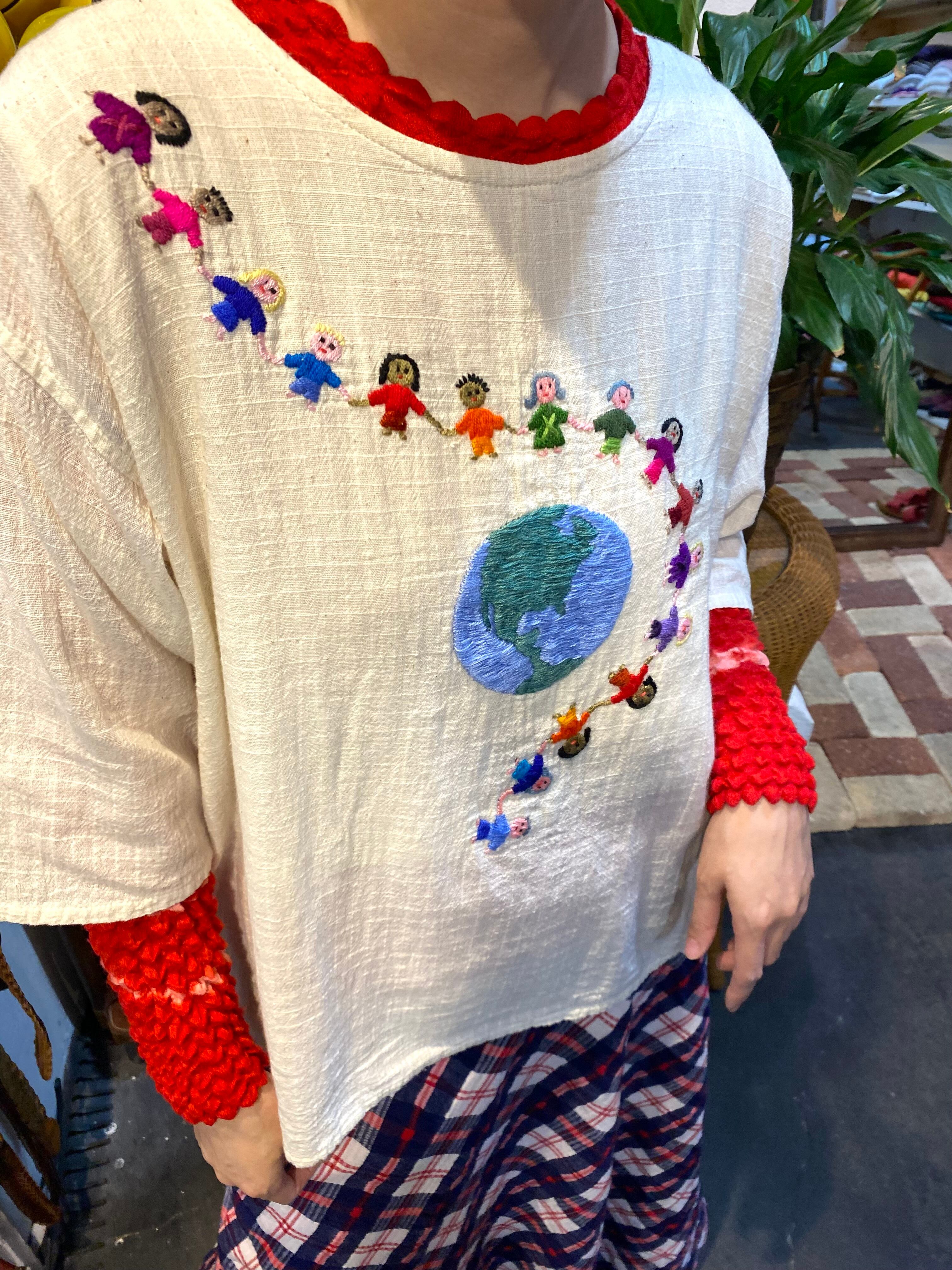 地球の周りを色々な人種の人たちが手を繋いで取り囲んだ、とってもピースフルなメッセージのトップスです。
